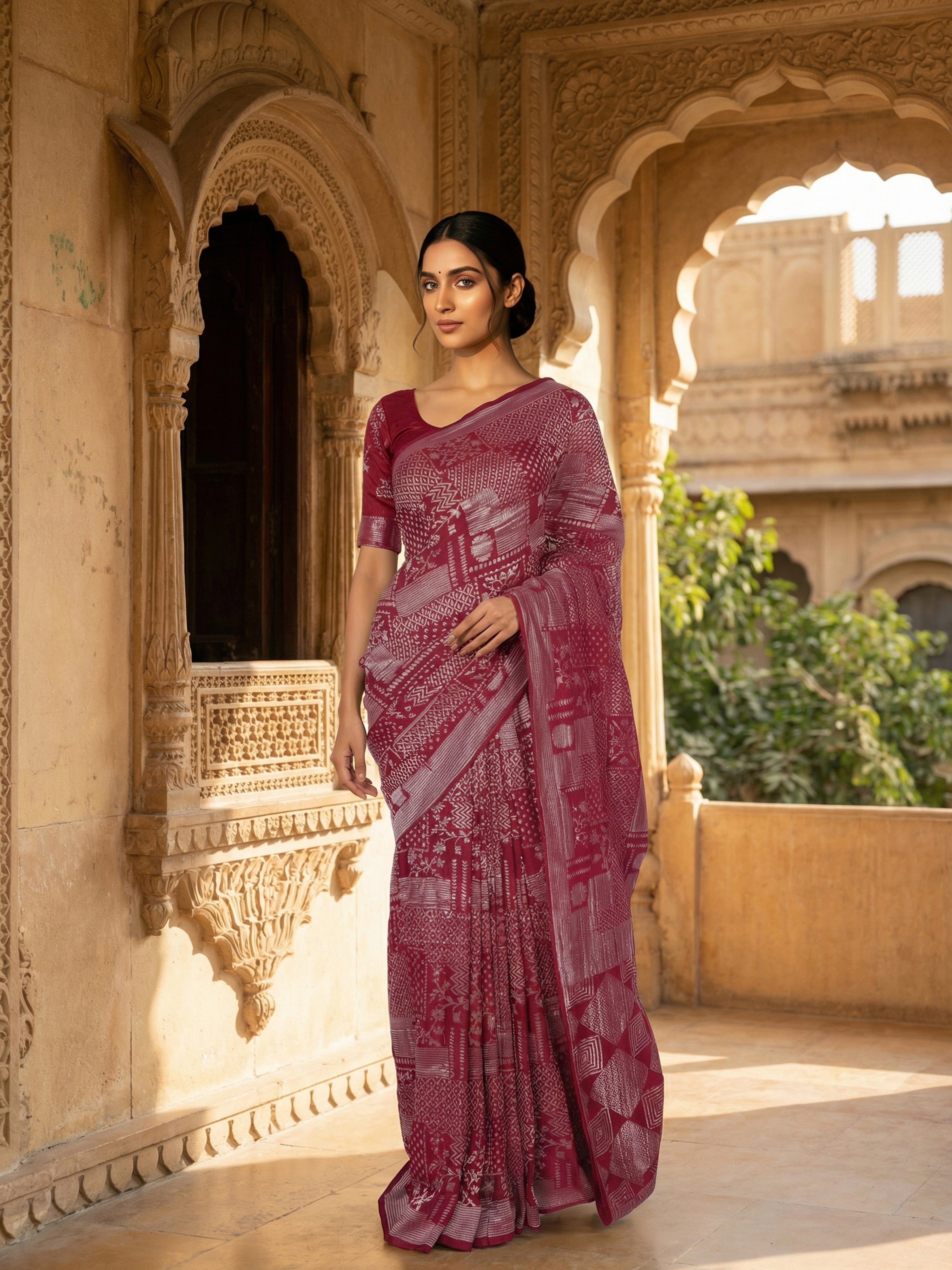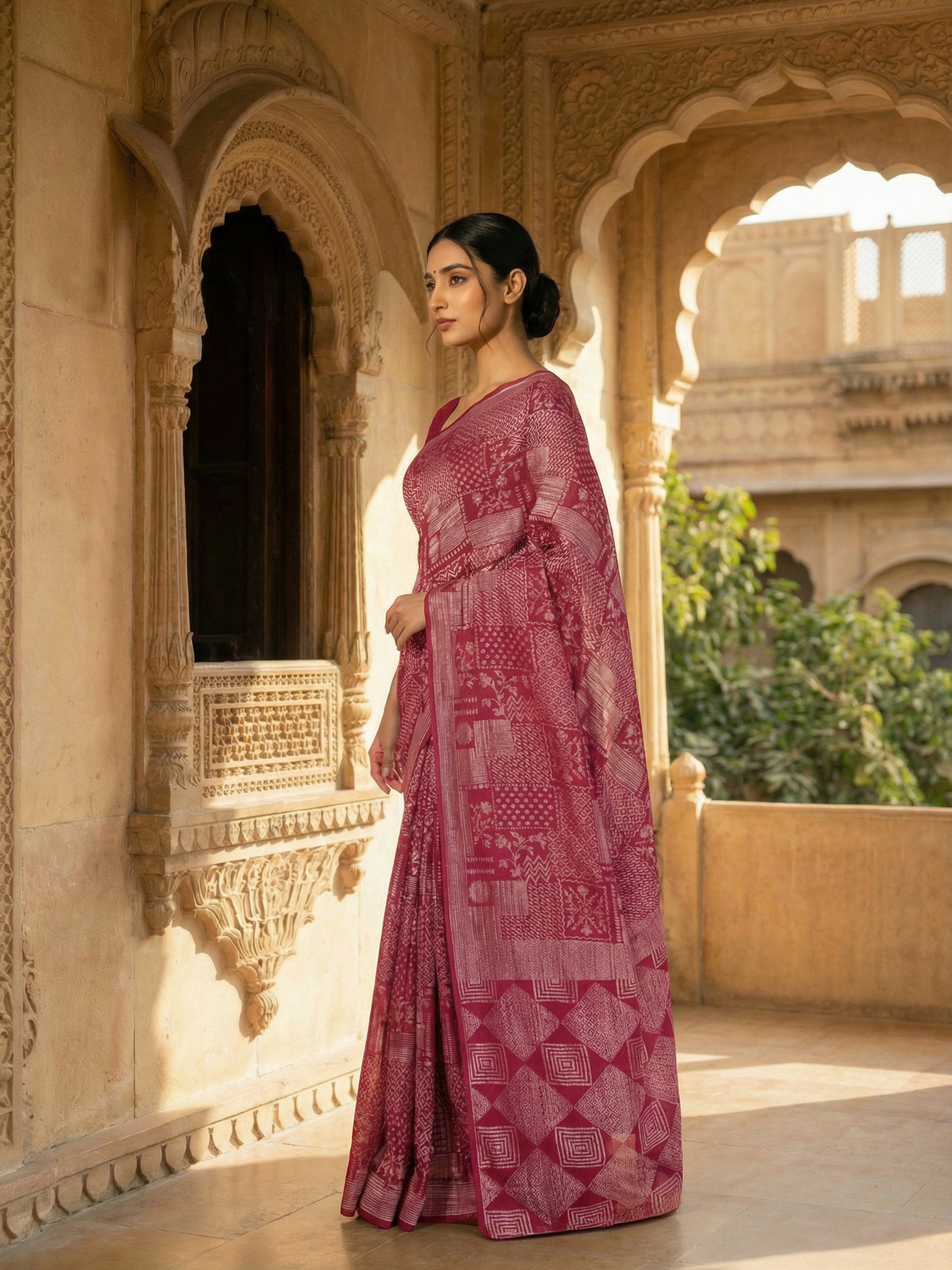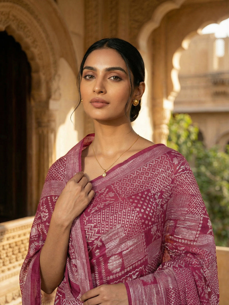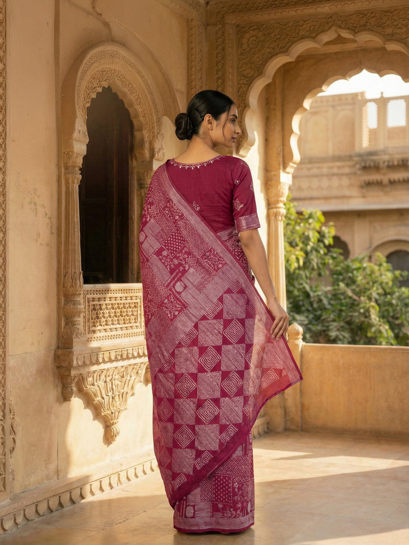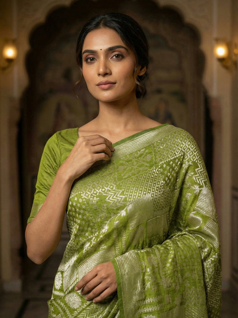Dive into the enchanting world of this semi-silk saree, where nature's richest hues meet artistic brilliance. The fabric drapes with effortless grace, while intricate patchwork-inspired silver motifs dance across the weave, creating a mesmerizing interplay of light and shadow. Perfect for celebrations that call for understated elegance with a creative twist, this saree brings together traditional craftsmanship and contemporary design. Whether you're attending a festive gathering or making a sophisticated statement, this piece transforms you into a walking canvas of timeless beauty and playful sophistication.