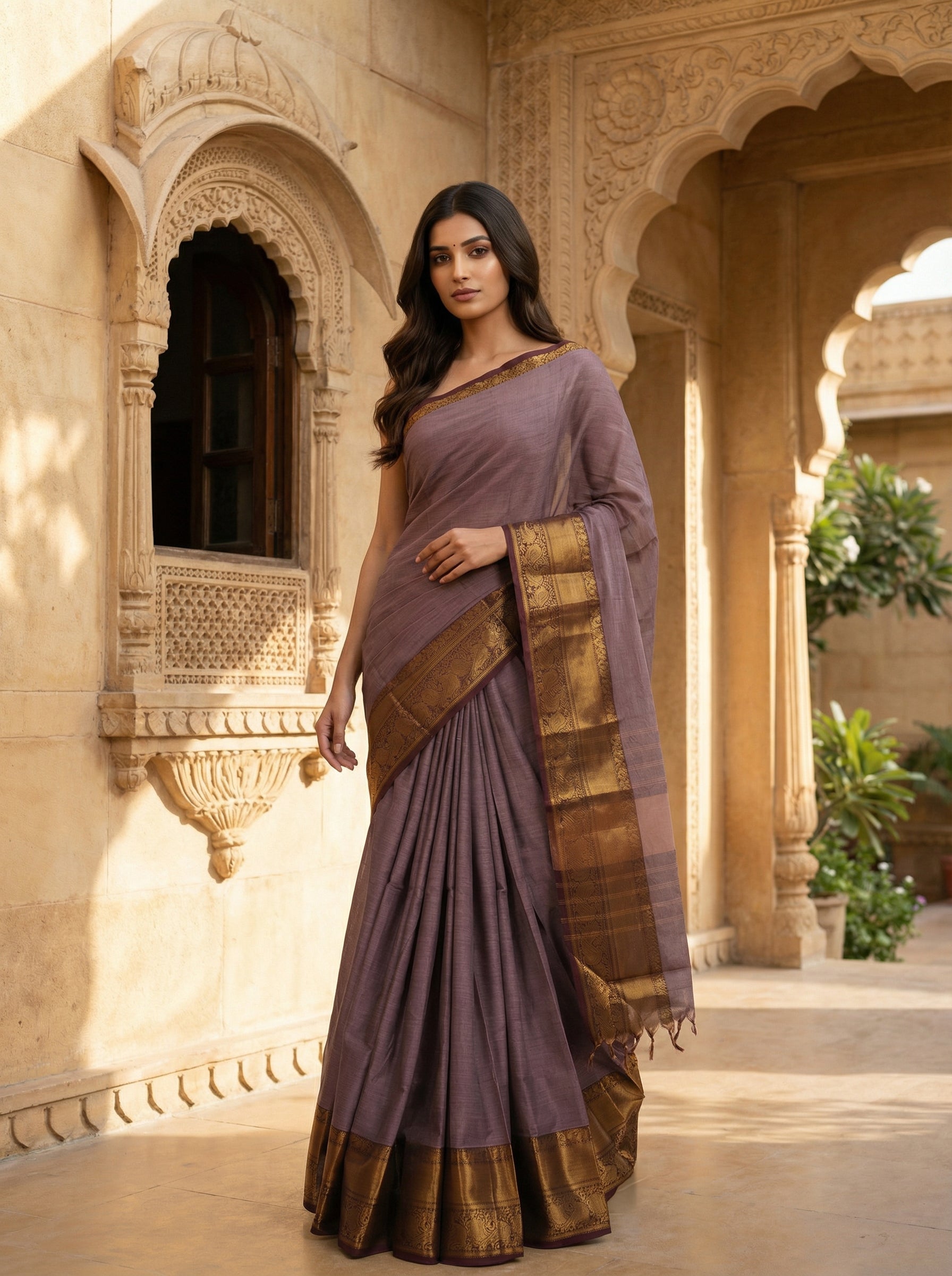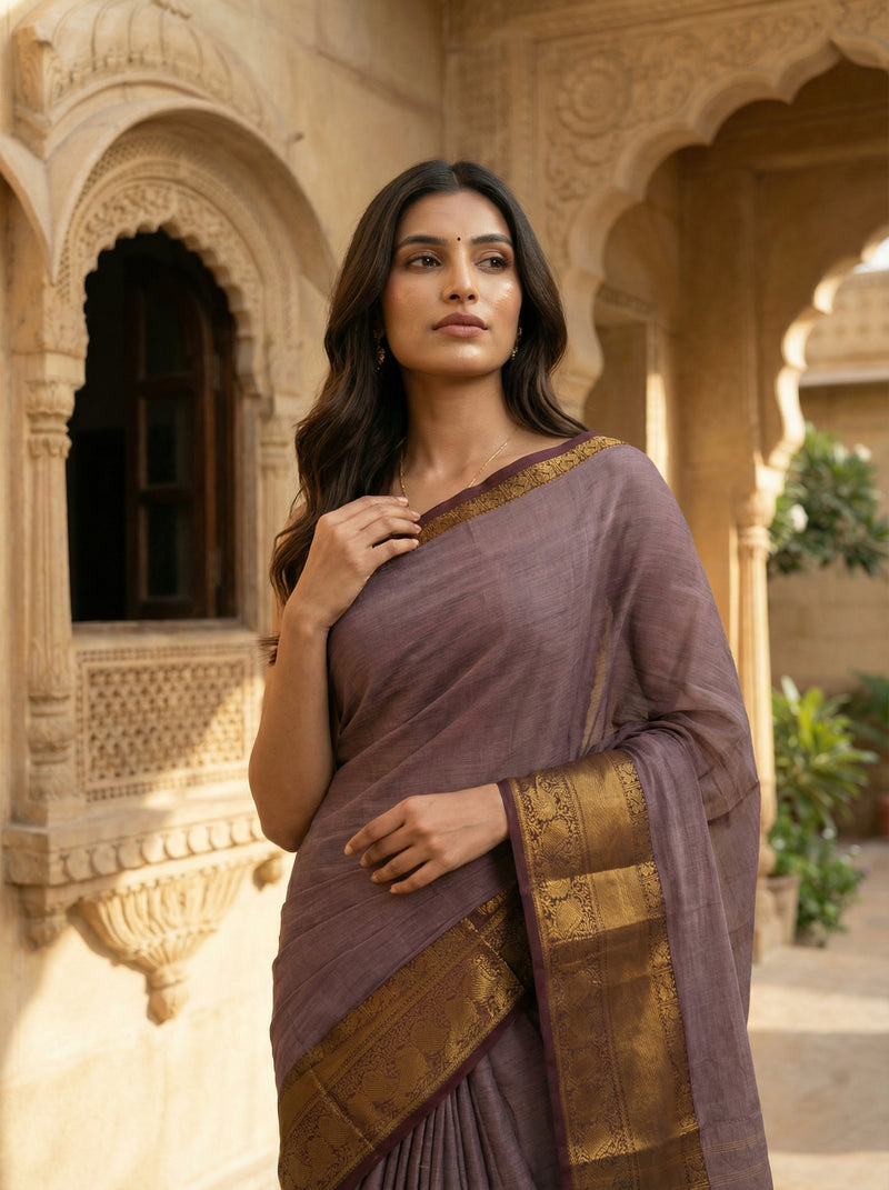 Dusty Mauve Cotton Silk Saree with Antique Gold Zari Border