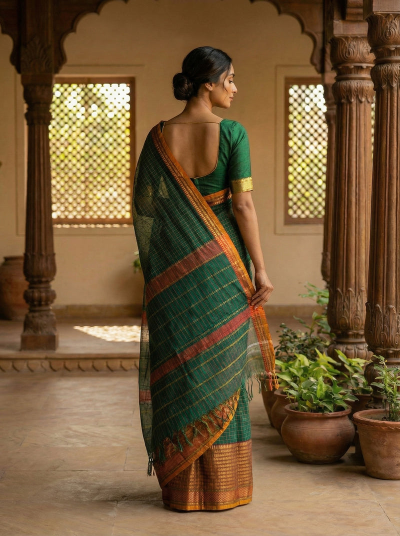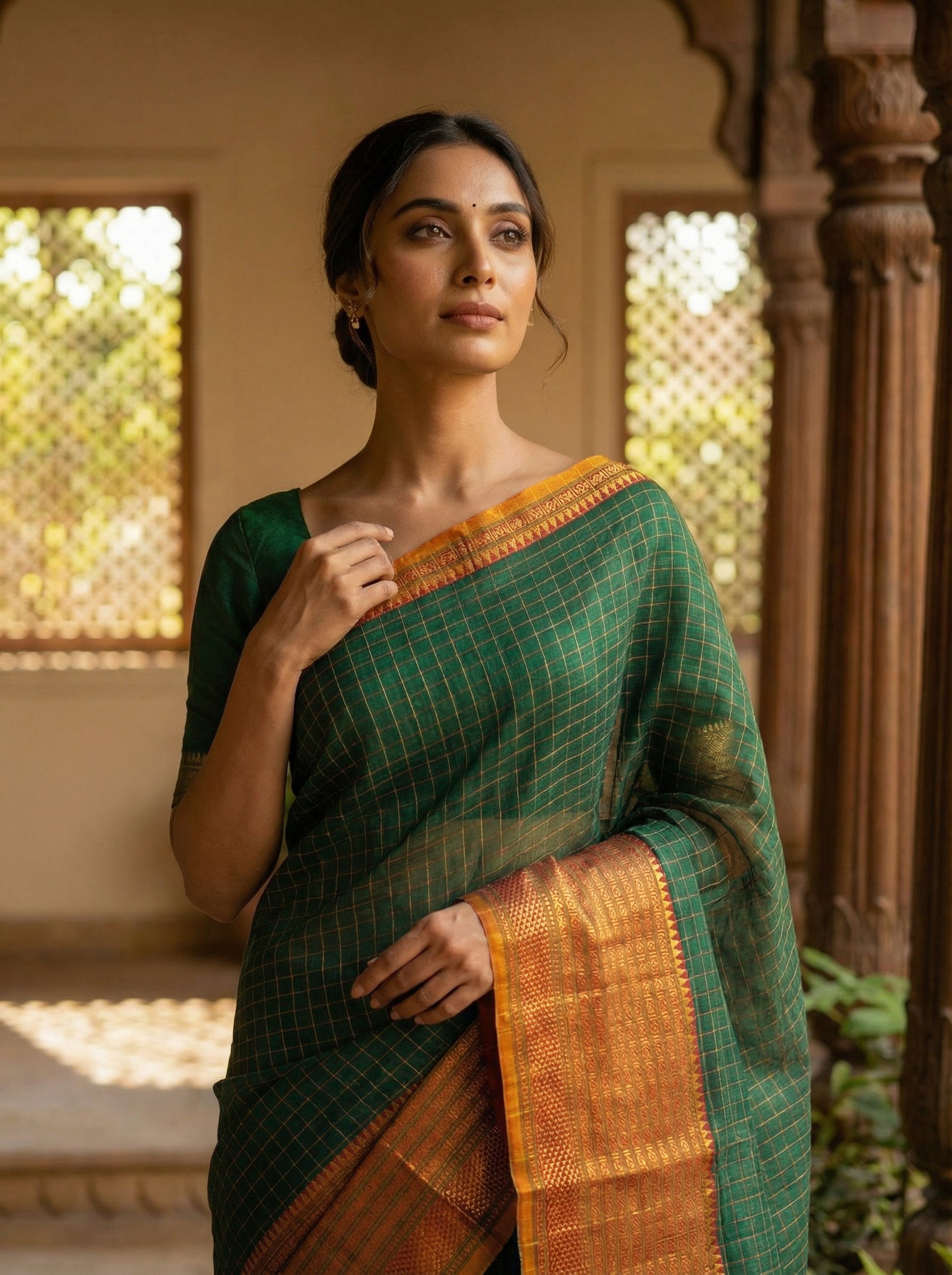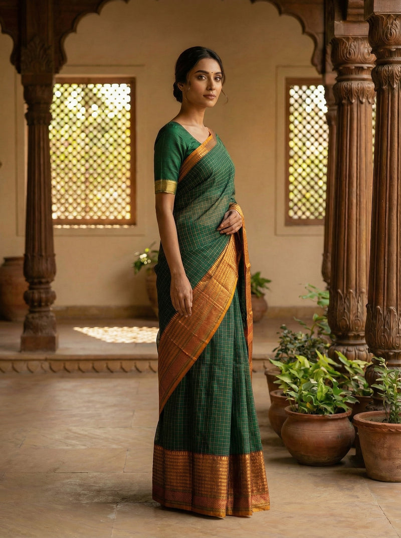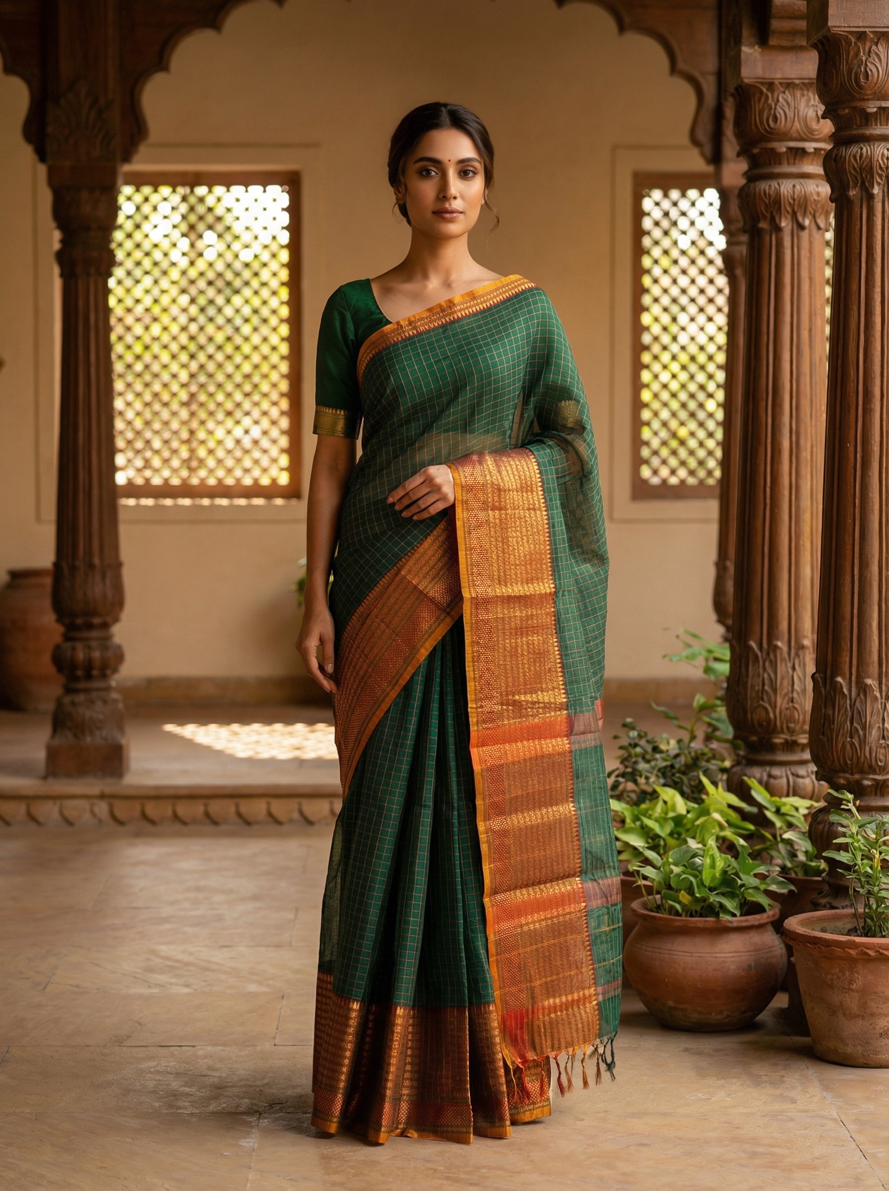 Dive into timeless elegance with this stunning bottle green cotton saree, where subtle fine checks dance across the fabric in perfect harmony. The showstopper? A gloriously rich copper zari border that catches the light and turns heads wherever you go. Crafted from breathable cotton, it's your go-to companion for festivals, celebrations, or those days when you want to feel absolutely fabulous. Effortlessly chic, wonderfully comfortable, and undeniably gorgeous—this saree is ready to become your new favorite!
