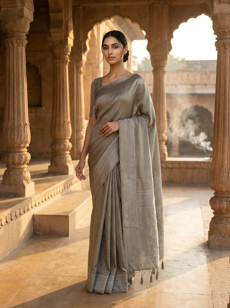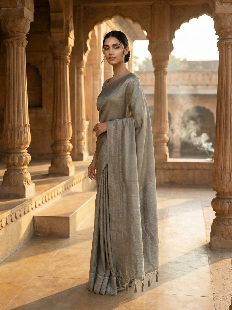 Antique Olive Grey Semi Silk Saree with Subtle Self-Weave and Elegant Border