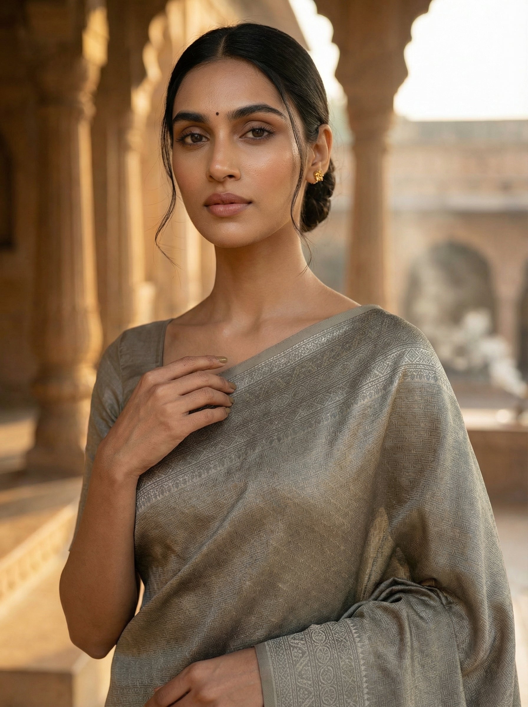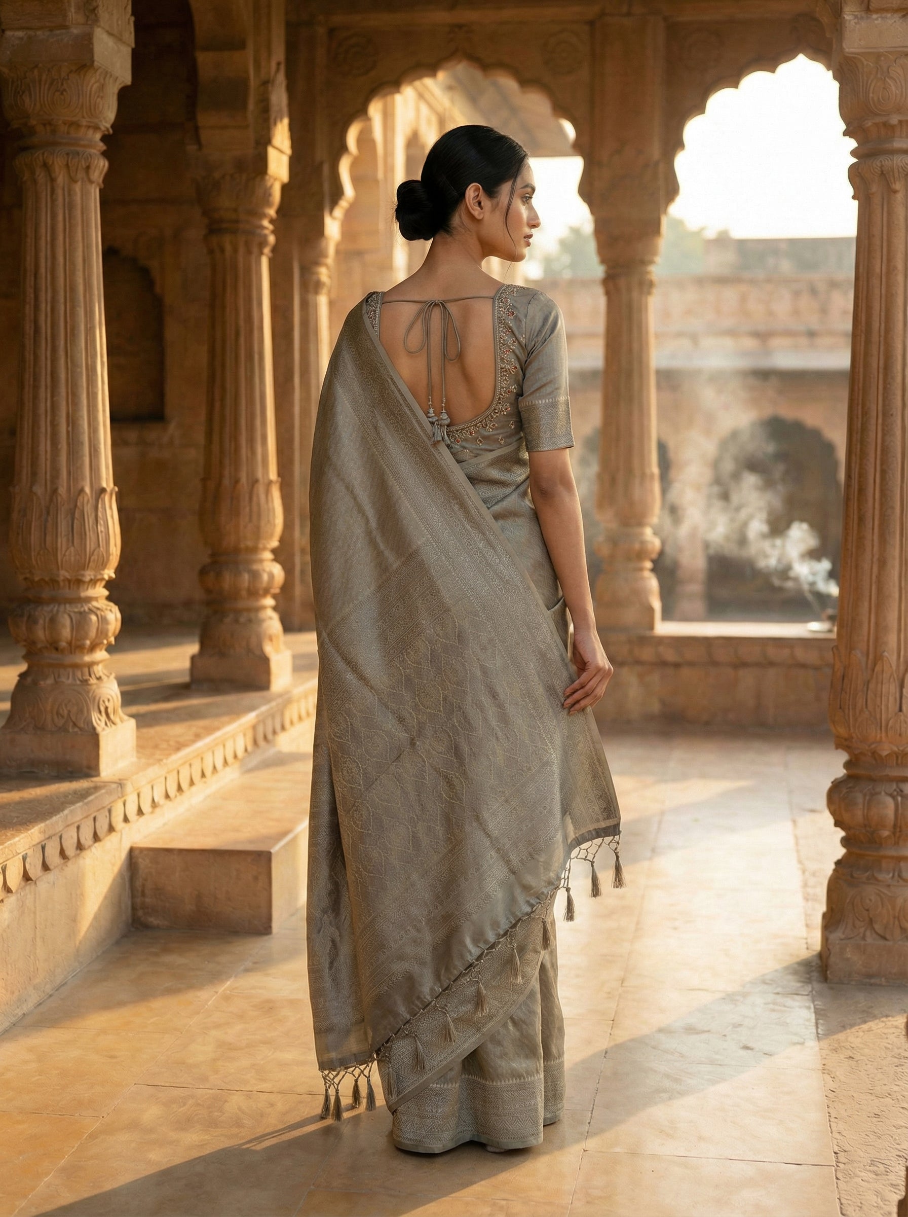 Discover timeless elegance with this stunning Antique Olive Grey Semi Silk Saree, where understated sophistication meets playful charm. The subtle self-weave creates a mesmerizing texture that catches light beautifully, while the elegant border adds a touch of refined glamour to your ensemble. Crafted from premium semi-silk, this saree drapes gracefully and feels wonderfully comfortable against your skin. Perfect for festive occasions, celebrations, or when you want to make a graceful statement without trying too hard. A versatile wardrobe essential that effortlessly transitions from traditional gatherings to modern settings.