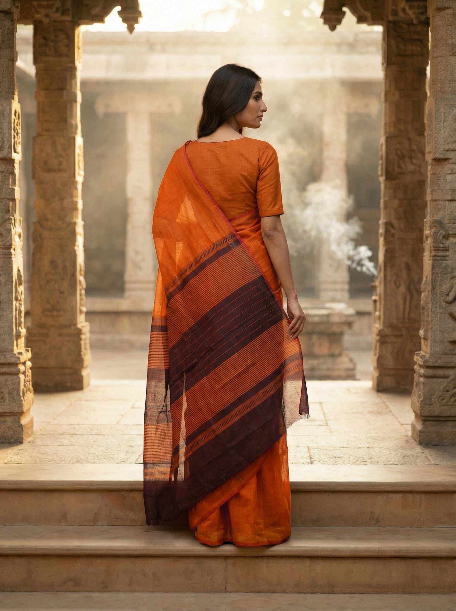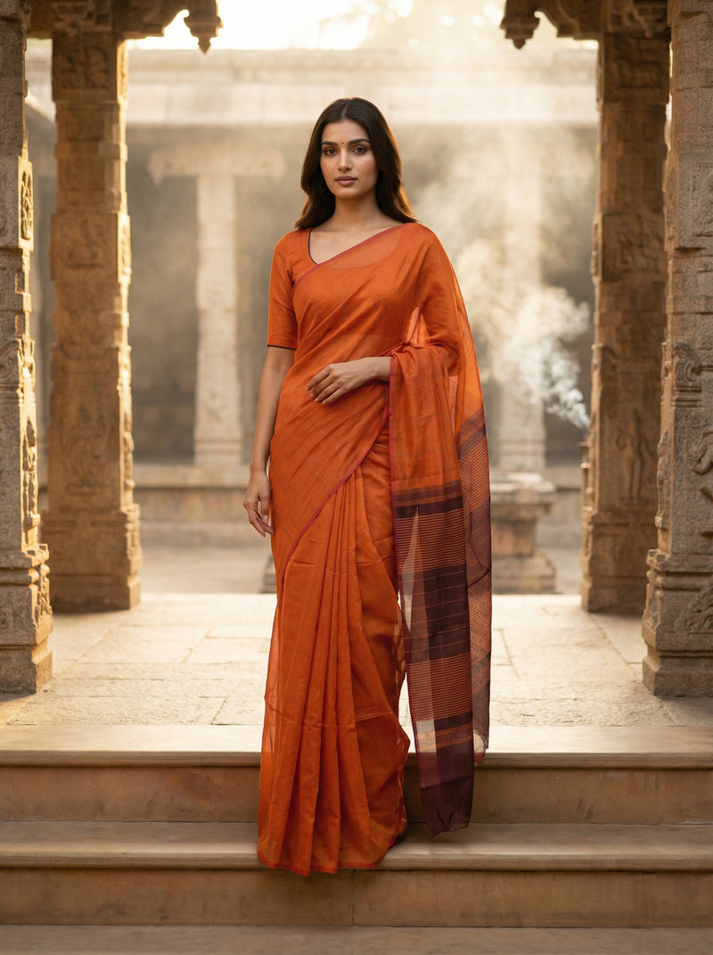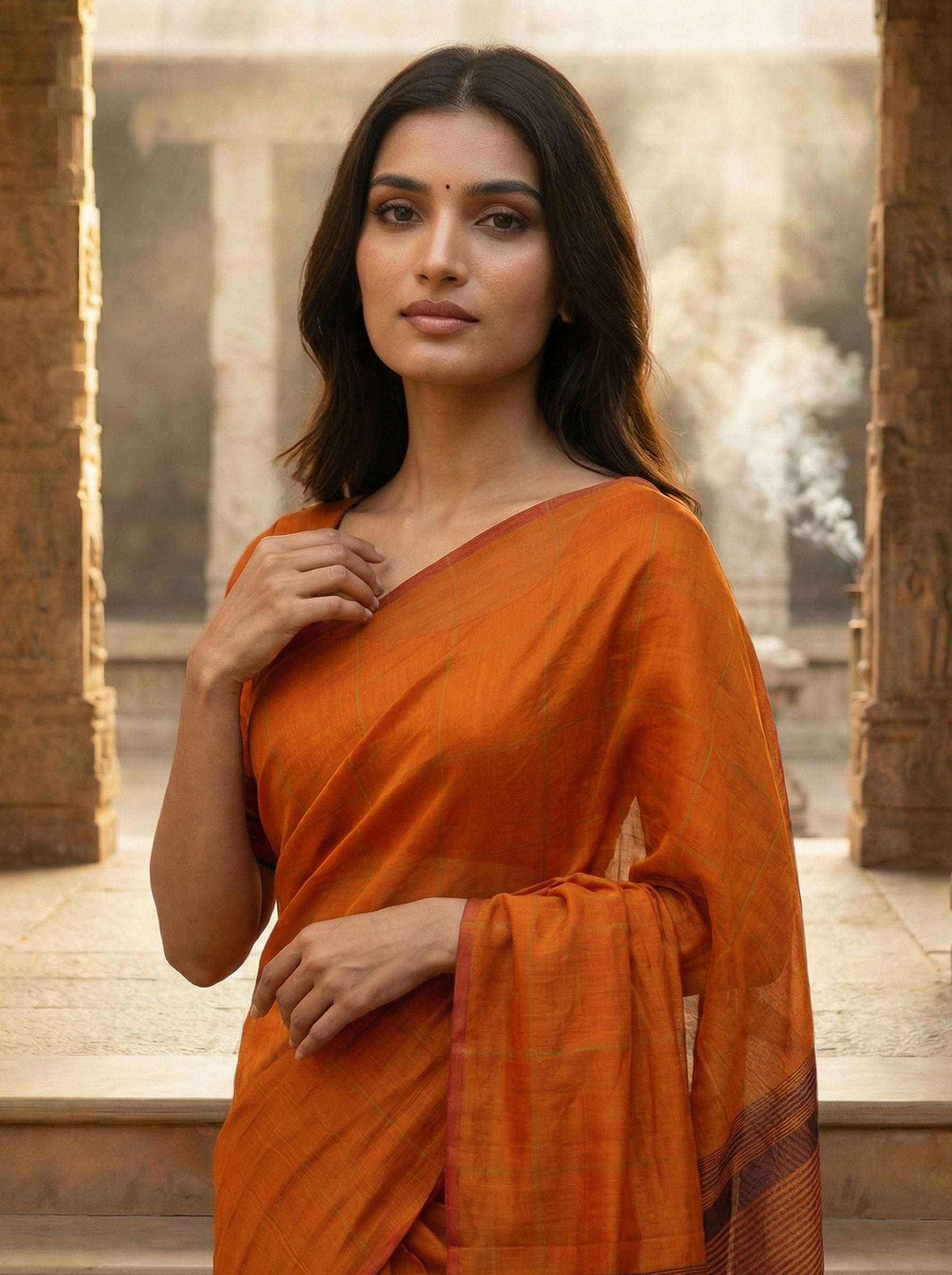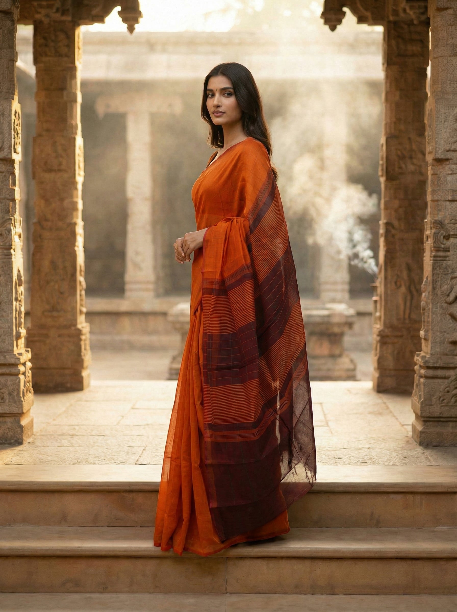 Burnt Orange Sayanora Saree with Subtle Checks and Contrast Striped Pallu