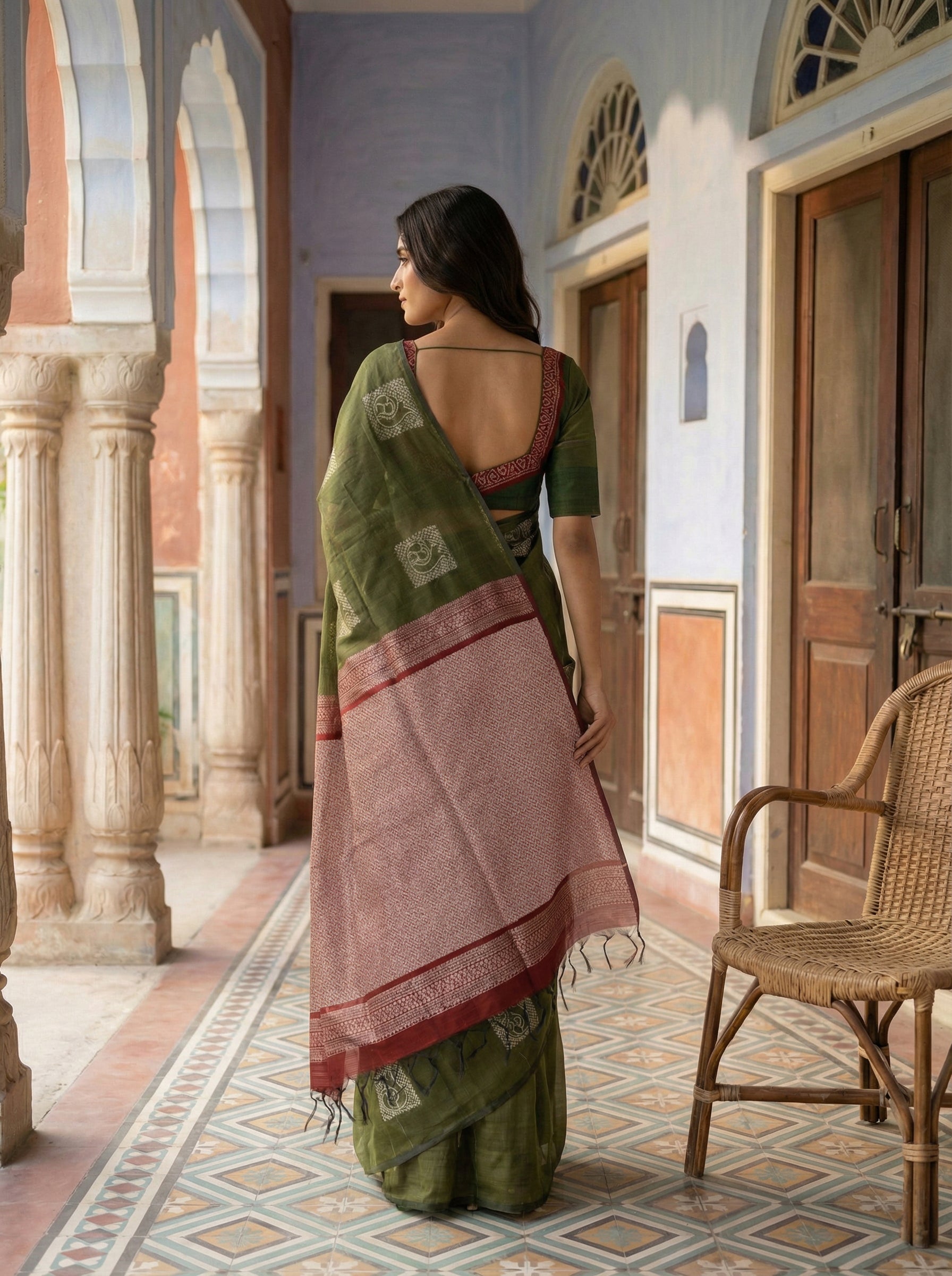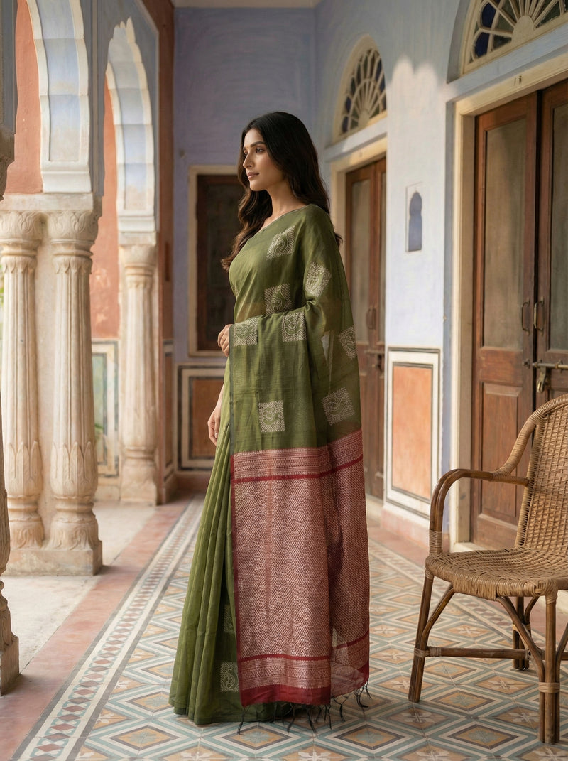 Embrace timeless elegance with this stunning olive green Sayanora saree, where tradition meets contemporary charm. The rich, muted olive tone provides a sophisticated canvas for intricate traditional motifs that dance across the fabric, telling stories of heritage and craftsmanship. A striking maroon contrast border frames the saree beautifully, adding depth and visual interest that elevates any occasion. Perfect for celebrations, festivals, or when you want to feel effortlessly graceful, this saree blends classic Indian artistry with a color palette that's refreshingly modern. Drape it, own it, and let your style speak volumes.