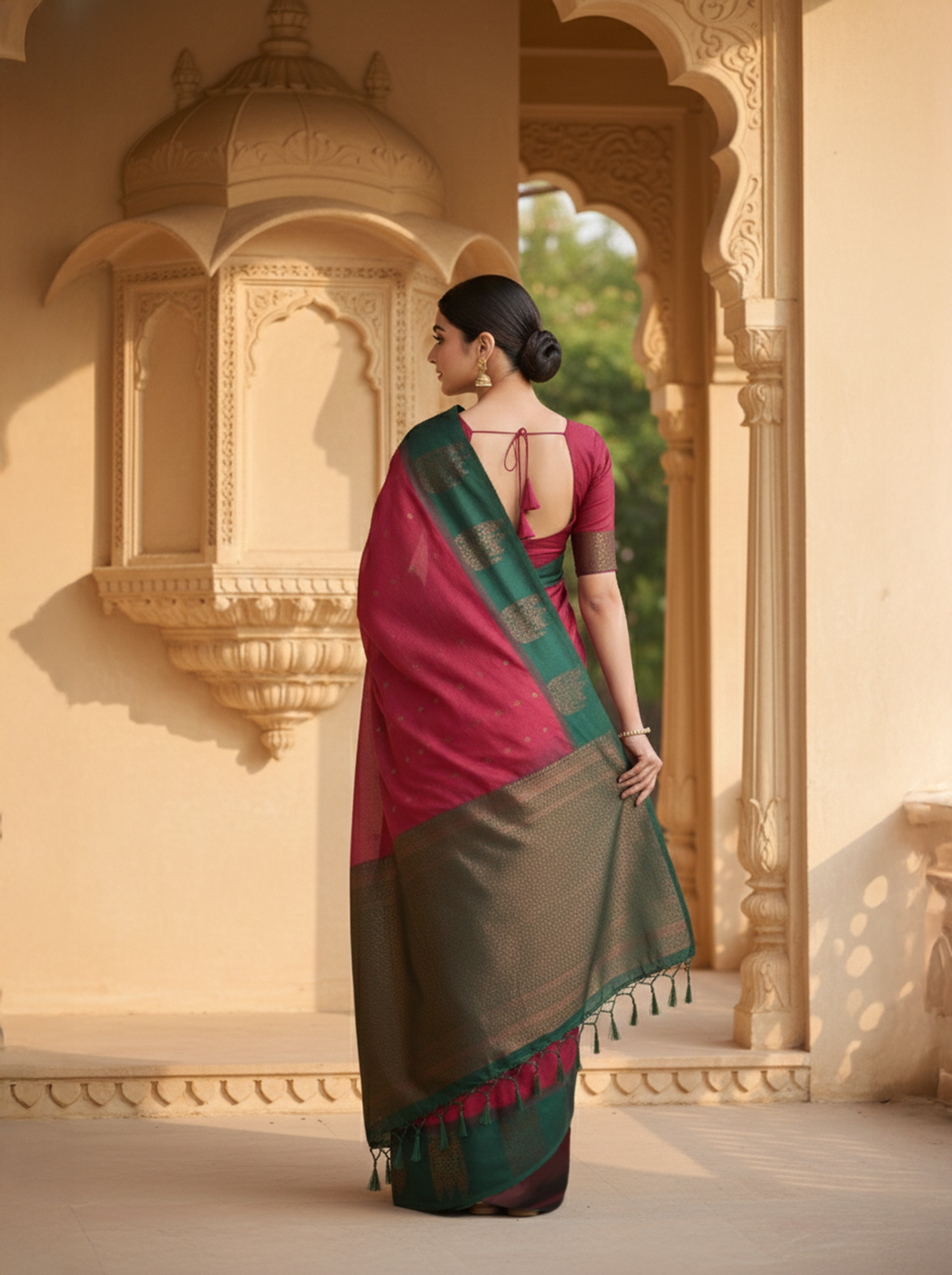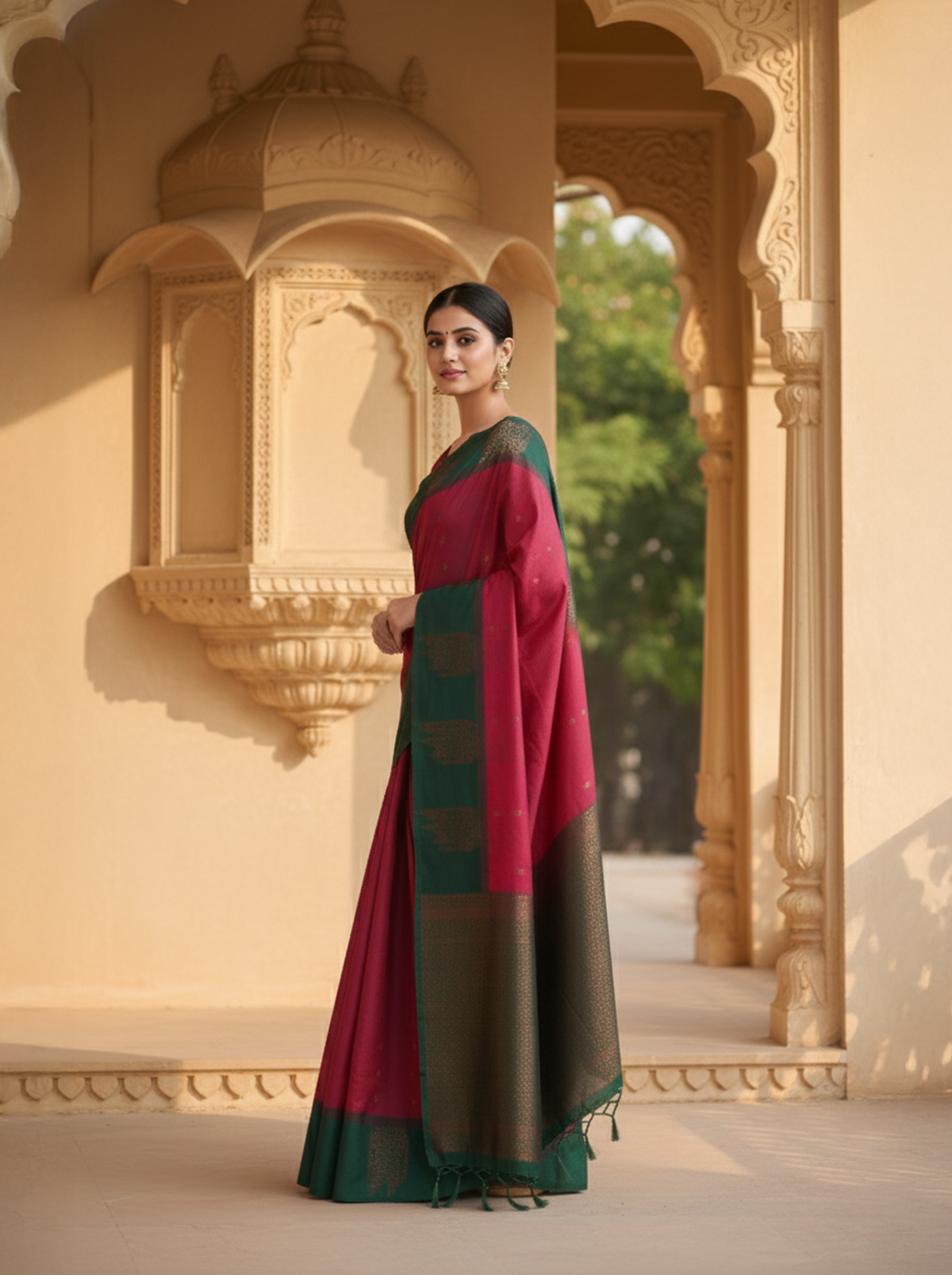 Crimson Pink Semi Silk Saree with Gold Buttas and Bottle Green Contrast Border