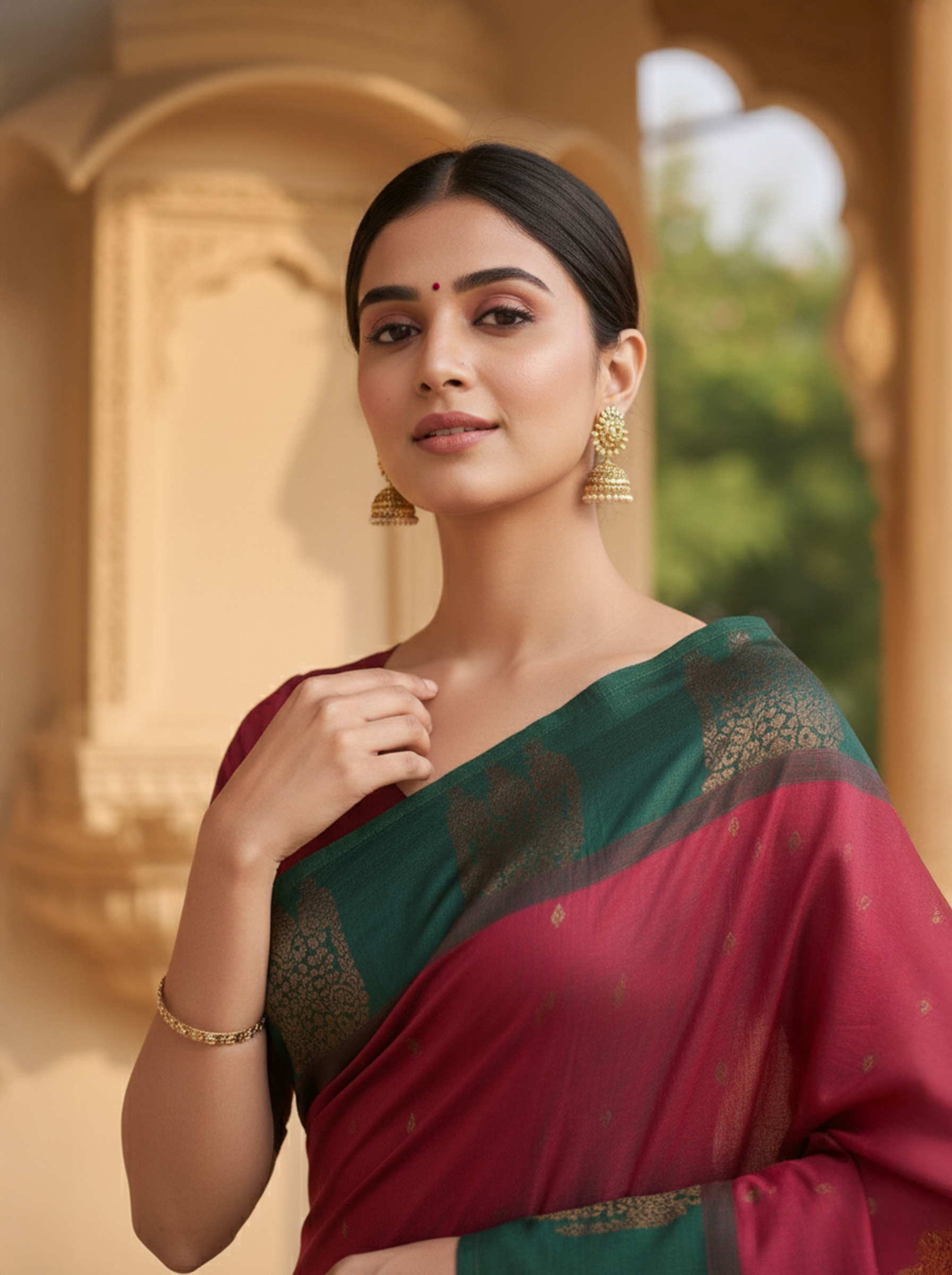 Dive into timeless elegance with this stunning crimson red semi-silk saree that's pure magic! Adorned with delicate gold buttas scattered across the fabric, each detail catches the light beautifully. The rich bottle green contrast border adds a sophisticated pop of color that elevates the entire look. Perfect for weddings, festivals, or those moments when you want to turn heads, this saree blends traditional charm with modern flair. Drape it, own it, and let your style speak volumes!