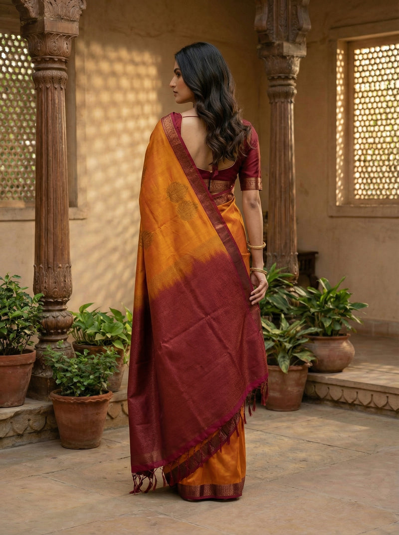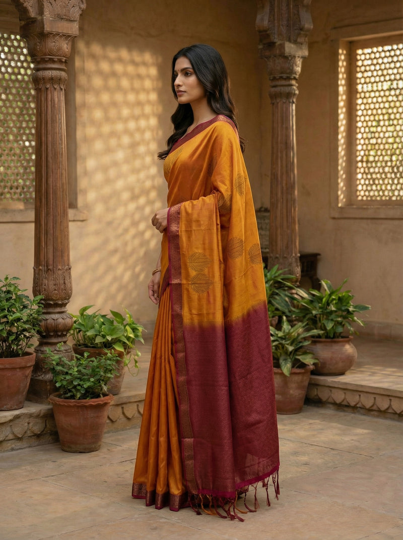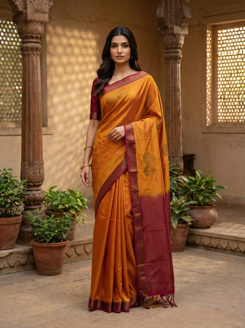 Discover the magic of this burnt orange semi-silk saree that's ready to steal the spotlight! Adorned with graceful leaf motifs that dance across the fabric, it tells a story of natural beauty and timeless charm. The maroon contrast border frames the entire piece with bold sophistication, creating a look that's both striking and refined. Semi-silk fabric ensures you stay comfortable while looking absolutely radiant—perfect for weddings, festivals, or those moments when you want to feel genuinely fabulous. Drape it with confidence and watch as this saree becomes your new favorite go-to piece for making memorable impressions!