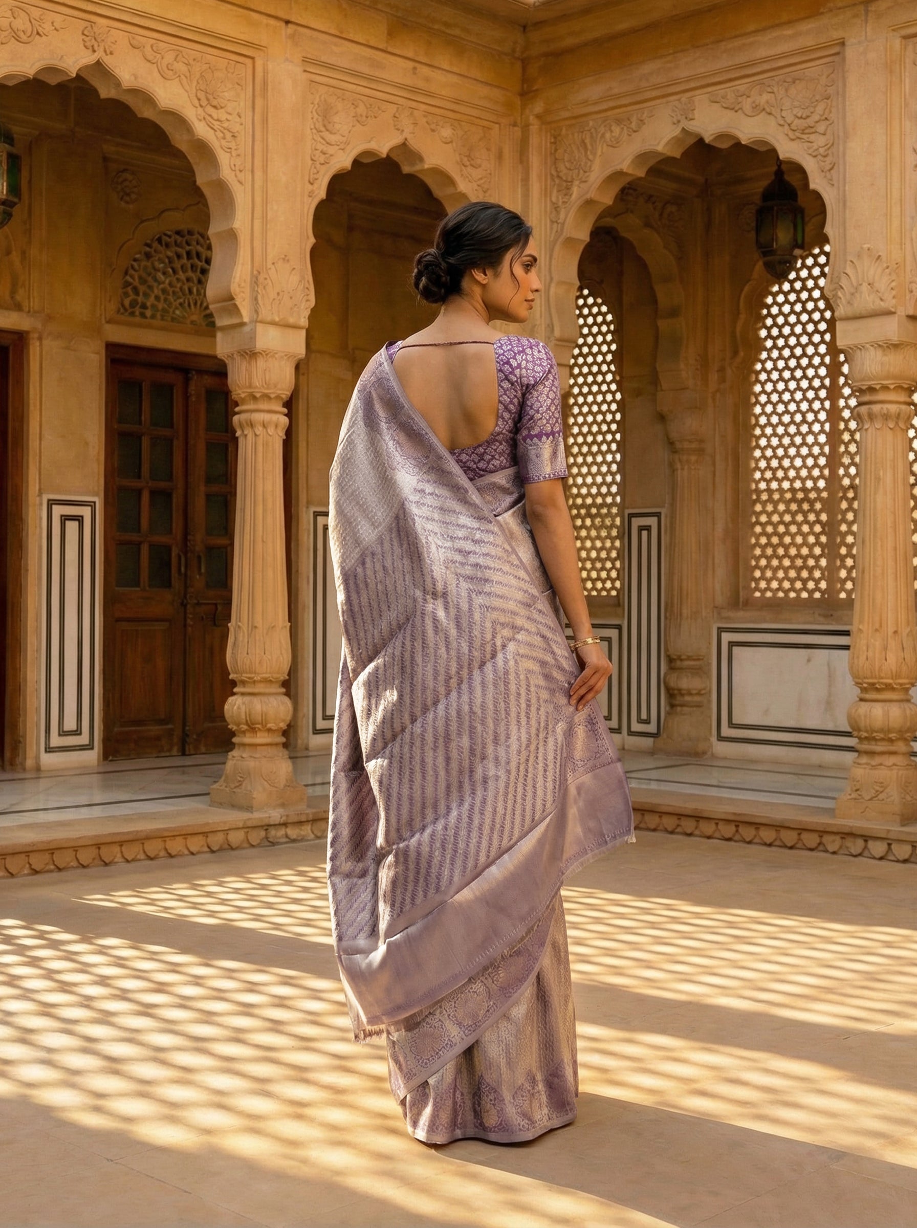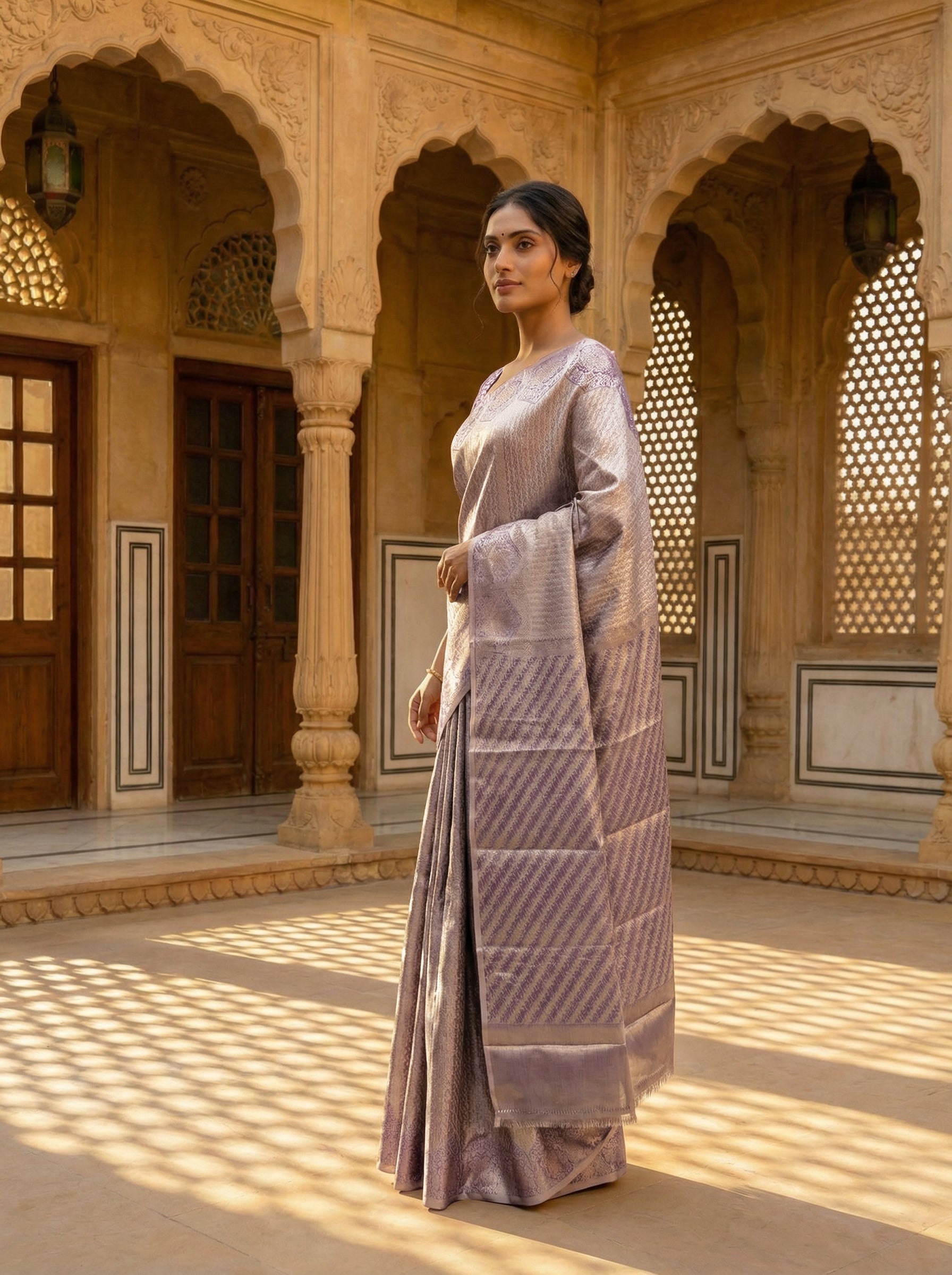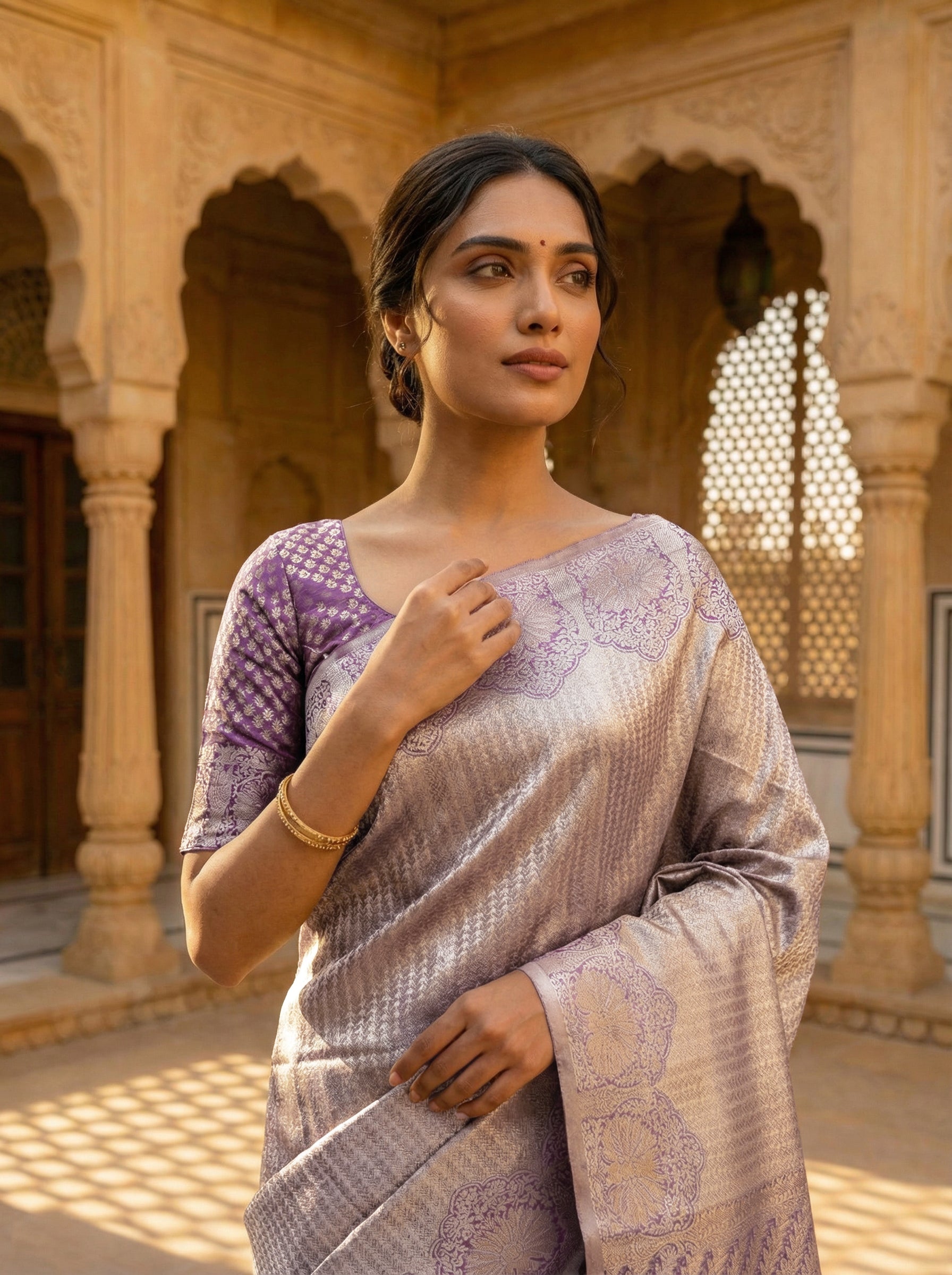 Drape yourself in timeless elegance with this stunning beige and gold semi-silk saree that's sure to turn heads! The lavender brocade motifs add a delightful pop of color and sophistication, while the intricate zari border brings that luxe finishing touch. Perfect for weddings, festivals, or whenever you want to feel absolutely fabulous. This versatile piece effortlessly blends traditional charm with modern grace, making it your go-to choice for looking absolutely divine at any celebration.
