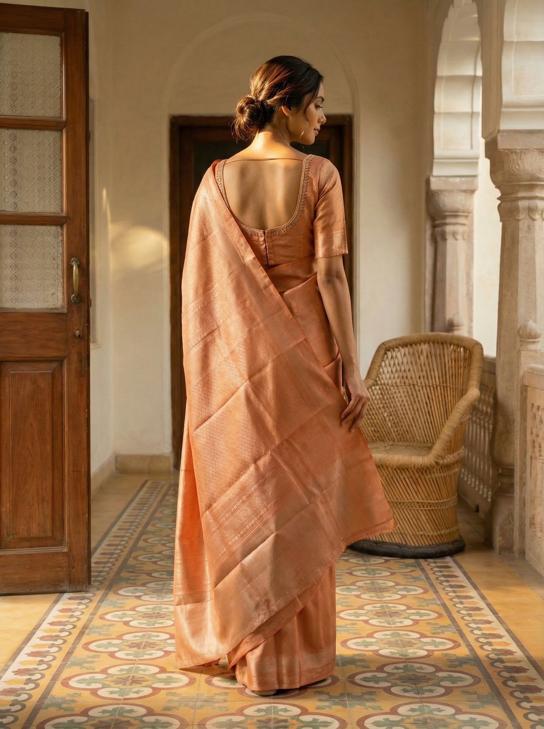 Drape yourself in warmth with this stunning peach-orange semi-silk saree that's equal parts elegant and effortless. The subtle self-weave pattern adds sophisticated texture without overwhelming your look, while the soft sheen catches light beautifully as you move. Perfect for celebrations, festivals, or whenever you want to feel absolutely radiant. This versatile shade complements all skin tones and pairs wonderfully with traditional or contemporary styling. Experience the comfort of semi-silk that feels luxurious against your skin while remaining breathable for all-day wear.