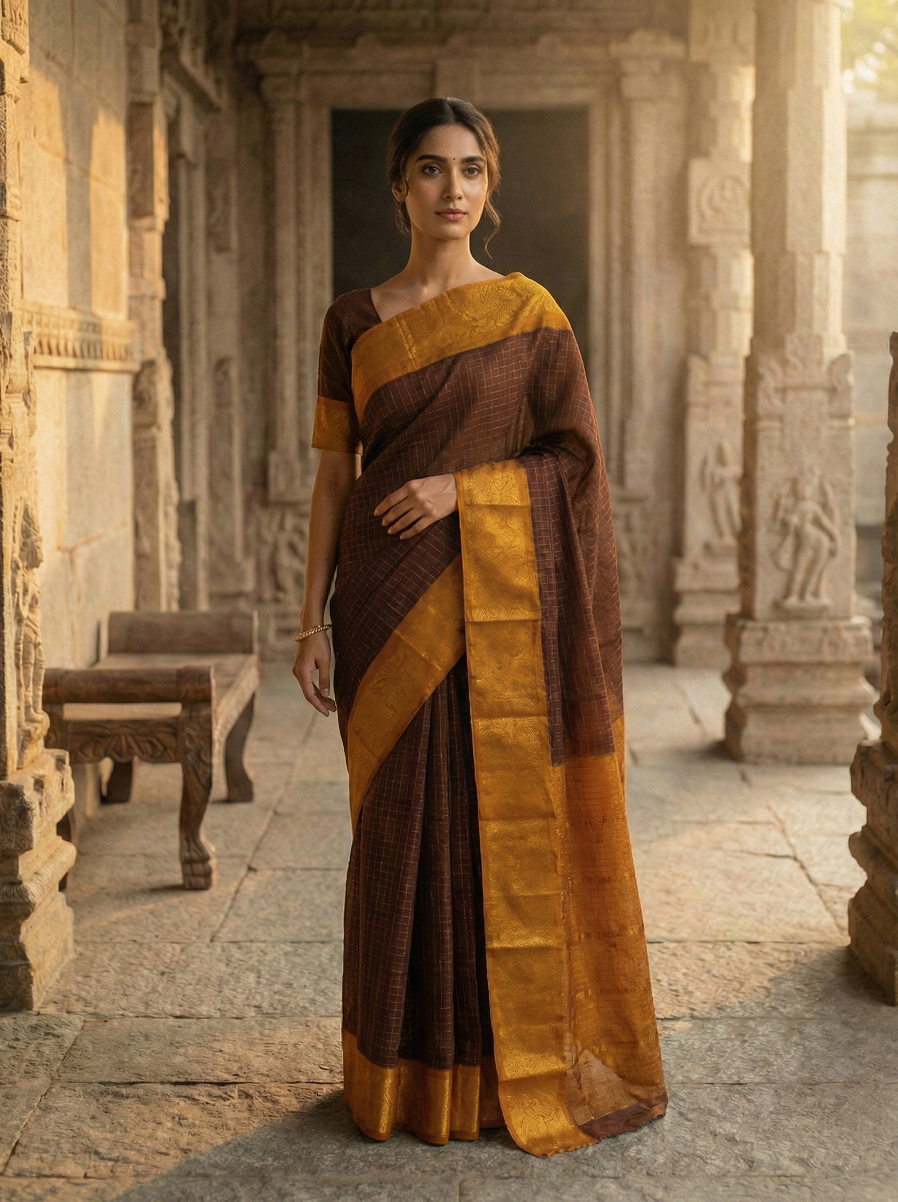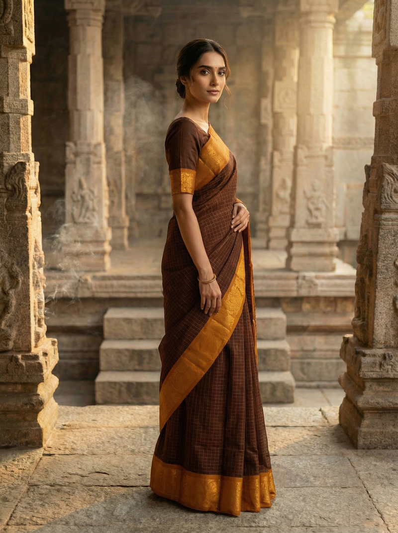 Wrap yourself in warmth with this delightful coffee brown cotton saree, where earthy elegance meets a pop of personality. The mustard gold woven border adds just the right amount of shimmer and charm, creating a look that's both timeless and unexpectedly fun. Perfect for those days when you want to feel put-together without taking yourself too seriously. Soft, breathable cotton keeps you comfortable all day long, while the rich brown tone pairs beautifully with everything in your wardrobe. A saree that proves classic style doesn't have to be boring!