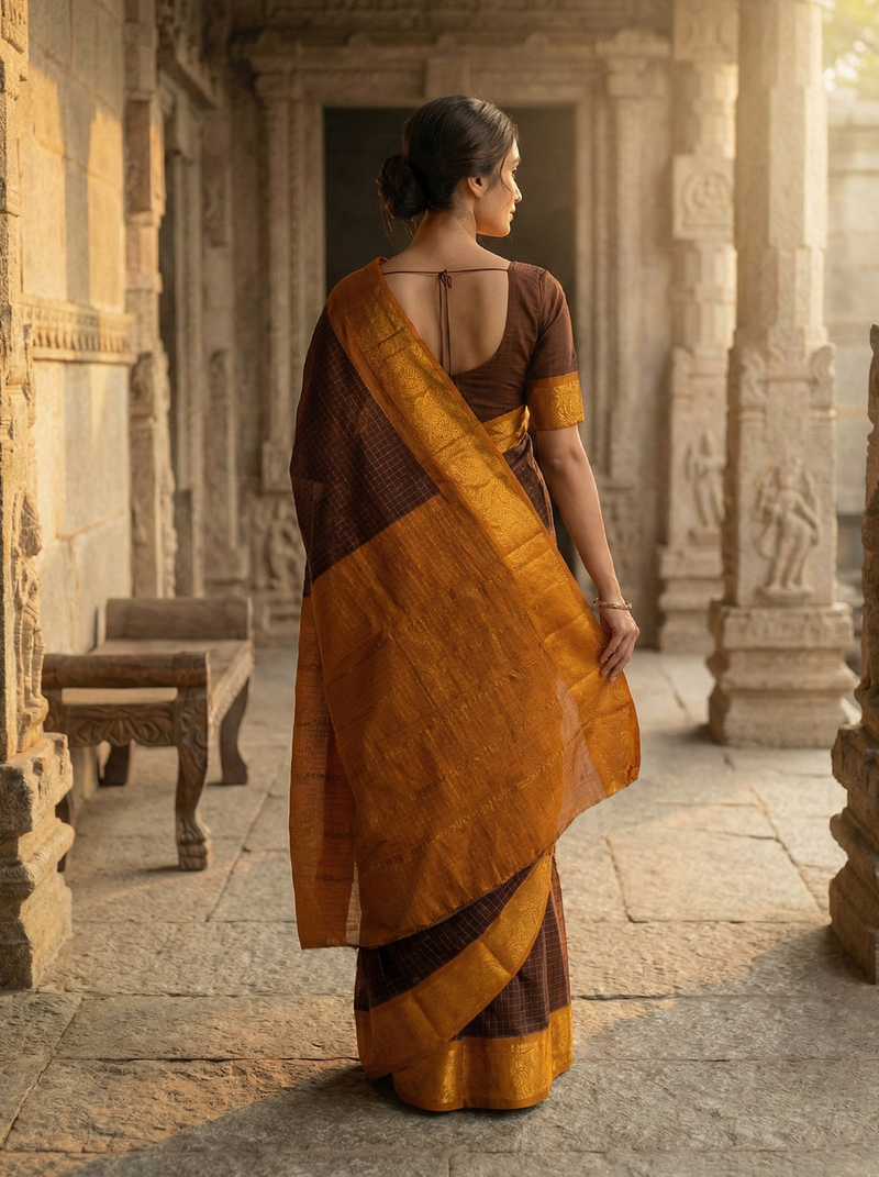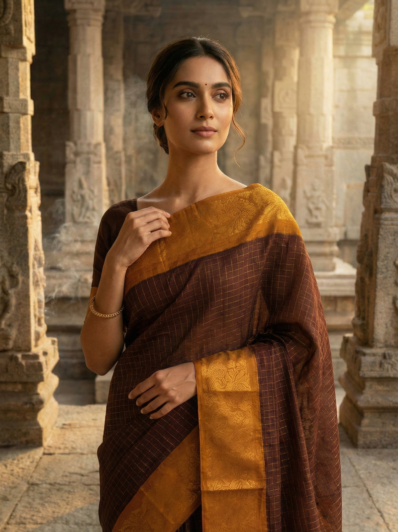 Coffee Brown Cotton Saree with Mustard Gold Woven Border