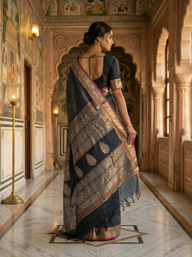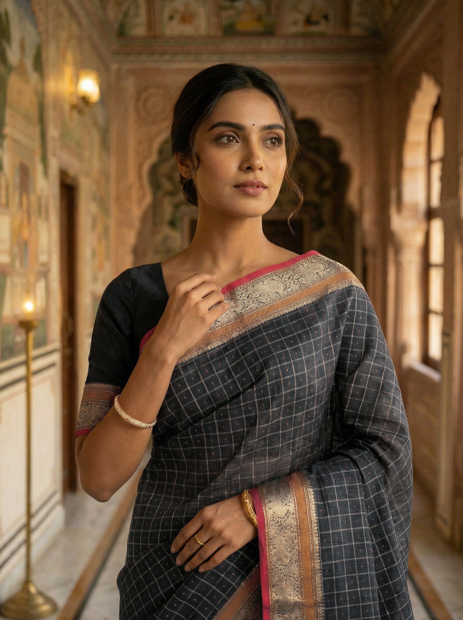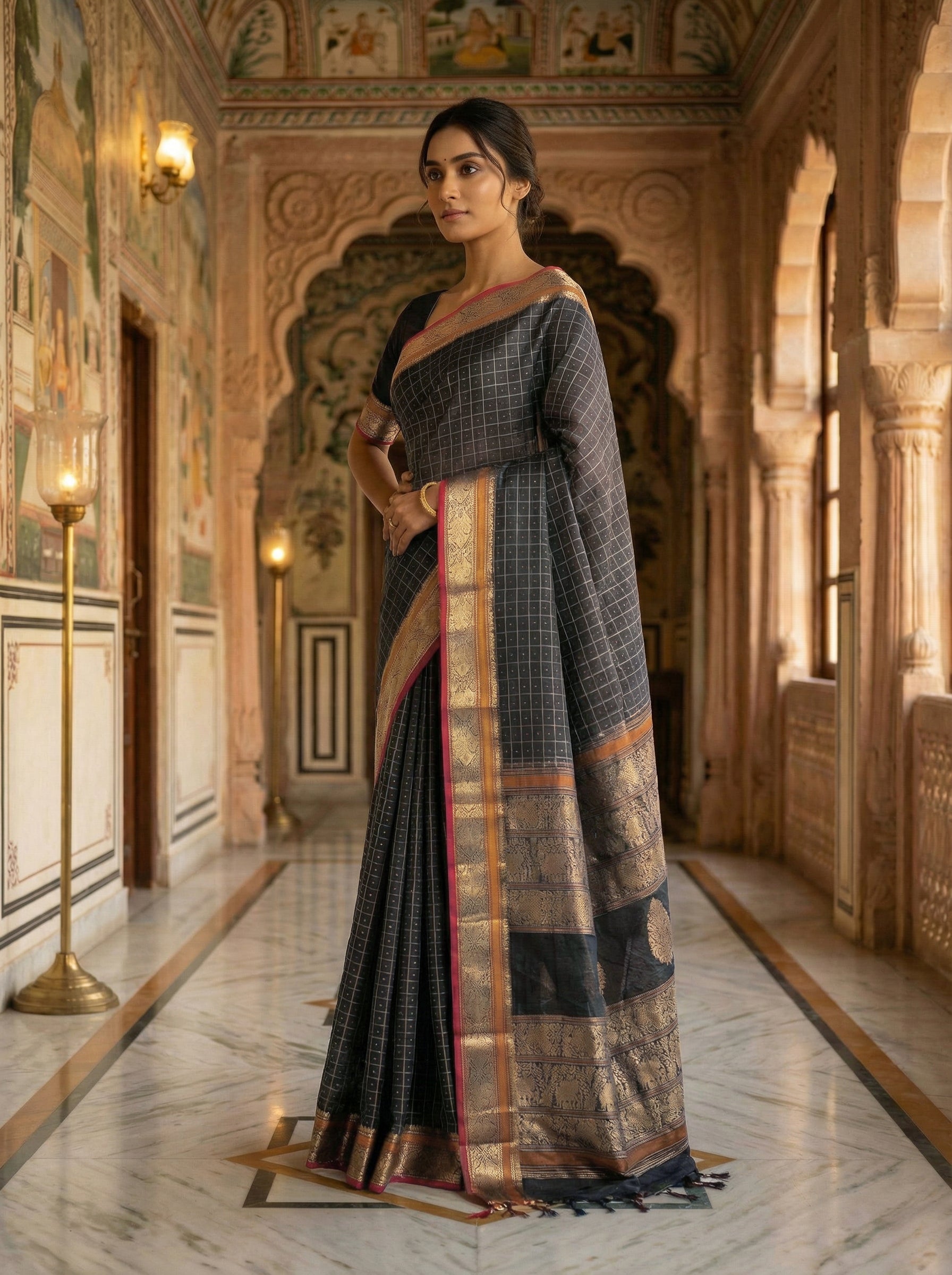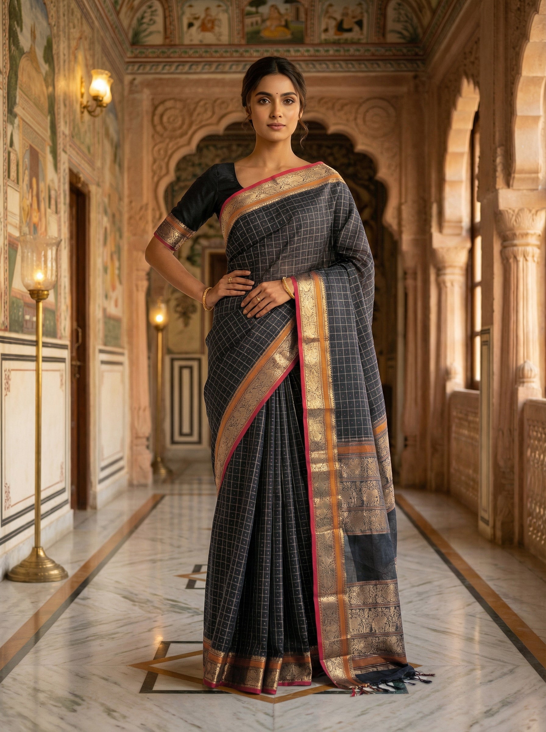 Black Checked Silk Saree with Antique Gold Zari Border and Red Accents