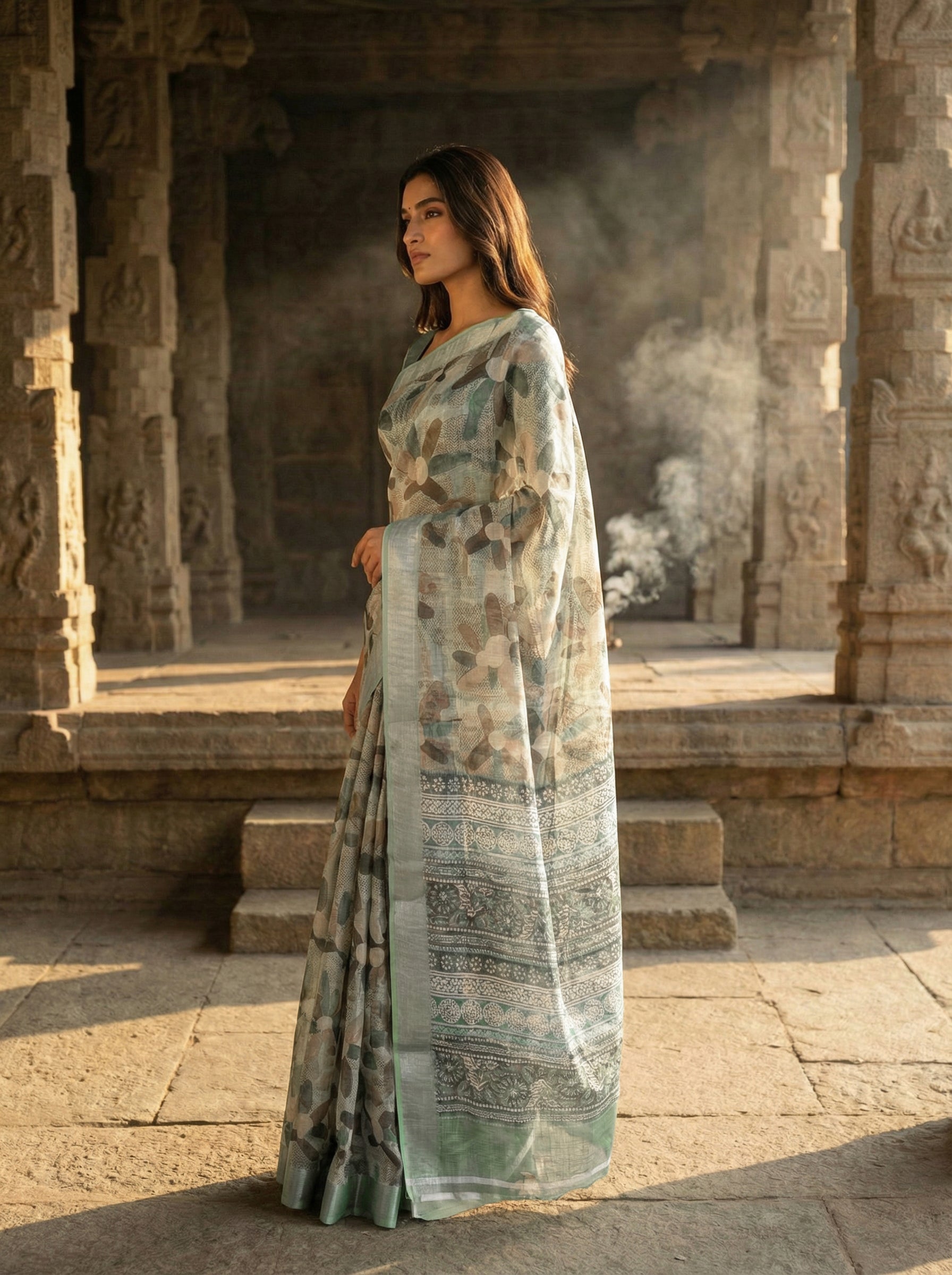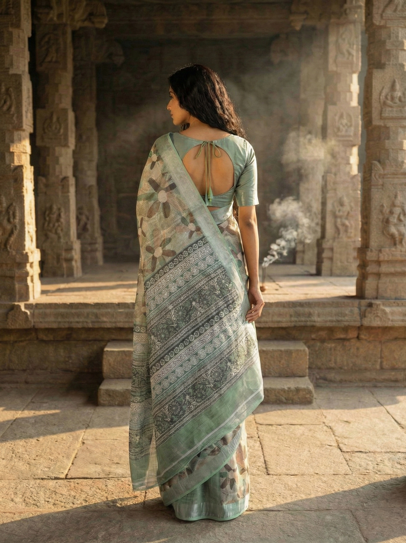 Wrap yourself in botanical bliss with this whimsical pastel green floral printed saree! Bursting with delicate flower motifs that dance across the fabric, this stunner features a sophisticated solid border that perfectly frames your elegance. Made from luxurious linen, it's breathable, comfortable, and ready to keep you looking fresh through any occasion. The soft, soothing green shade complements all skin tones and pairs beautifully with minimal accessories. Perfect for festive celebrations, casual outings, or whenever you want to add a splash of nature-inspired charm to your look. This floral treasure is your ticket to effortless, joyful style!