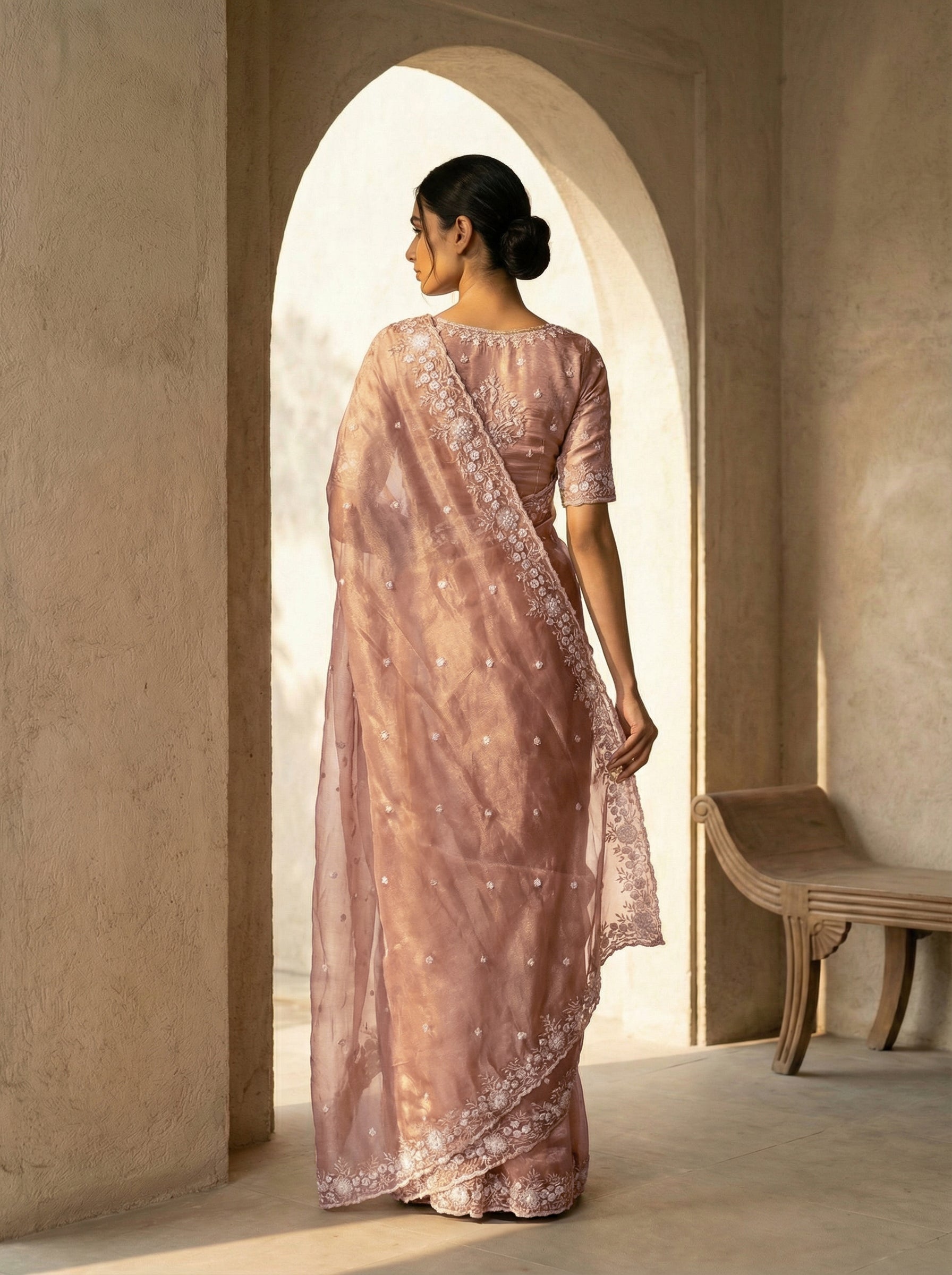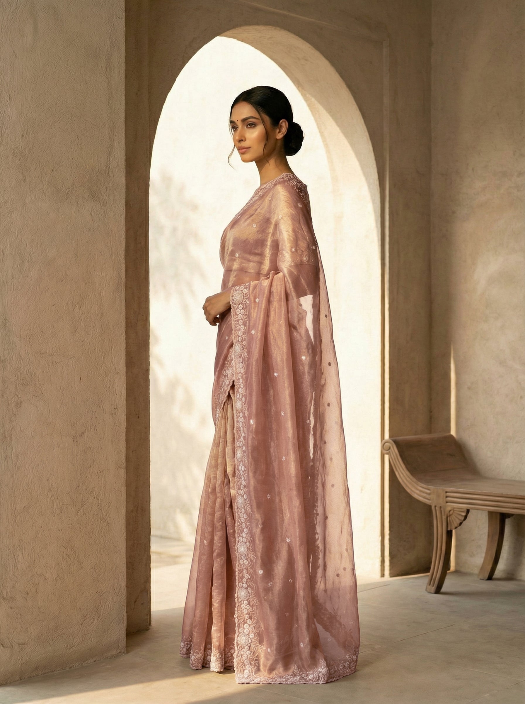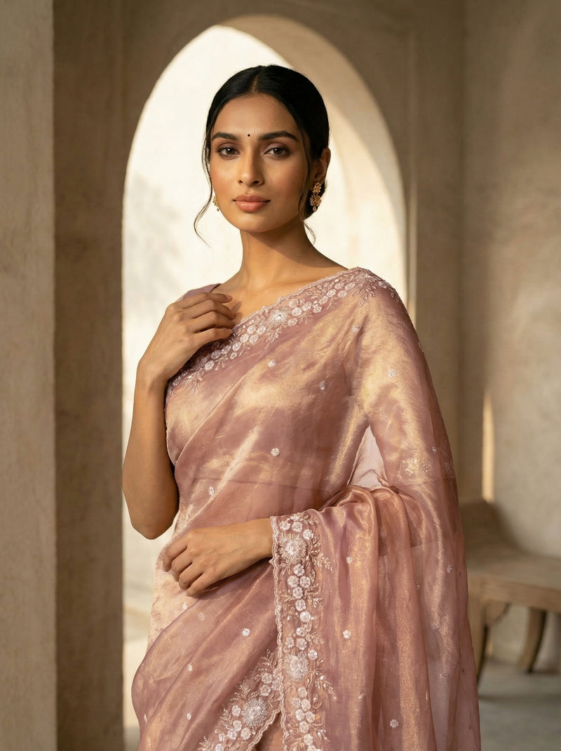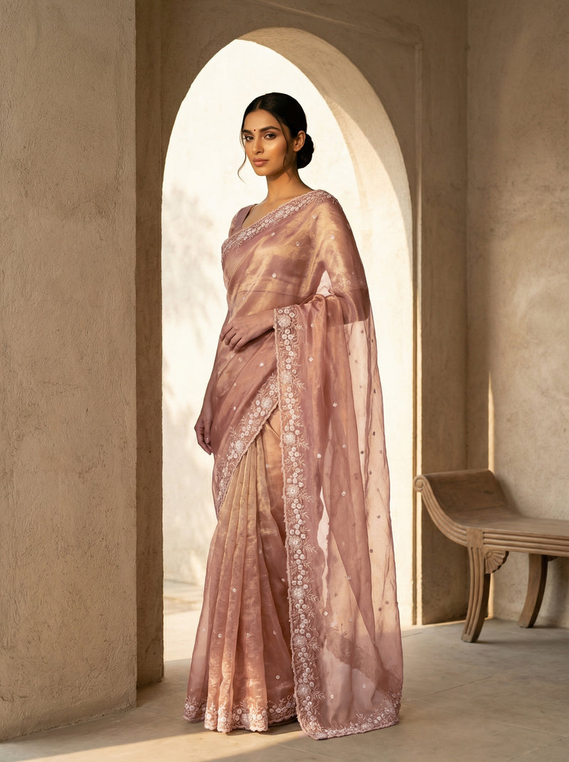 Elevate your ethnic wardrobe with this exquisite dark peach designer saree, meticulously crafted for the discerning wearer. Adorned with intricate beadwork and sequin embellishments, this saree features ornate buttas scattered throughout the fabric and a lavishly embroidered border that commands attention. The rich dark peach hue complements all skin tones, while the detailed craftsmanship ensures you stand out at weddings, celebrations, and formal occasions. Perfect for those who appreciate traditional artistry combined with contemporary design sensibilities. Drape with confidence and grace.