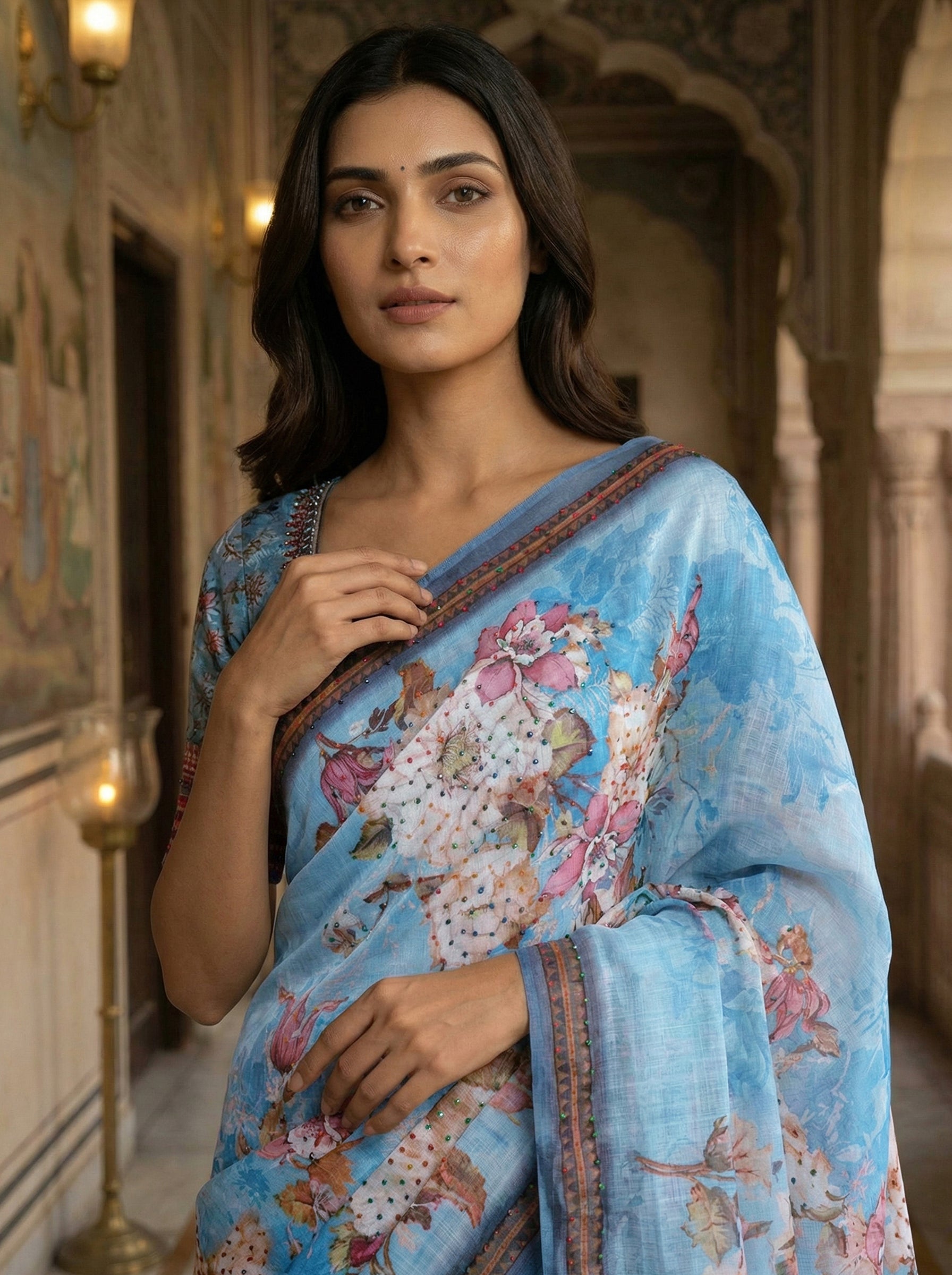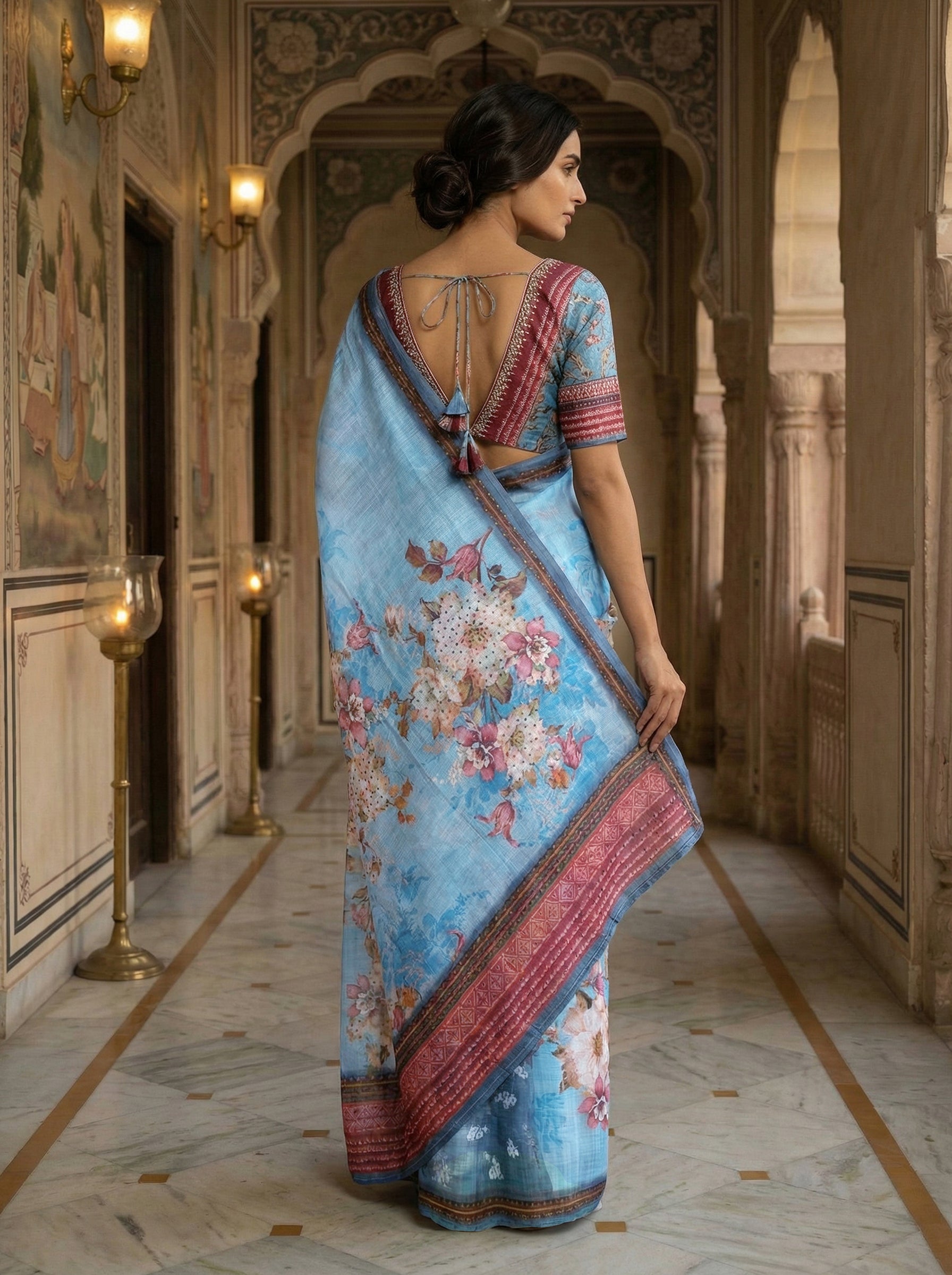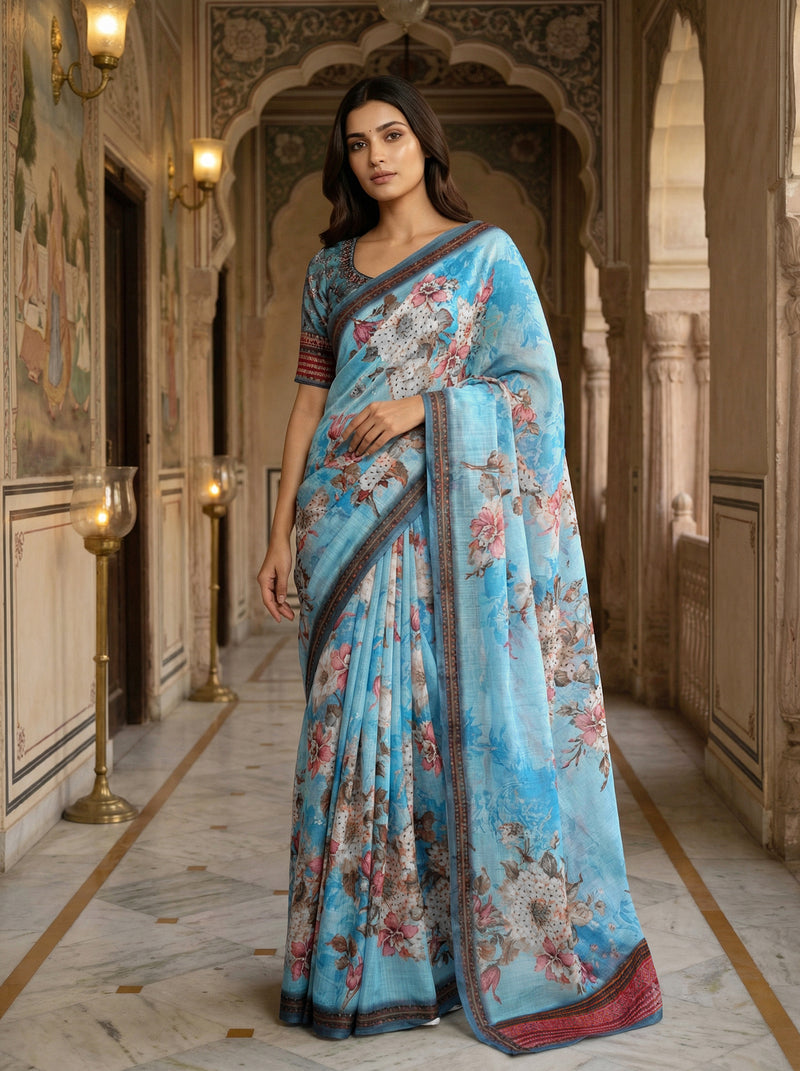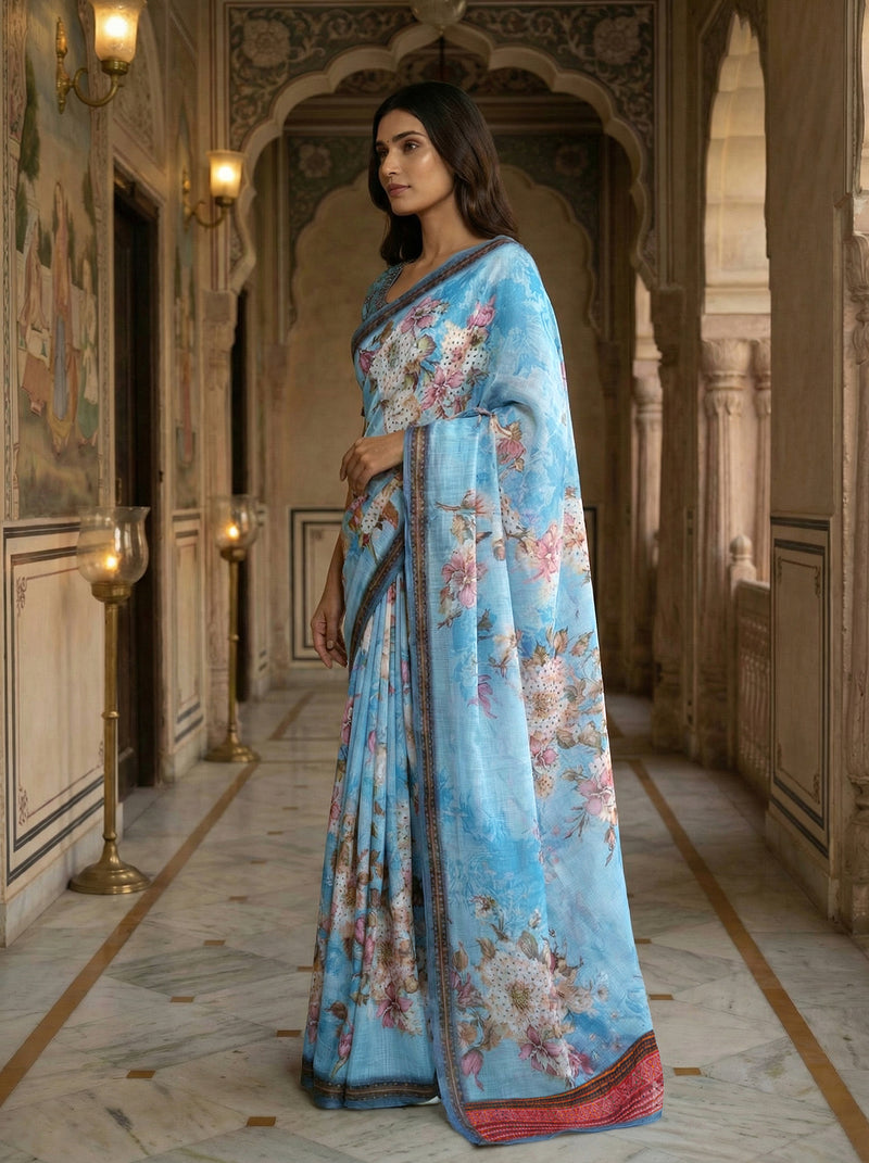 Blue Floral Printed Ethnic Wear Saree With Brown Printed Border