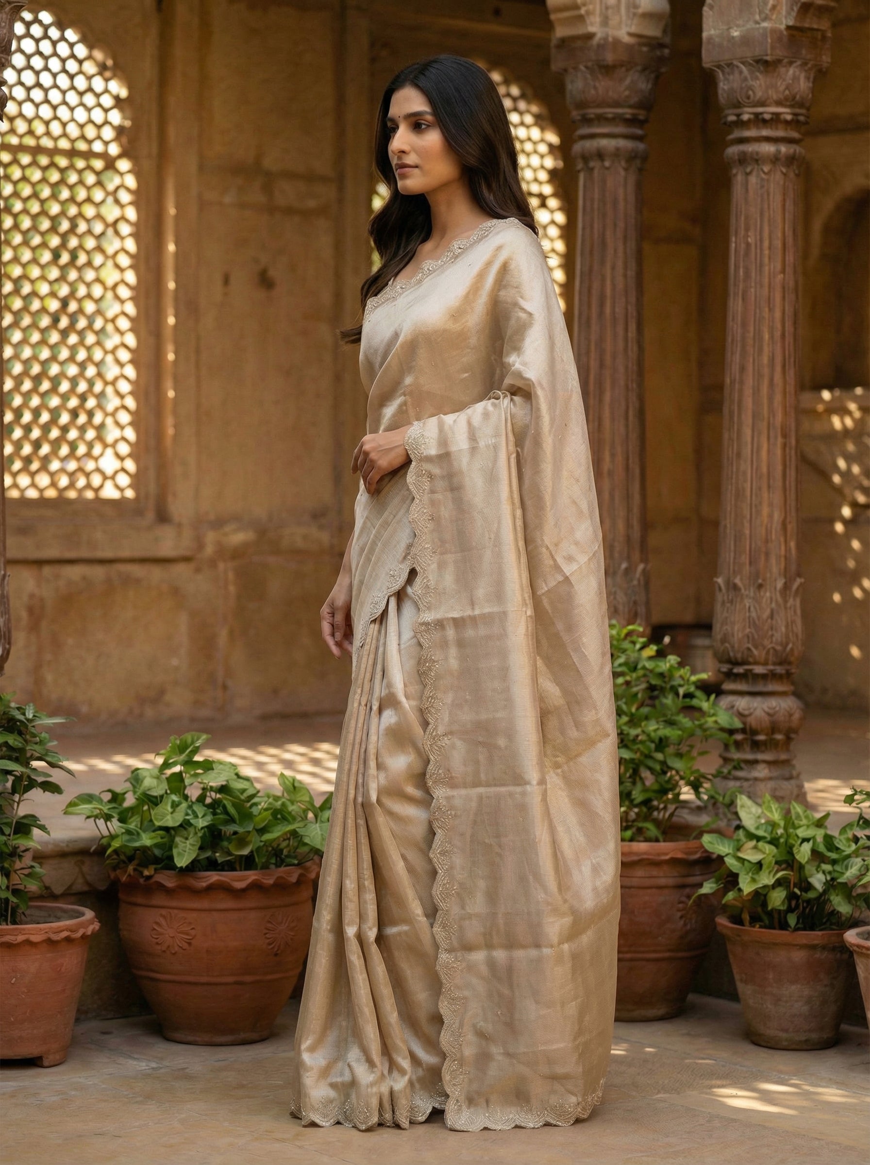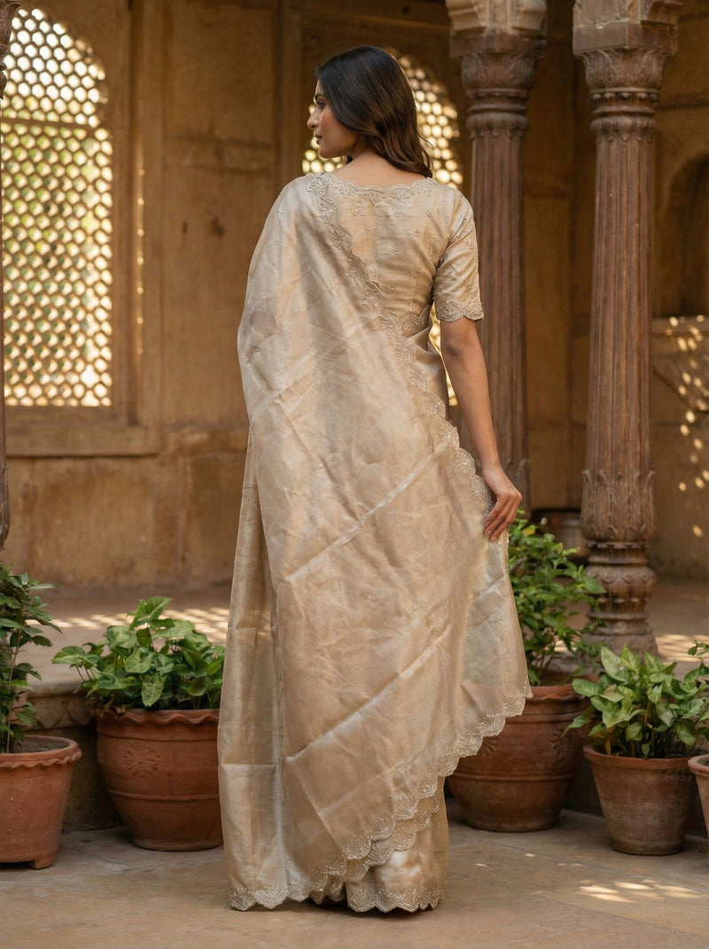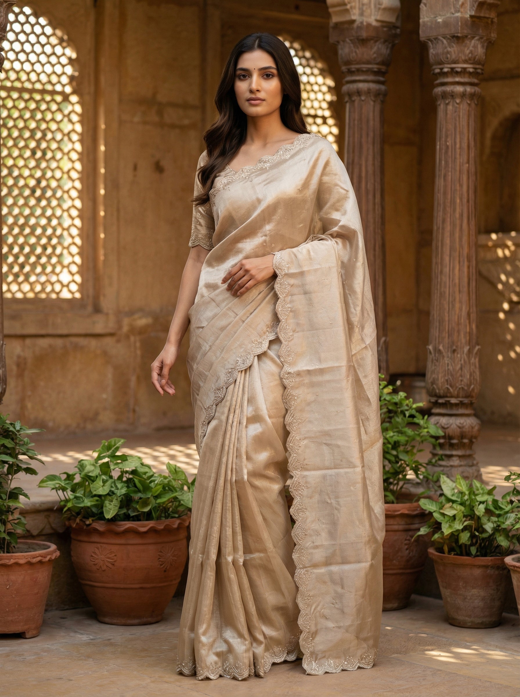 Cream Ethnic Wear Saree With Beads Worked Scallop Border