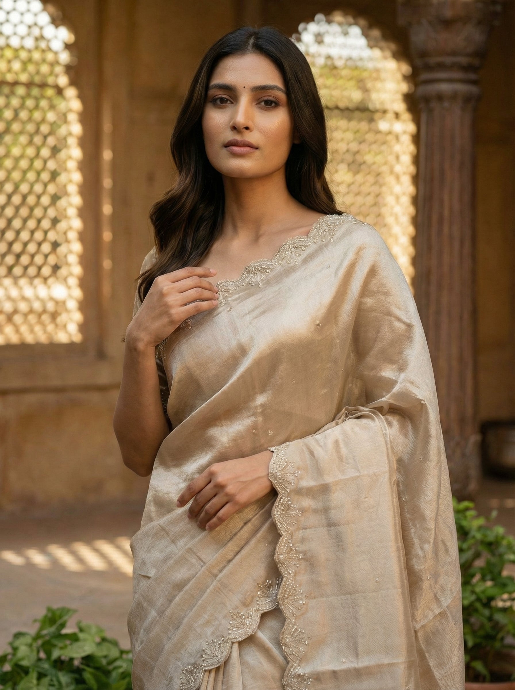 Elevate your ethnic wardrobe with this exquisite cream saree, a masterpiece of traditional craftsmanship. The saree features an intricately beaded scallop border that adds sophisticated dimension and movement to your silhouette. Crafted with meticulous attention to detail, the beadwork creates a refined textural contrast against the soft cream fabric, making it ideal for weddings, festivals, and formal celebrations. The scalloped edge design offers a contemporary twist on classic ethnic styling while maintaining timeless elegance. Perfect for those who appreciate quality artisanal work and seek a versatile piece that transitions seamlessly from daytime gatherings to evening events.