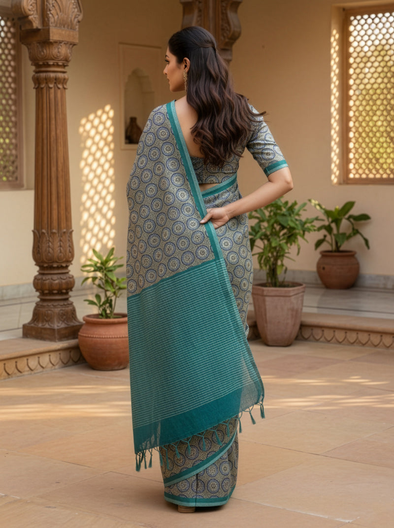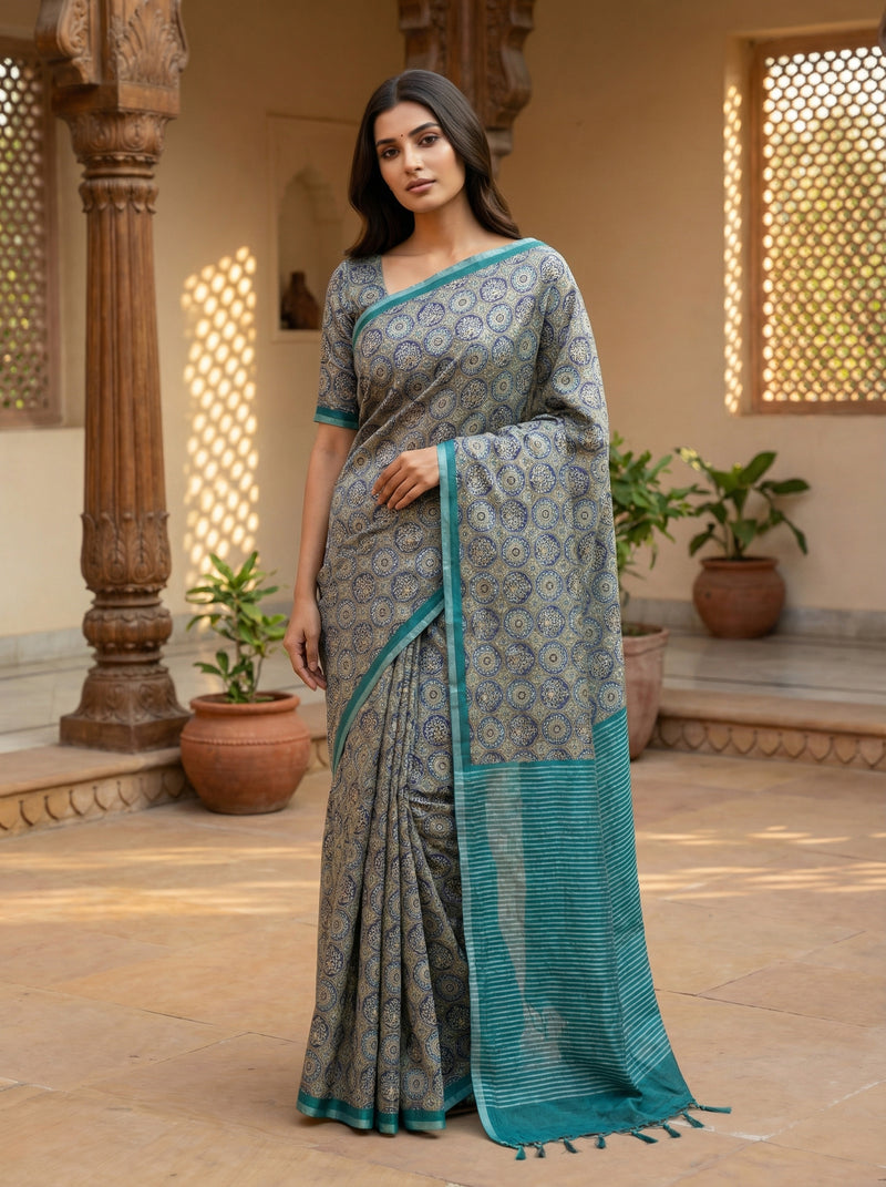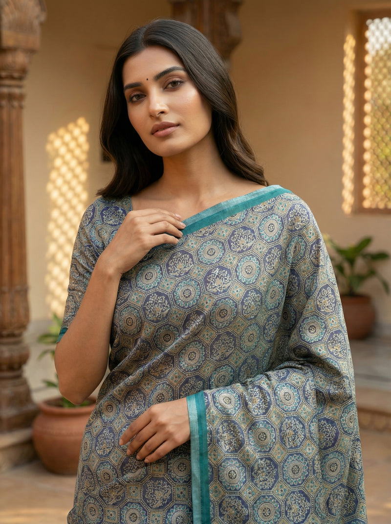 Teal Color Ajrak Printed Semi Tussar Saree