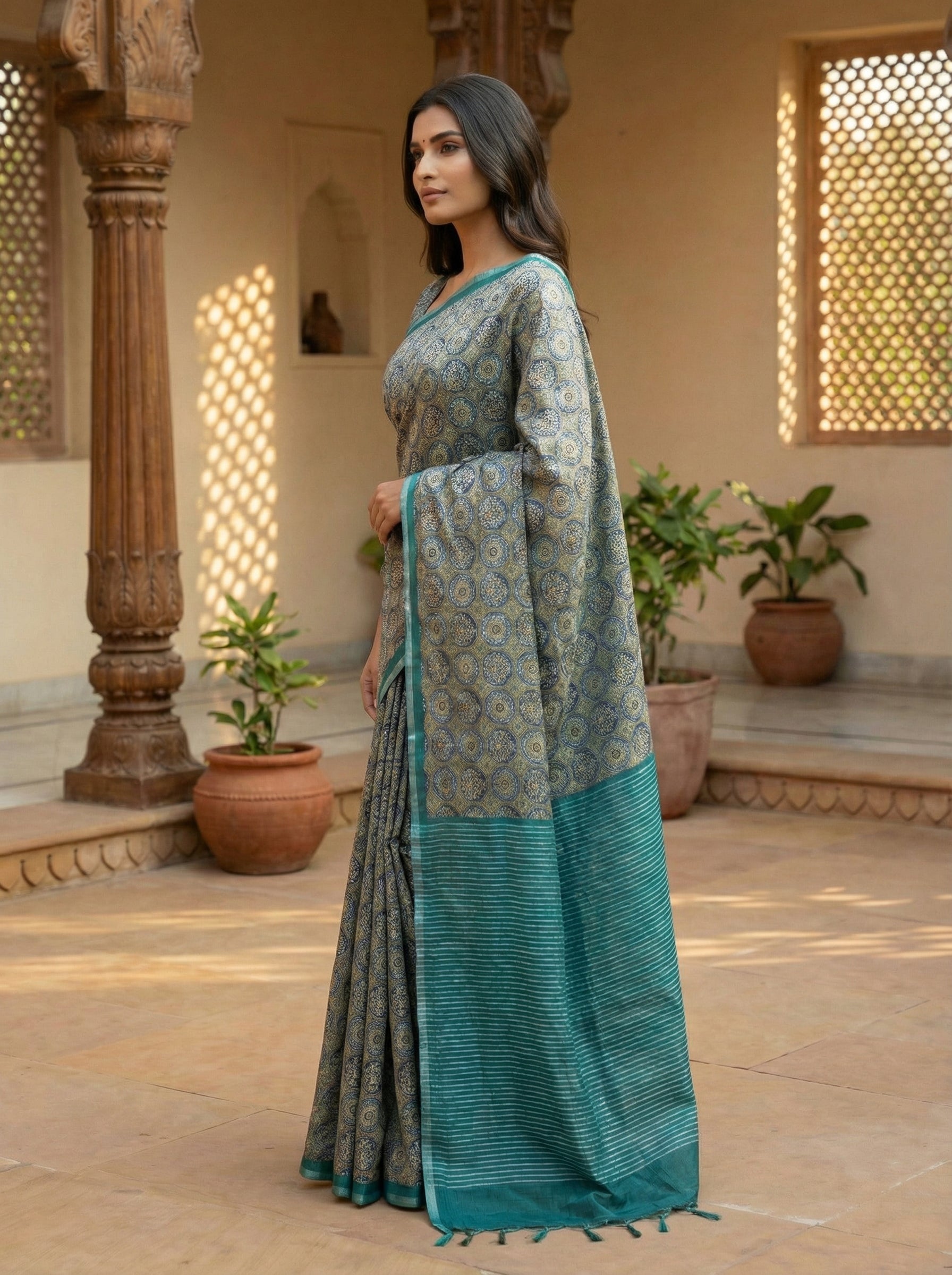 Elevate your ethnic wardrobe with this striking teal Ajrak printed semi-tussar saree, a masterpiece that seamlessly blends traditional craftsmanship with contemporary aesthetics. The intricate Ajrak print showcases the heritage of block-printing techniques, while the semi-tussar fabric offers a luxurious drape with a subtle sheen. The solid teal border frames the saree with understated elegance, while the striped teal pallu adds visual interest and movement. Perfect for festive occasions, celebrations, or making a refined statement at cultural events, this saree combines comfort with timeless style. The natural texture of semi-tussar ensures breathability, making it ideal for year-round wear.