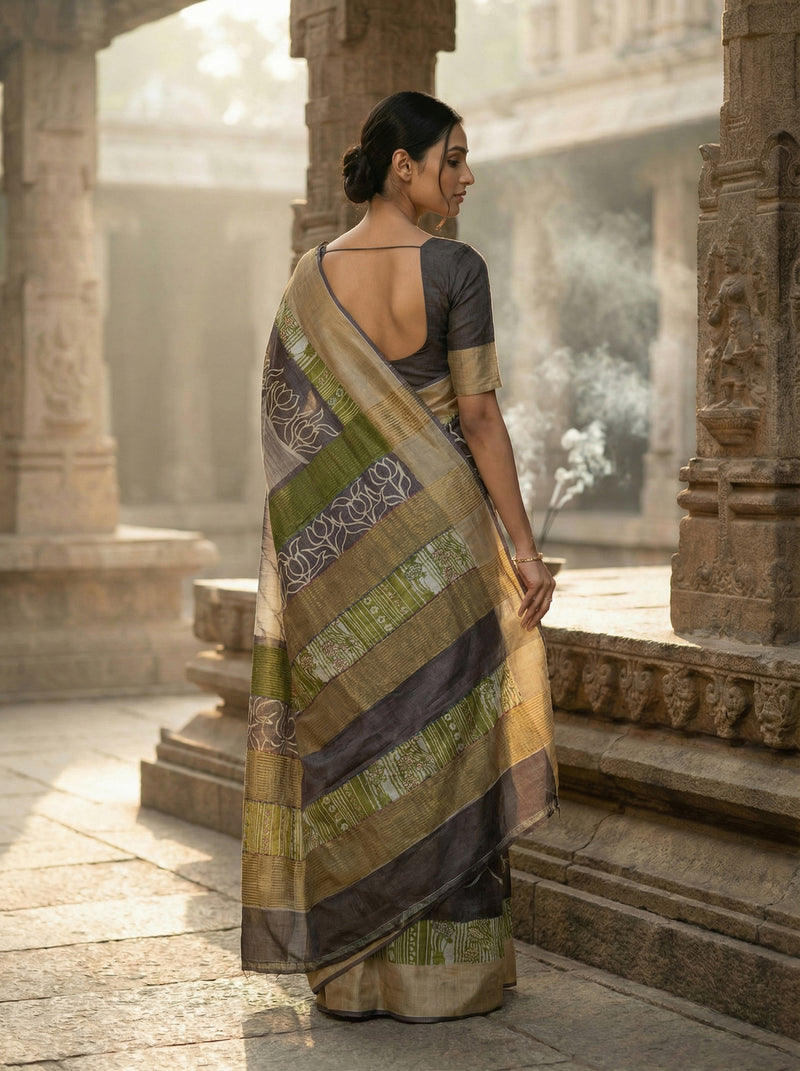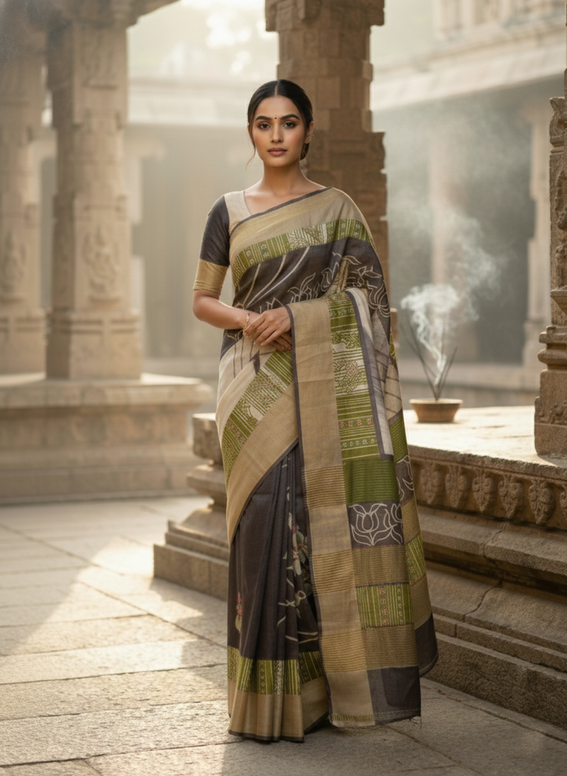 Dark Grey Olive Green Printed Tusser Silk Saree