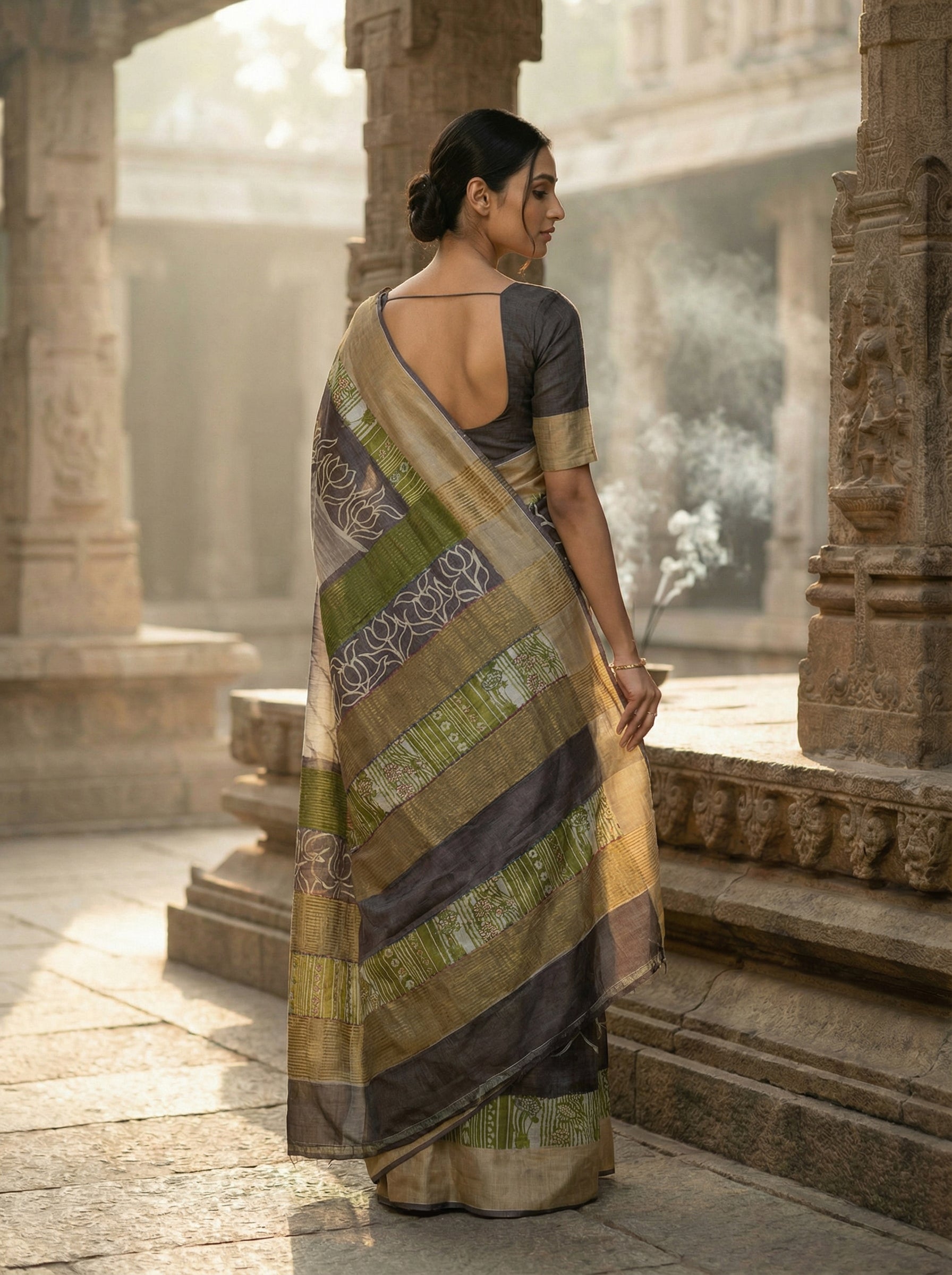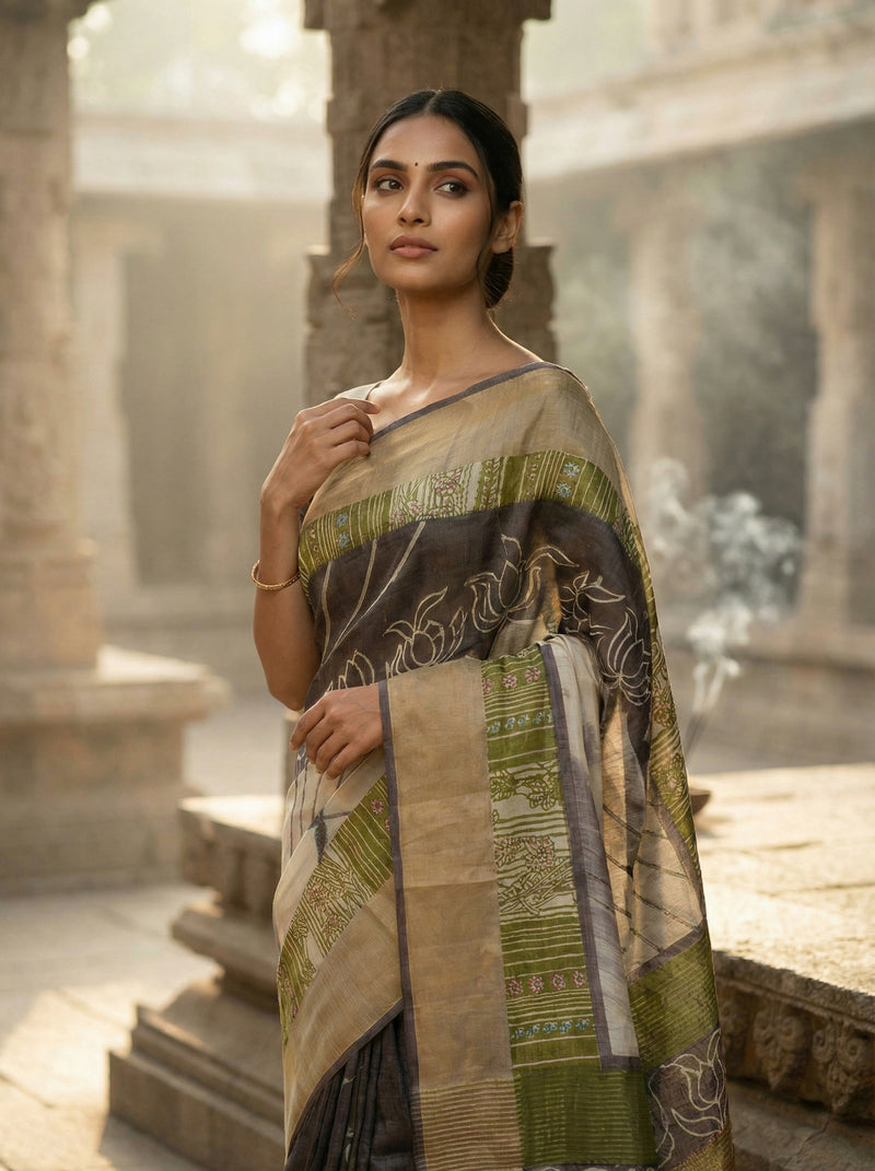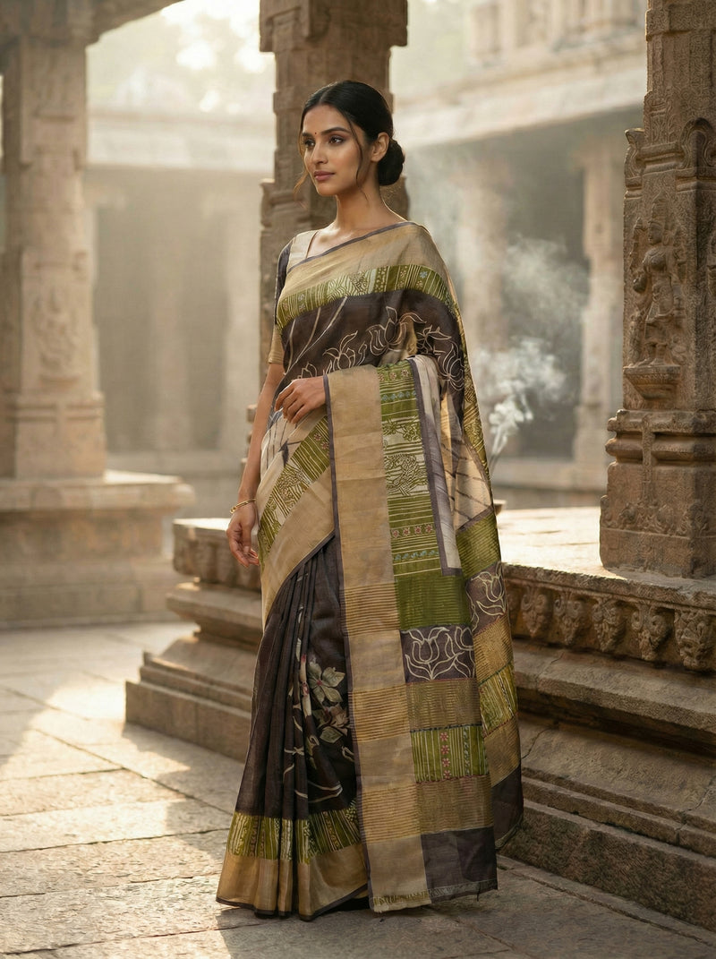 Elevate your ethnic wardrobe with this sophisticated tusser silk saree, featuring an exquisite blend of dark grey and olive green hues. The printed design showcases traditional craftsmanship with contemporary appeal, making it versatile for both festive occasions and everyday elegance. Tusser silk's natural texture provides a luxurious drape while maintaining breathability, ideal for India's warm climate. The rich color palette complements various skin tones and pairs effortlessly with classic jewelry. Perfect for celebrations, weddings, or refined casual gatherings, this saree embodies timeless grace and authentic artisanal quality.