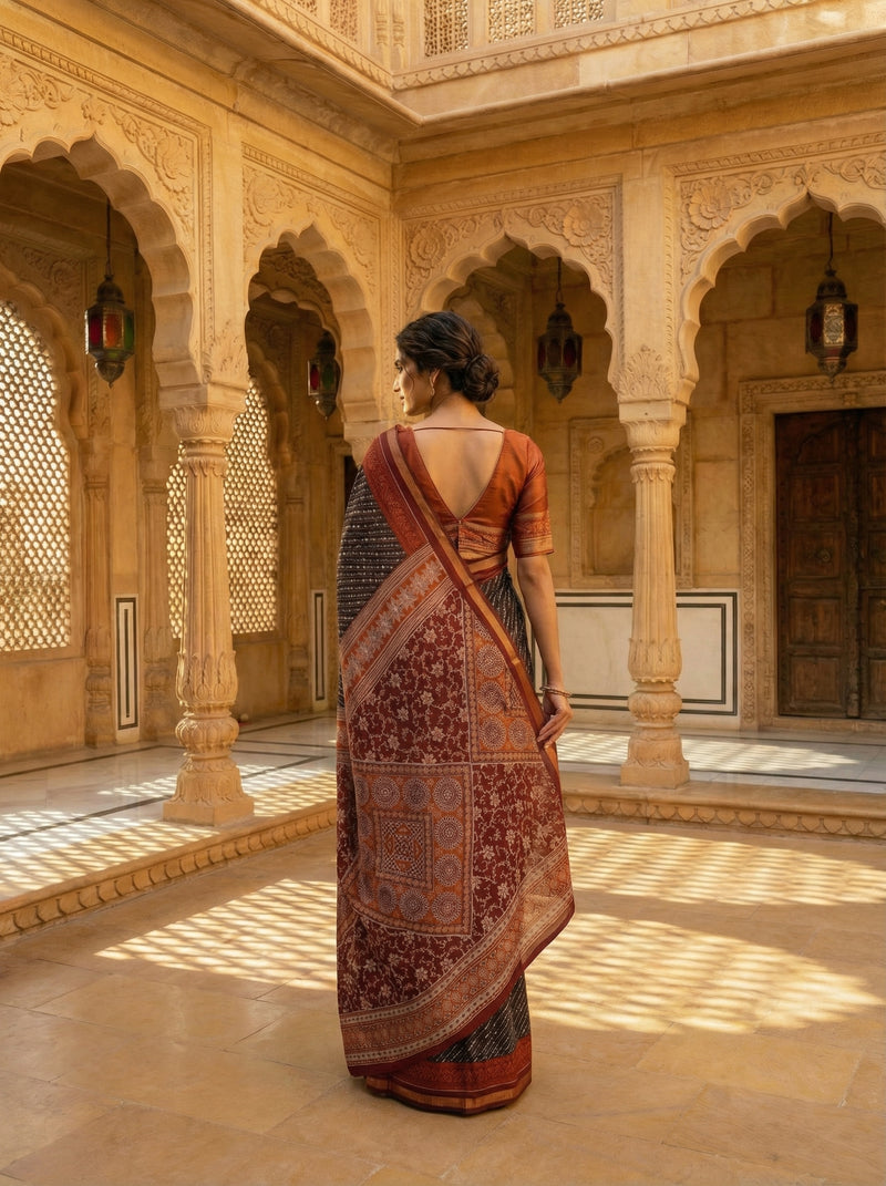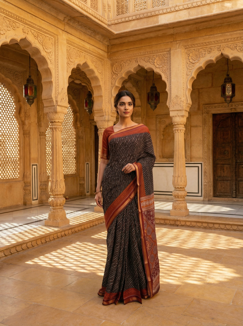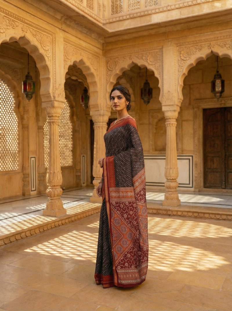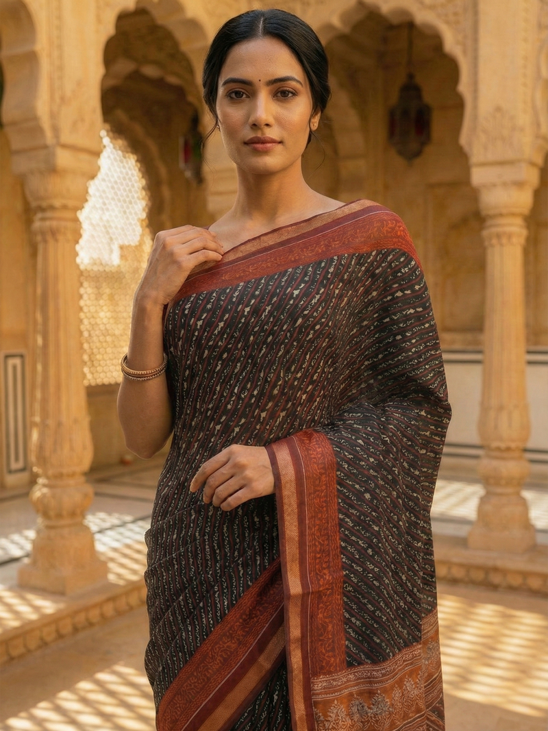 Black Printed Cotton Saree With Maroon Kasavu Border And Pallu This elegant cotton saree showcases a striking black base adorned with intricate printed patterns, complemented by a rich maroon Kasavu border that frames the drape beautifully. The matching maroon Kasavu pallu adds a sophisticated finishing touch, creating a cohesive and refined look. Crafted from premium cotton, this saree offers exceptional comfort and breathability, making it ideal for both everyday wear and special occasions. The traditional Kasavu detailing reflects authentic South Indian weaving heritage, while the contemporary print design ensures versatile styling options. Perfect for those who appreciate timeless elegance with a modern sensibility.
