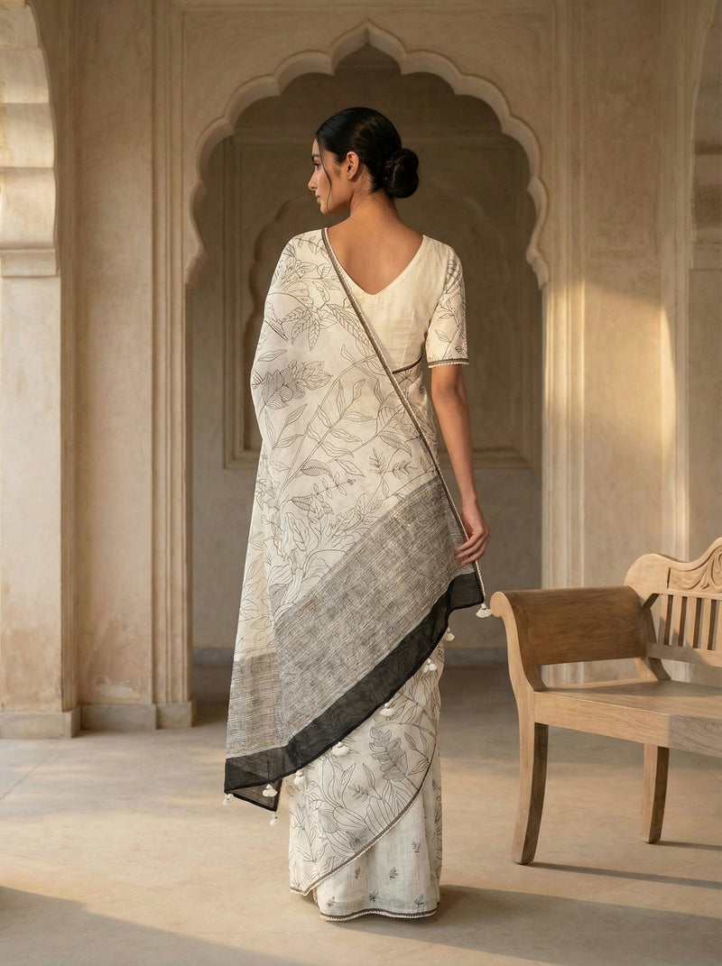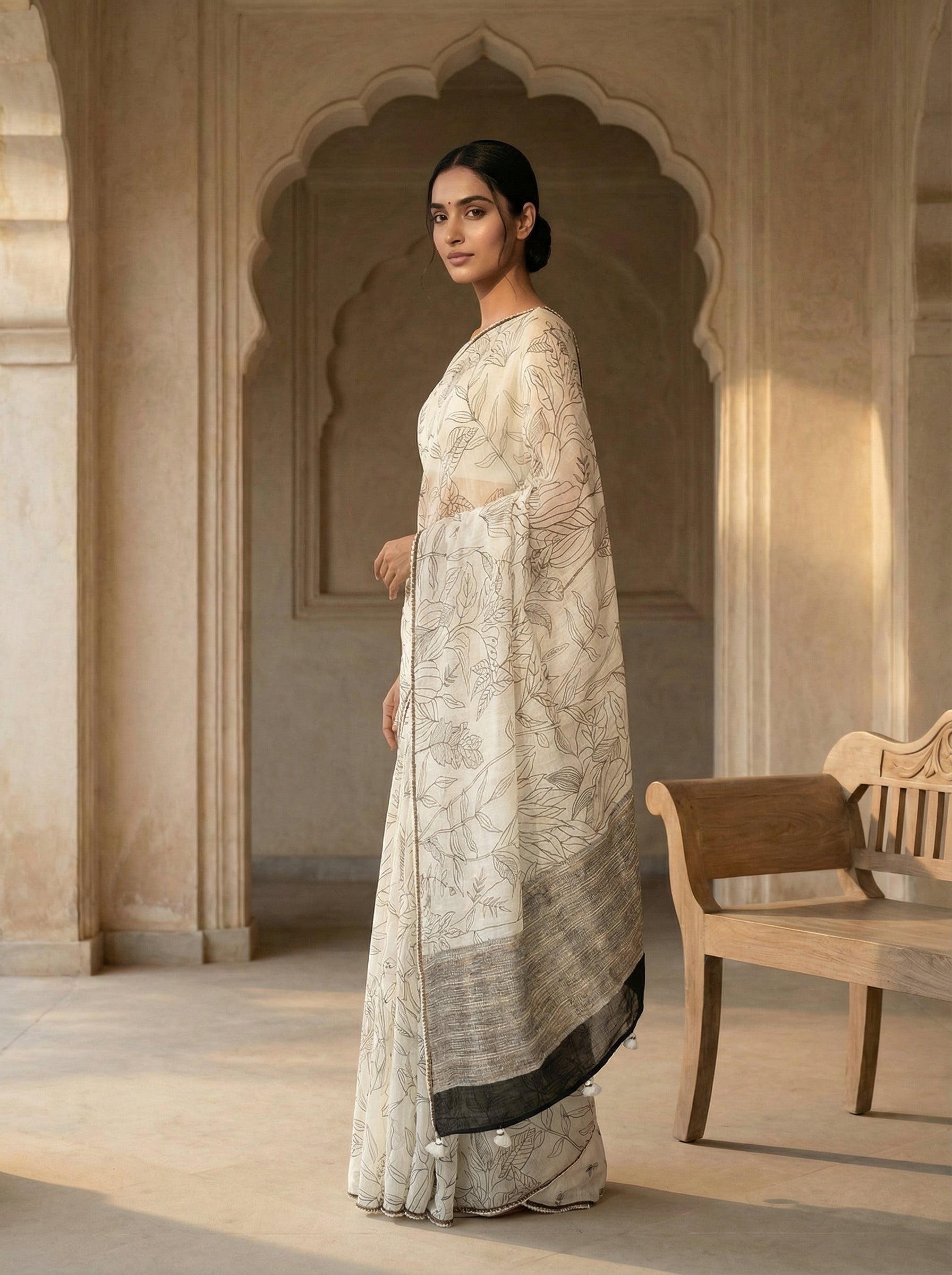 Elevate your ethnic wardrobe with this sophisticated white Tusser silk saree, a timeless piece that seamlessly blends tradition with contemporary aesthetics. The fabric showcases the natural texture and subtle sheen characteristic of Tusser silk, known for its durability and breathable comfort. Intricate black botanical print designs adorn the body, creating an elegant visual narrative across the drape. Refined black thin borders frame the saree with understated sophistication, while the pallu features delicate black striped detailing that adds dimension without overwhelming the overall composition. Perfect for festive occasions, formal gatherings, or refined everyday elegance, this saree demonstrates the craftsmanship Kalyan Silks is renowned for.