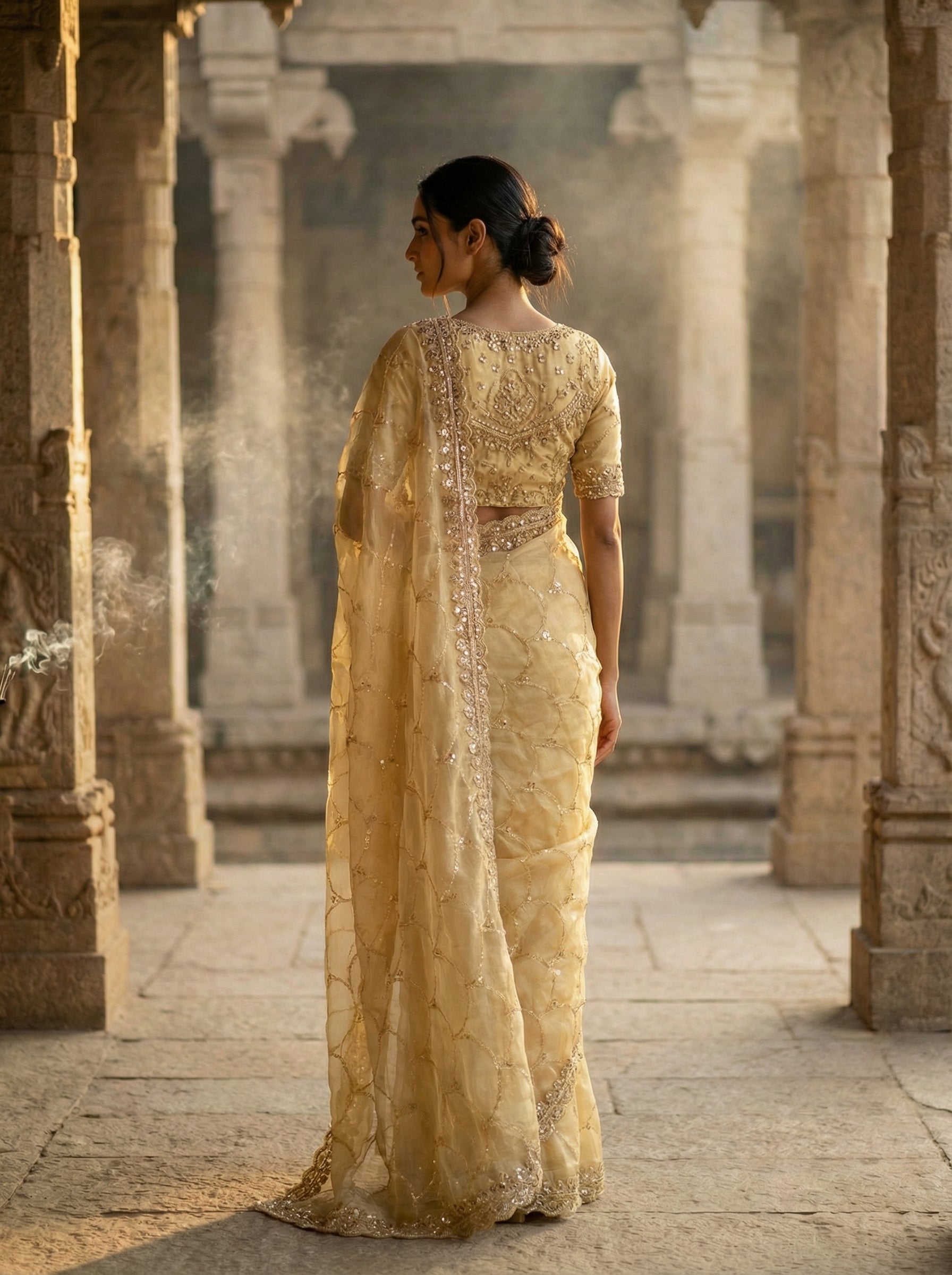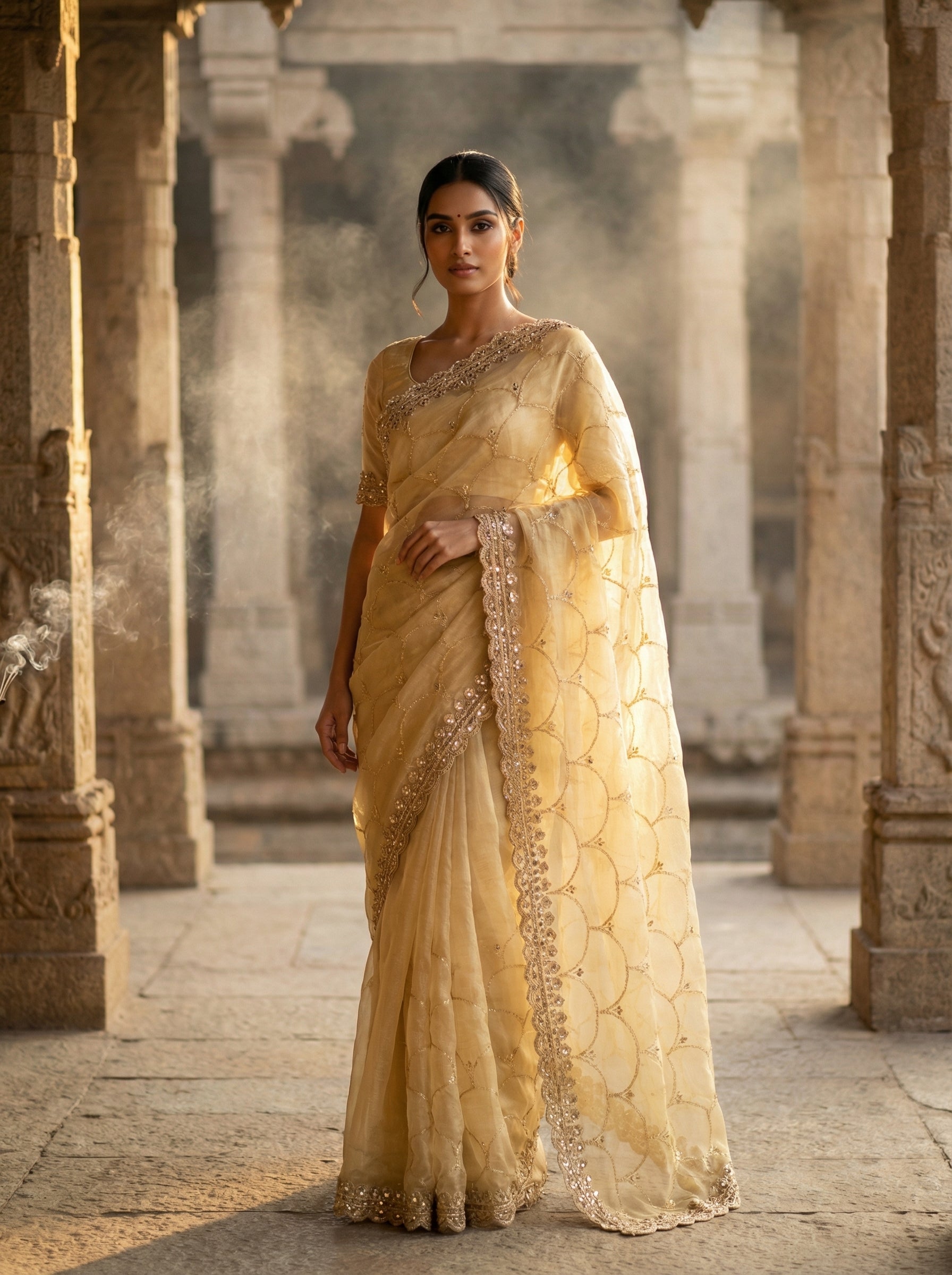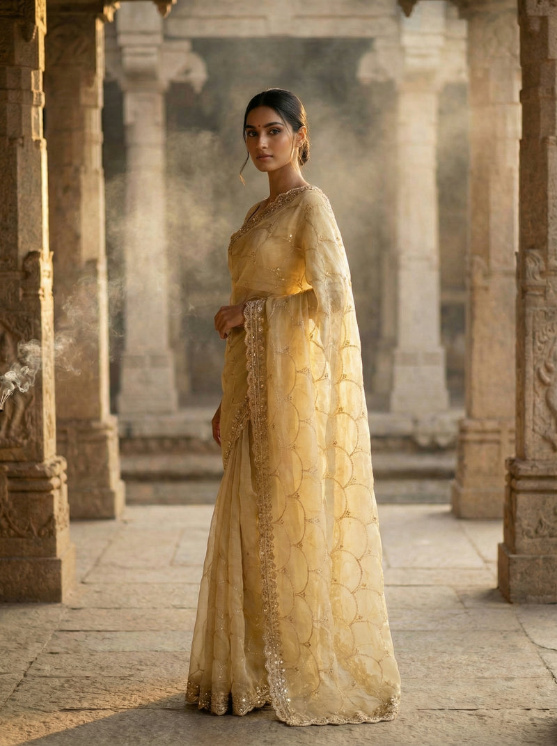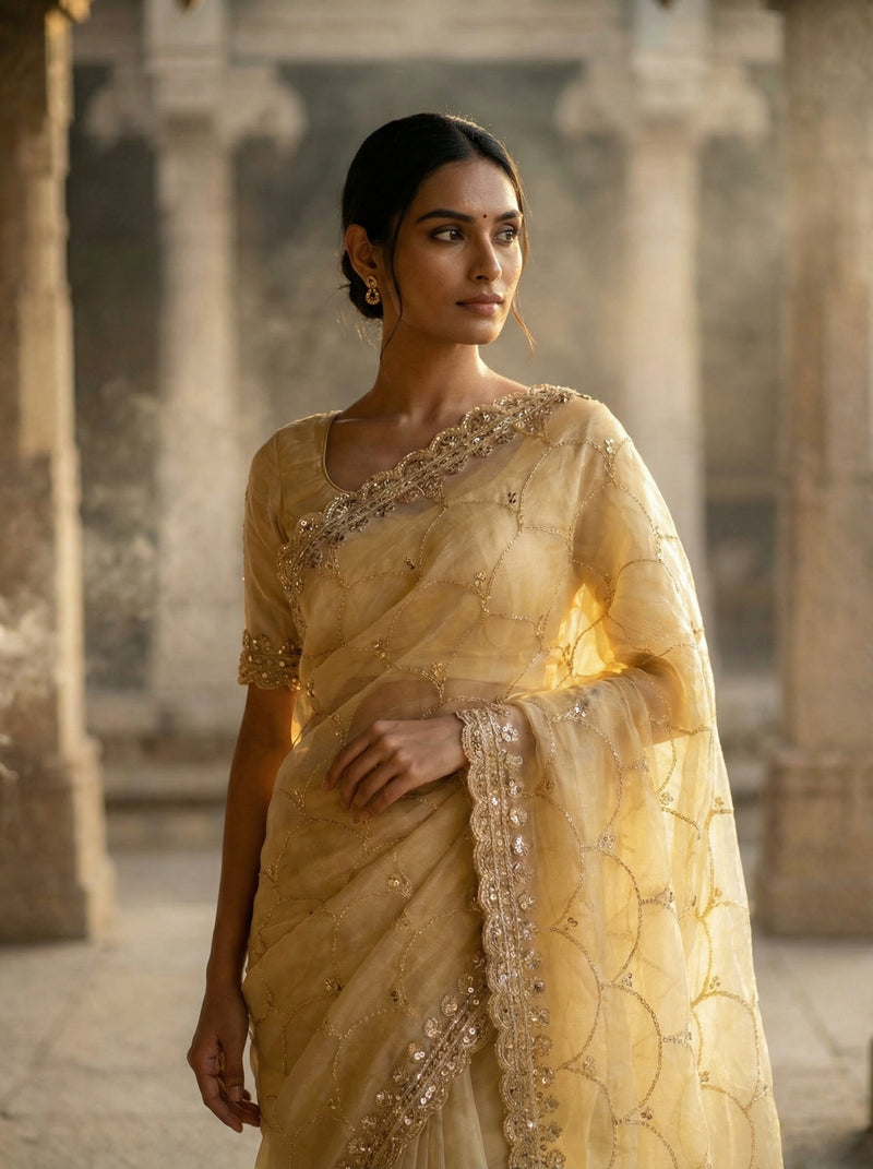Elevate your ethnic wardrobe with this exquisite cream designer saree, meticulously crafted with intricate beadwork and sequin embellishments adorning the entire body. The saree features a spectacular heavily embroidered border that commands attention, making it an ideal choice for weddings, festivals, and special occasions. The delicate interplay of beads and sequins creates a luminous finish that catches light beautifully, ensuring you stand out with understated elegance. Perfect for the discerning woman who appreciates traditional craftsmanship combined with contemporary design sensibilities.