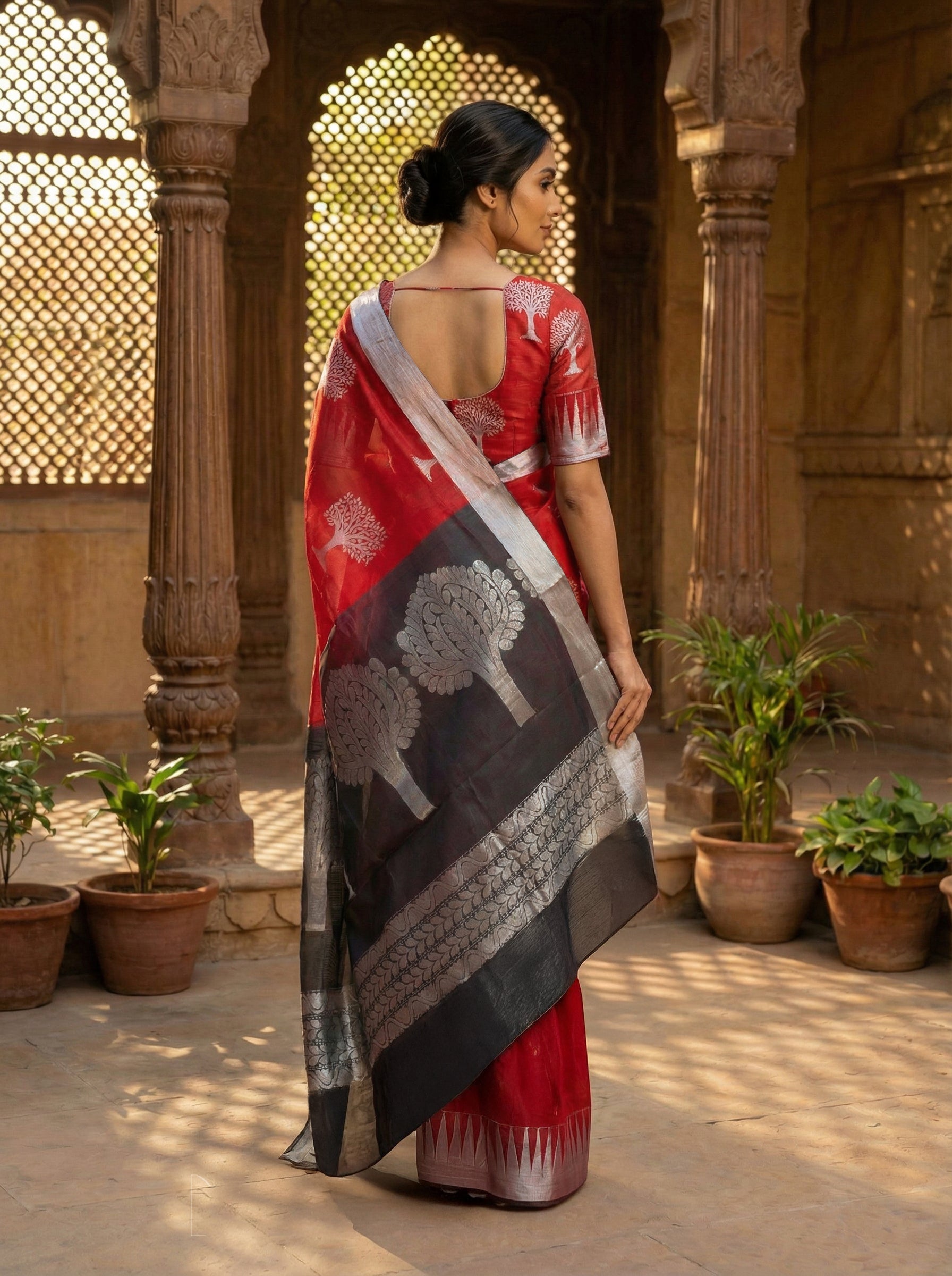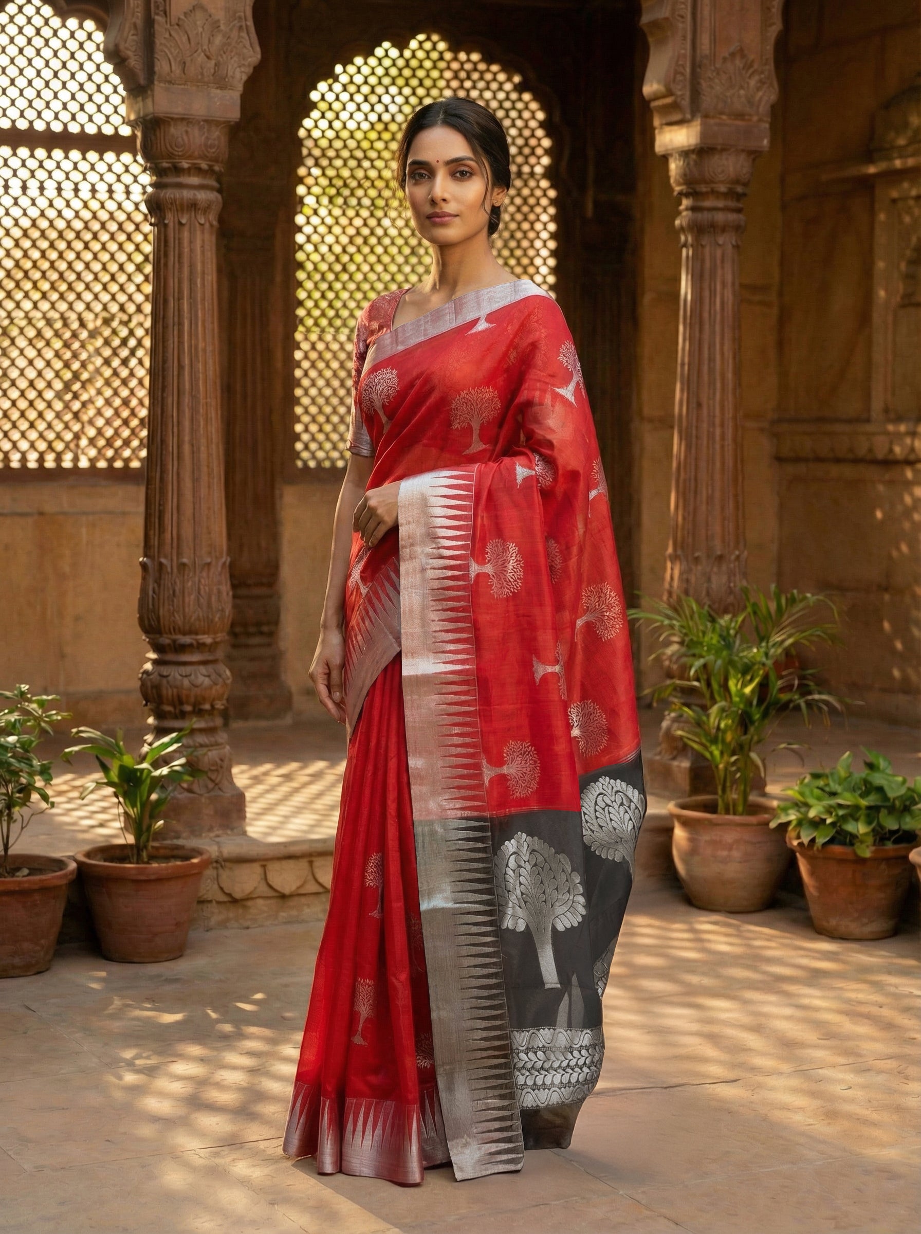 Elevate your ethnic wardrobe with this stunning Red Sayanora Saree, a masterpiece of traditional craftsmanship. The rich crimson body is adorned with intricate silver tree buttas scattered throughout, creating an elegant and sophisticated aesthetic. The saree features a striking green pallu embellished with delicate silver designs, offering a beautiful contrast that enhances its visual appeal. Perfect for festive occasions, weddings, and celebrations, this saree combines timeless elegance with contemporary styling. The meticulous detailing and premium fabric quality make it an investment piece that promises to turn heads and create lasting impressions at any event.
