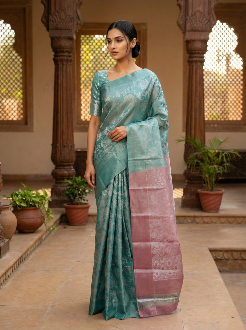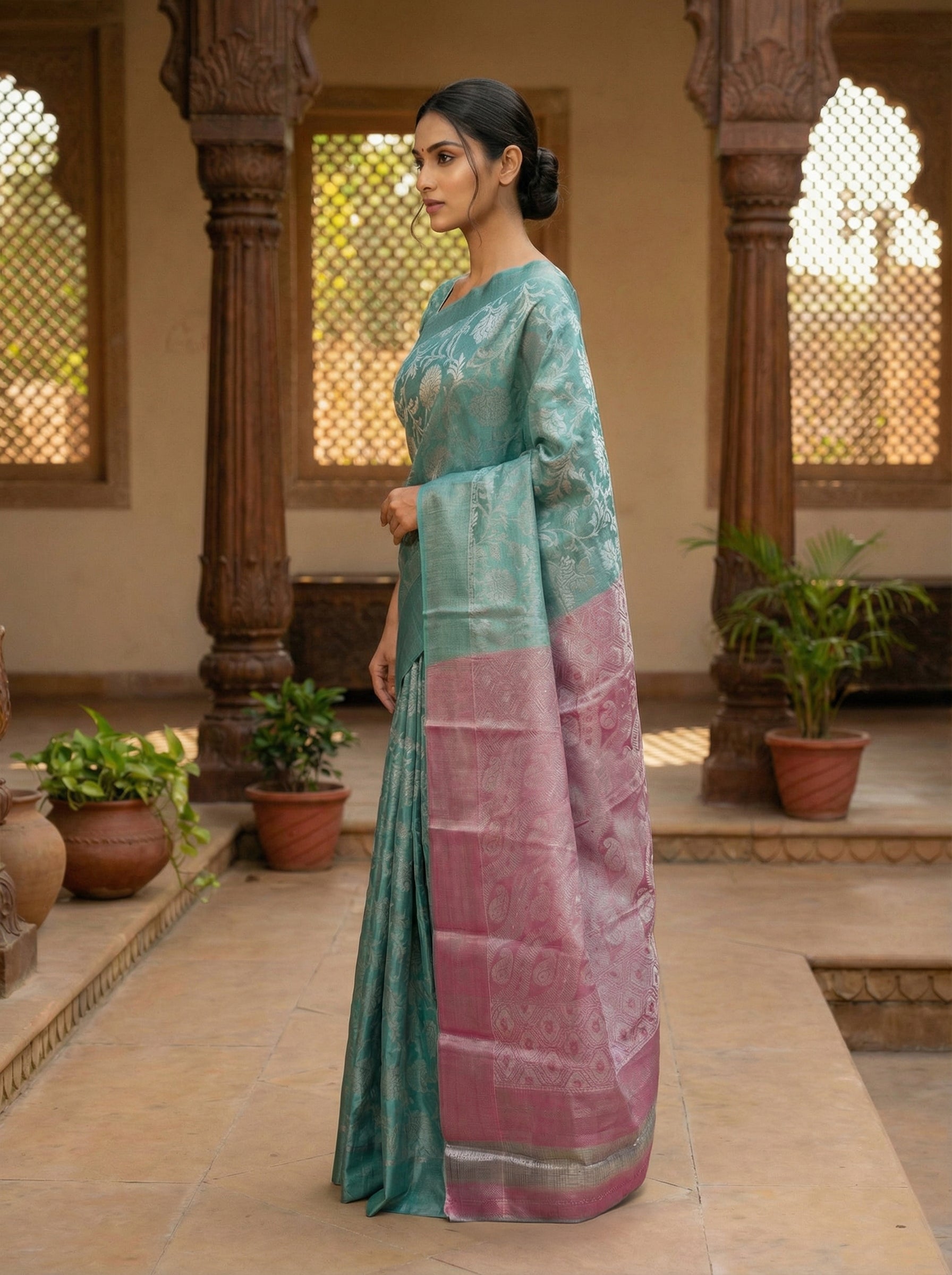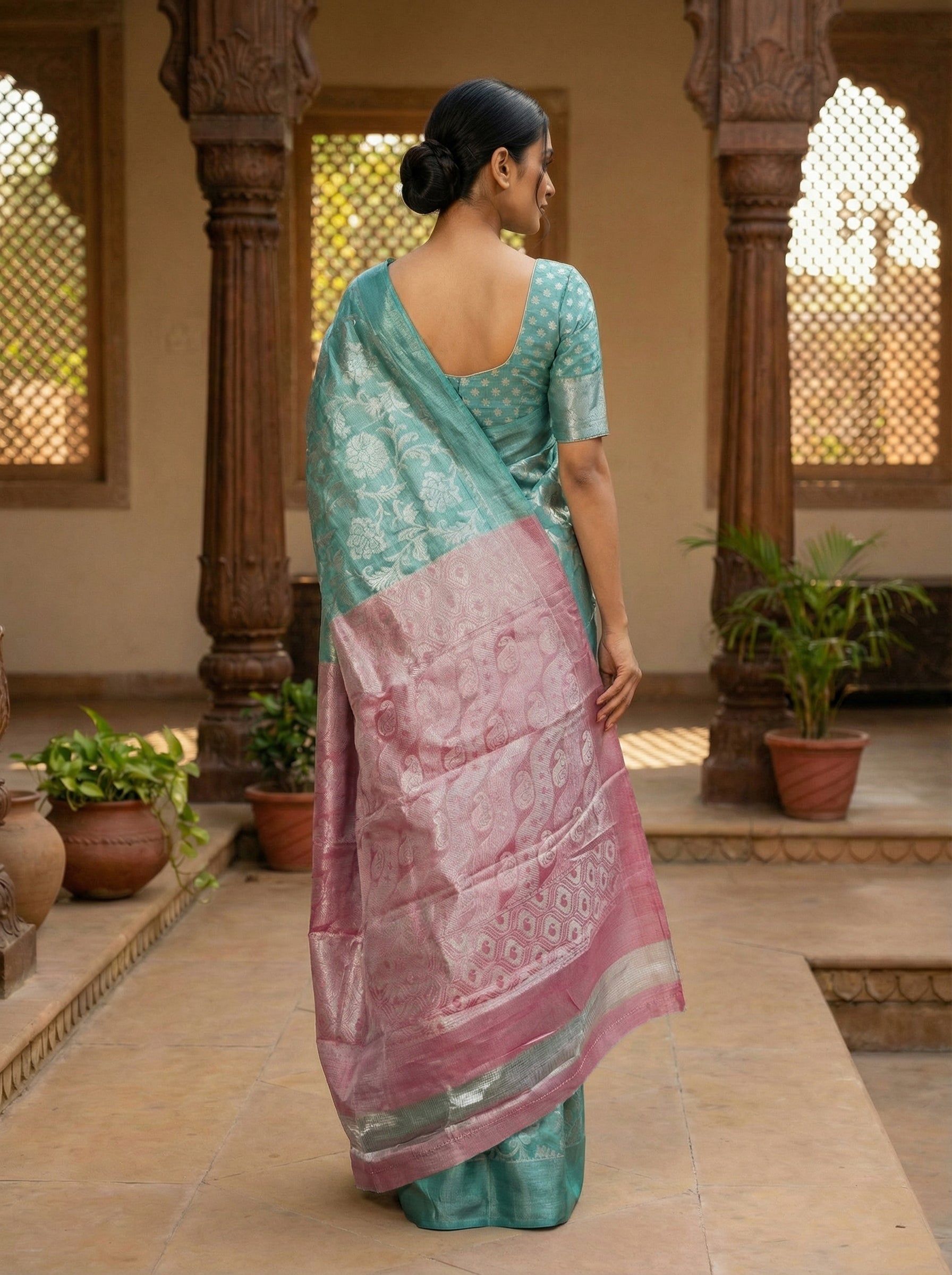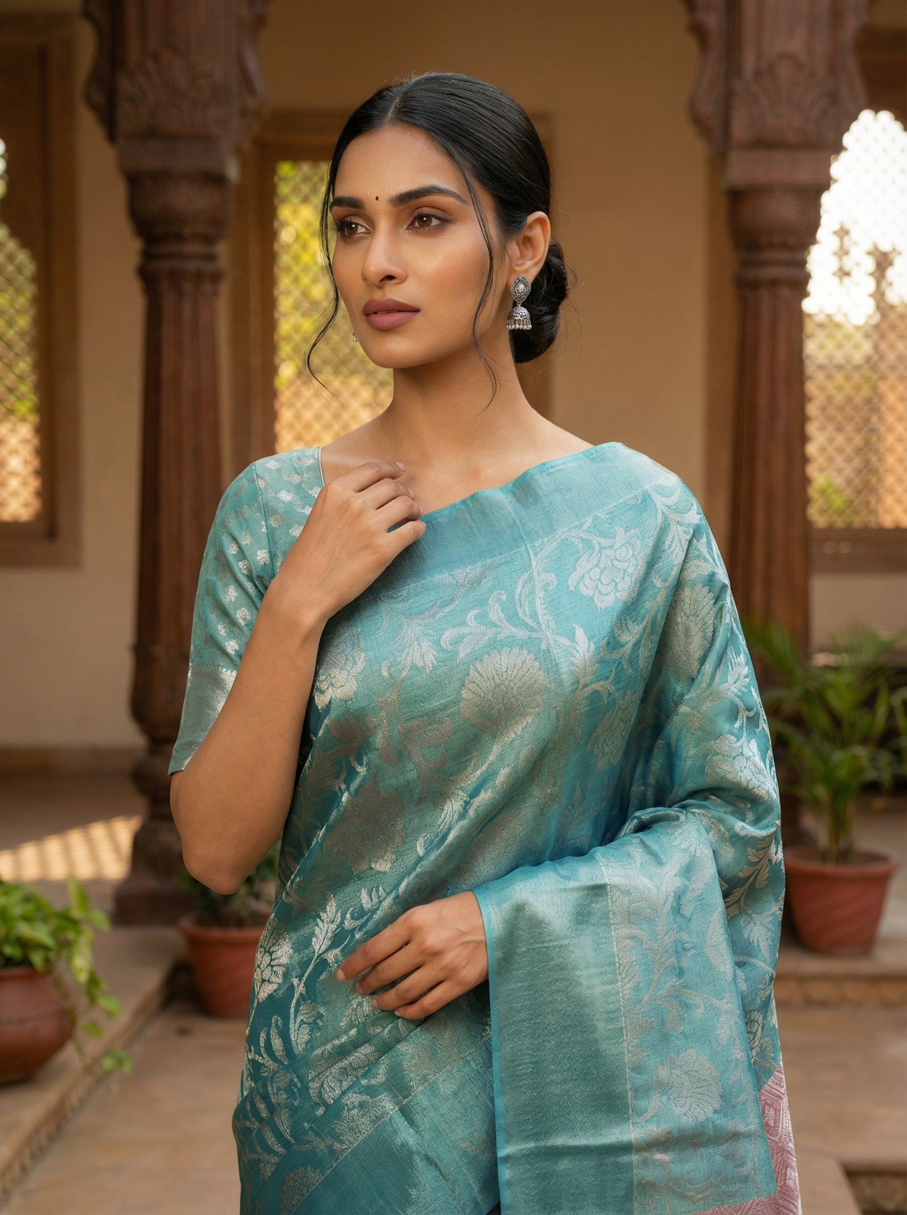 Elevate your ethnic wardrobe with this stunning Blue Sayanora Saree, a masterpiece of traditional craftsmanship. The rich blue fabric is adorned with intricate silver zari floral motifs that dance across the body, creating an elegant and sophisticated aesthetic. The pallu features a complementary pink zari design that adds a striking contrast and draws attention to this statement piece. Perfect for weddings, festivals, and special occasions, this saree combines timeless elegance with contemporary styling. The meticulous zari work showcases premium quality and attention to detail, making it an investment piece for the discerning wearer who appreciates authentic Indian textiles.