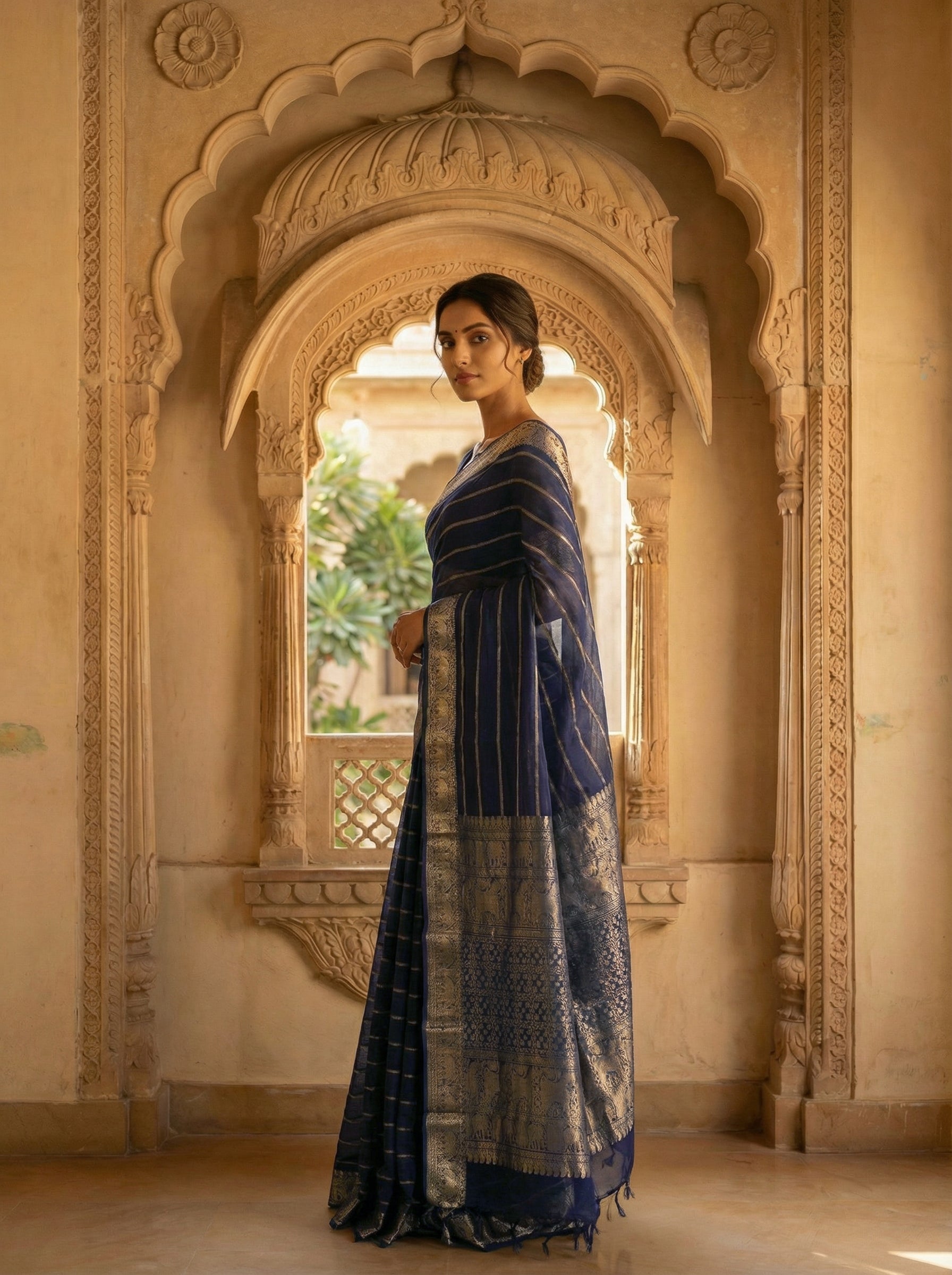 Elevate your everyday elegance with this navy blue striped cotton saree, a masterpiece that seamlessly blends traditional craftsmanship with contemporary style. The fine cotton fabric offers exceptional breathability and comfort, making it ideal for warm climates and extended wear. The distinctive elephant motif rendered in lustrous zari embroidery adorns the border, adding a touch of regal sophistication and cultural richness. The vertical striping creates a flattering silhouette while maintaining the saree's classic appeal. Perfect for casual gatherings, festive occasions, or daily celebrations, this versatile piece showcases the timeless artistry of Indian textile traditions while delivering practical wearability.