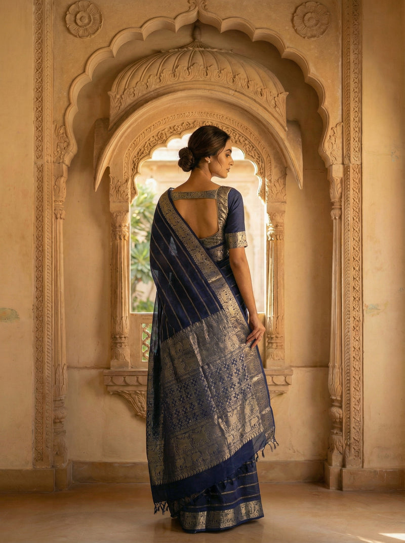 Navy Blue Striped Cotton Saree With Elephant Zari Border