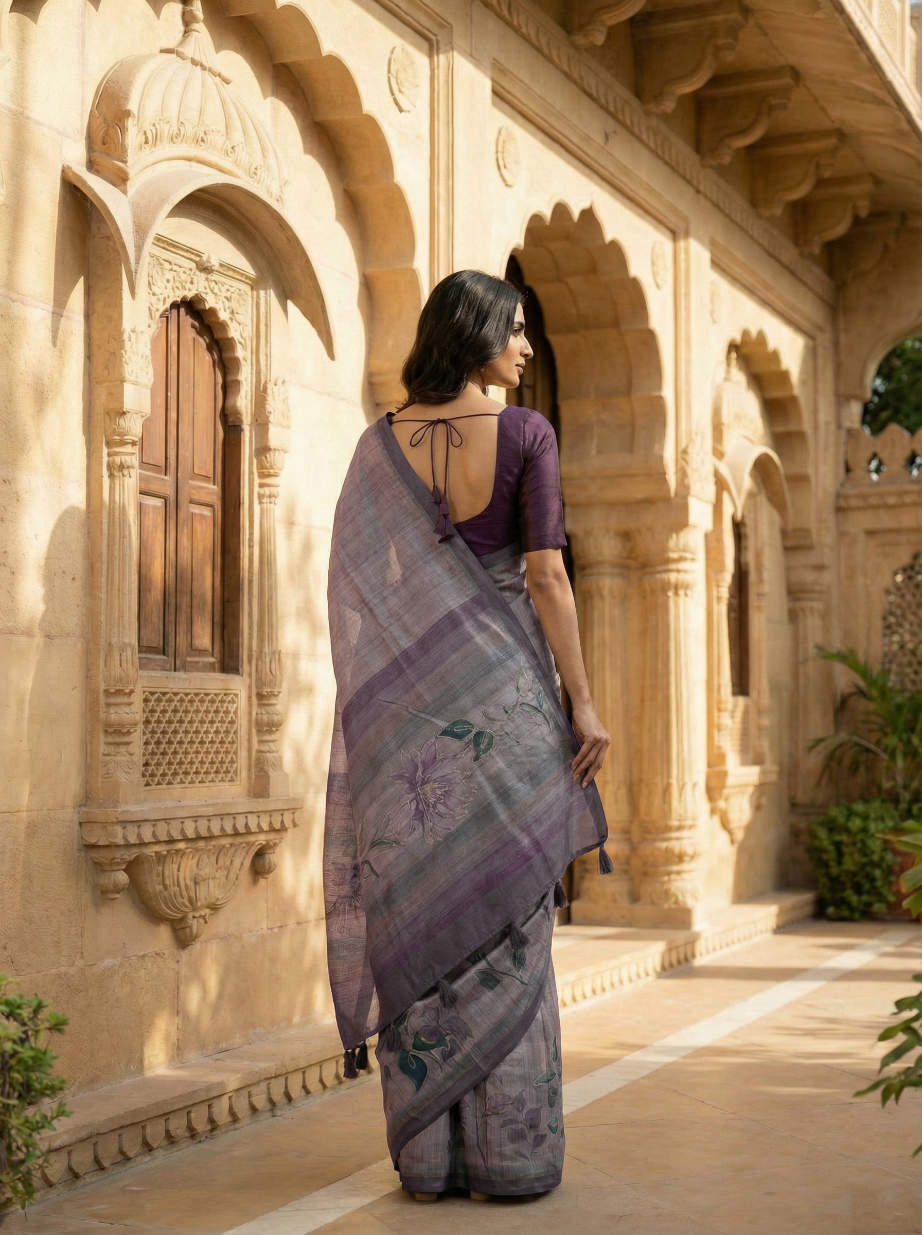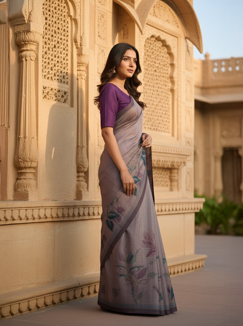 Elevate your ethnic wardrobe with this sophisticated pastel brown semi-tussar saree, a perfect blend of tradition and contemporary elegance. The saree features an intricately leaf-printed border that adds botanical charm, complemented by a delicate thin light brown border for refined detailing. The striped pallu showcases a modern geometric pattern, creating visual interest while maintaining the saree's graceful drape. Semi-tussar fabric offers a subtle sheen and comfortable wear for both festive occasions and everyday celebrations. This versatile piece pairs effortlessly with traditional jewelry and classic styling for a polished, timeless look.