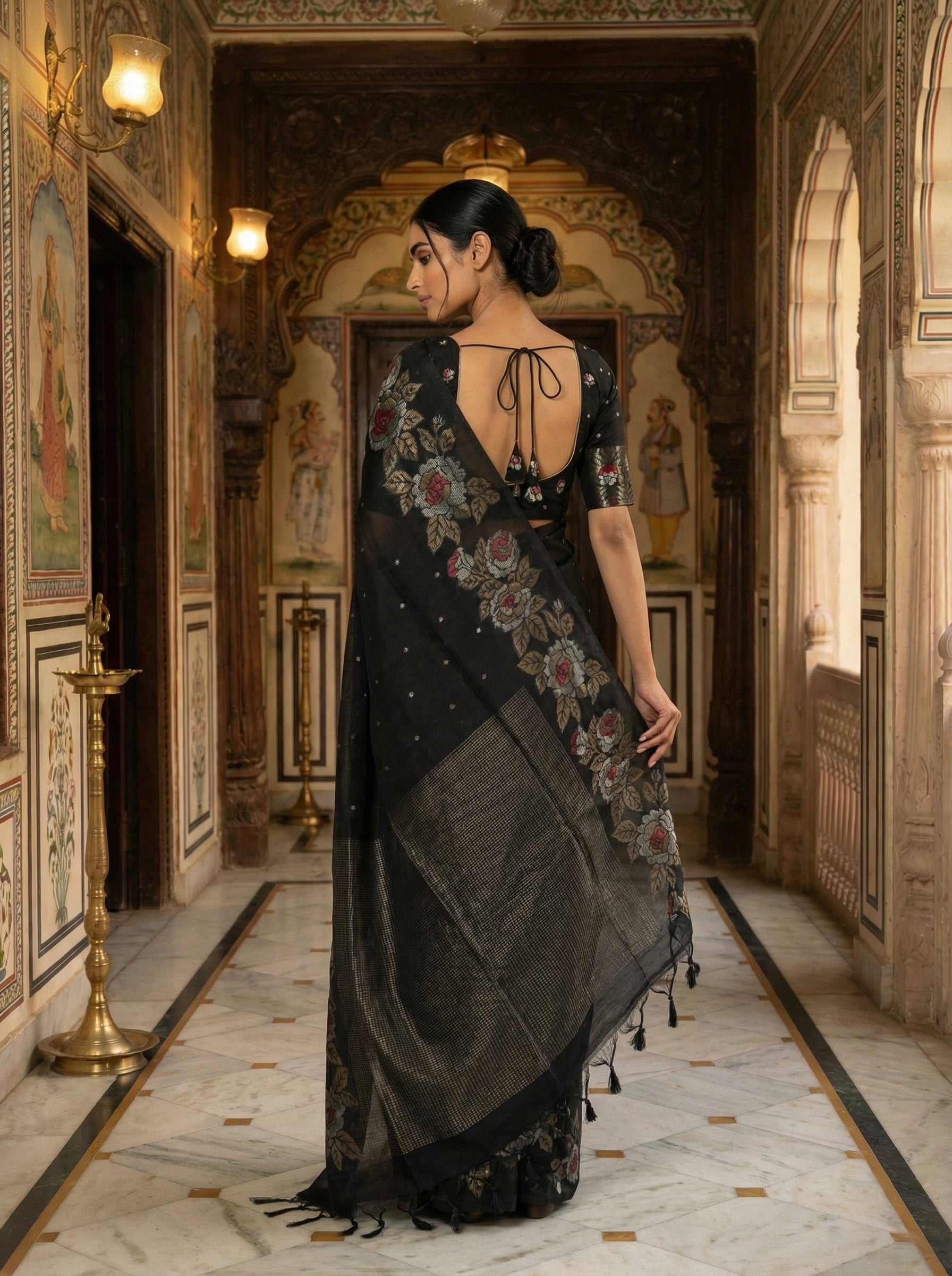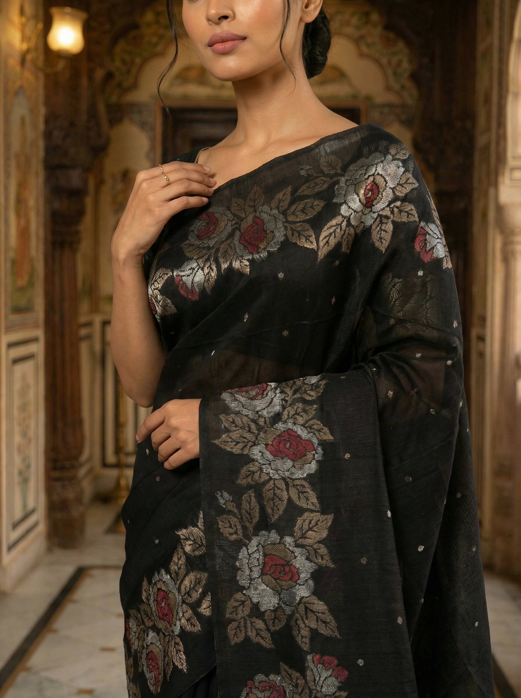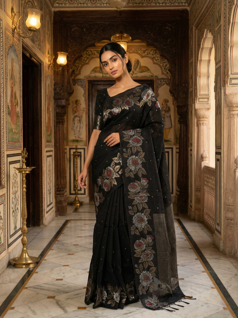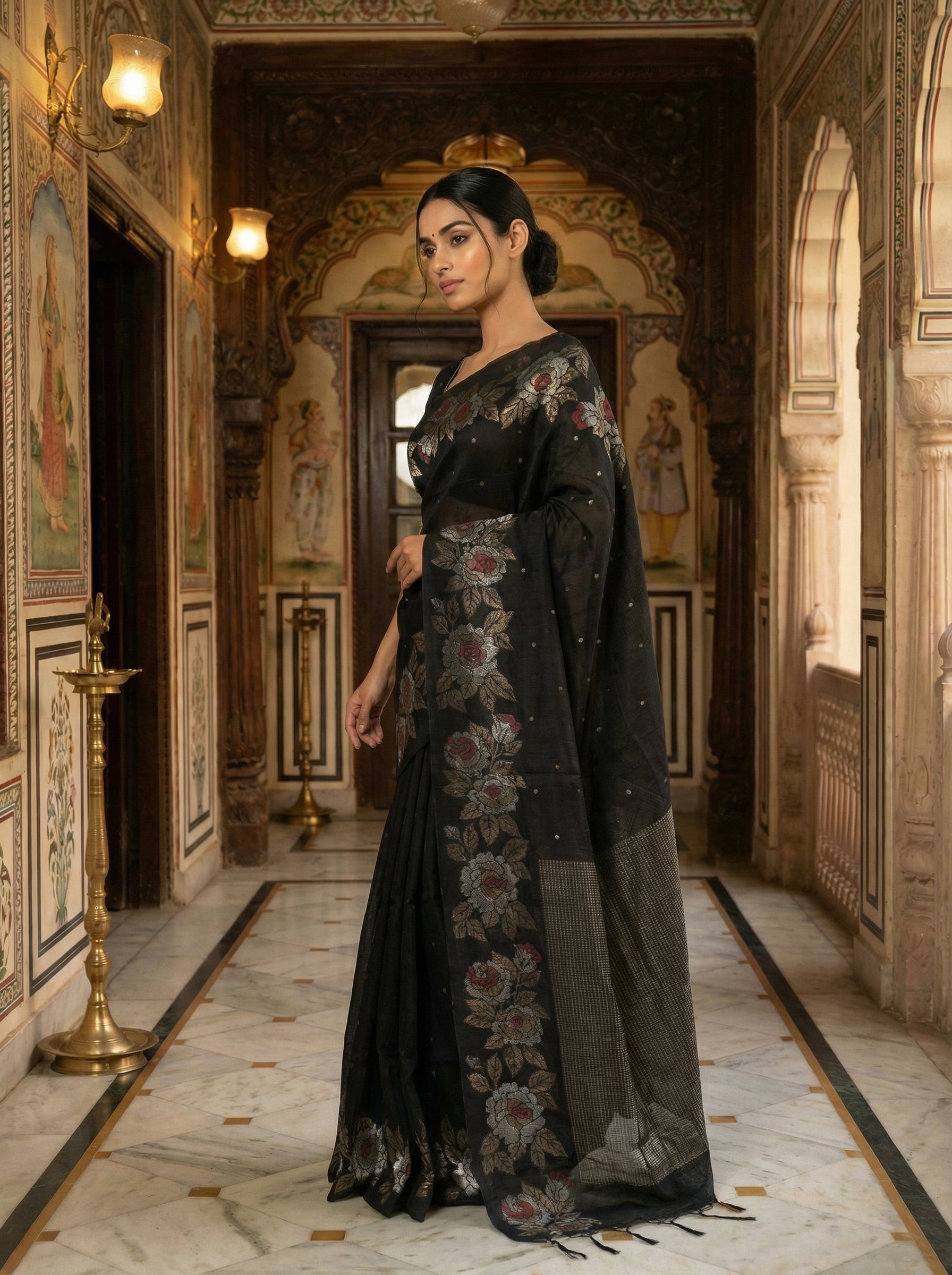 Elevate your ethnic wardrobe with this striking semi-tussar saree that seamlessly blends contemporary and traditional aesthetics. The deep black base features delicate white polka dots scattered across the entire body, creating an understated yet sophisticated visual appeal. The saree is finished with an intricately woven floral border that adds a touch of timeless elegance. Semi-tussar fabric offers a subtle sheen and comfortable drape, making it ideal for both festive occasions and refined everyday wear. Perfect for those who appreciate classic designs with modern sensibility.