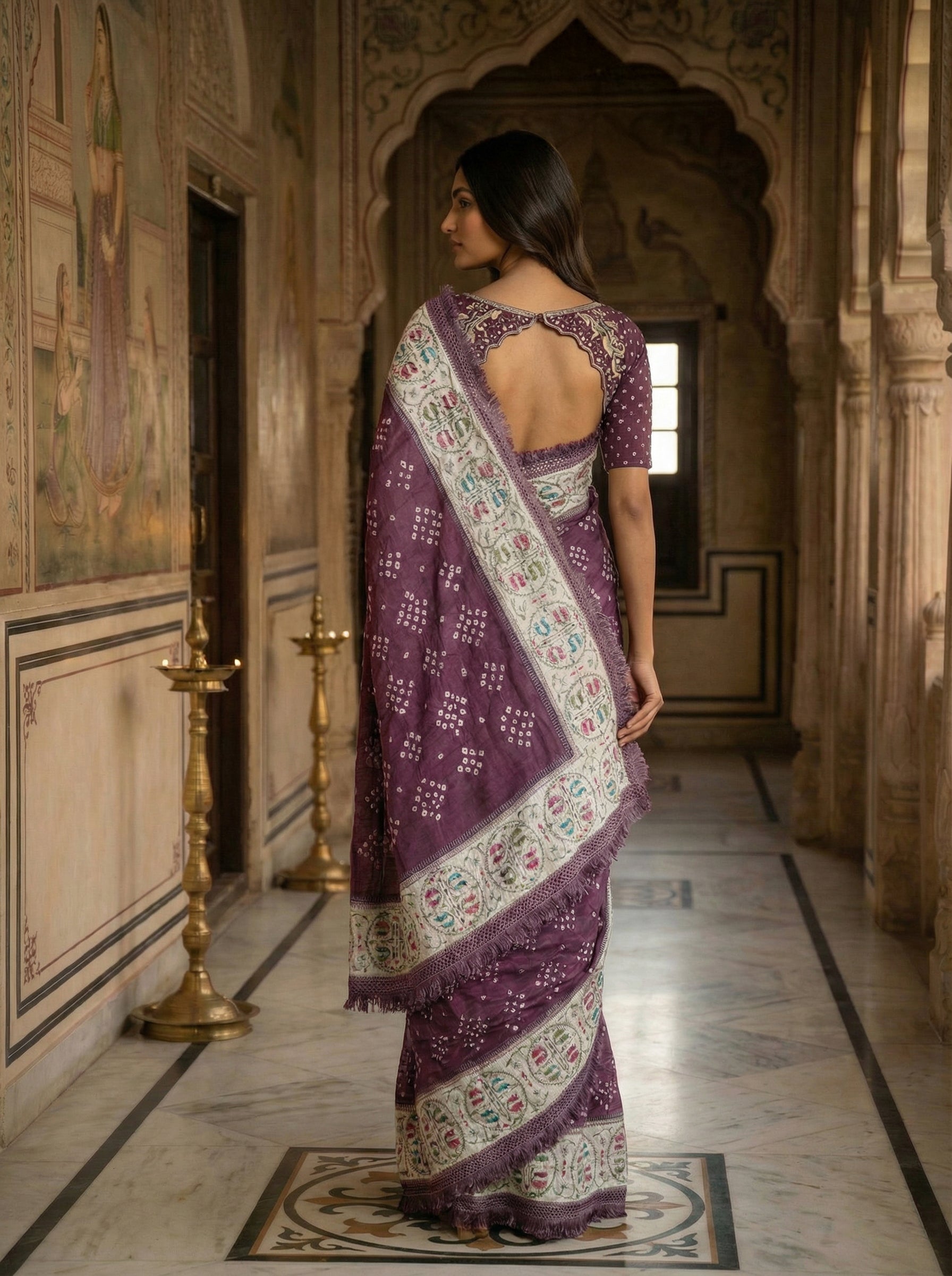 Elevate your ethnic wardrobe with this stunning grape purple saree, featuring an intricate white Bandhani design that adorns the entire body. The traditional tie-and-dye technique creates a mesmerizing pattern that celebrates timeless craftsmanship. Complemented by a crisp white printed border, this saree seamlessly blends classic elegance with contemporary appeal. Perfect for festive occasions, celebrations, and cultural events, this versatile piece offers the sophistication of authentic ethnic wear with refined aesthetic sensibility.