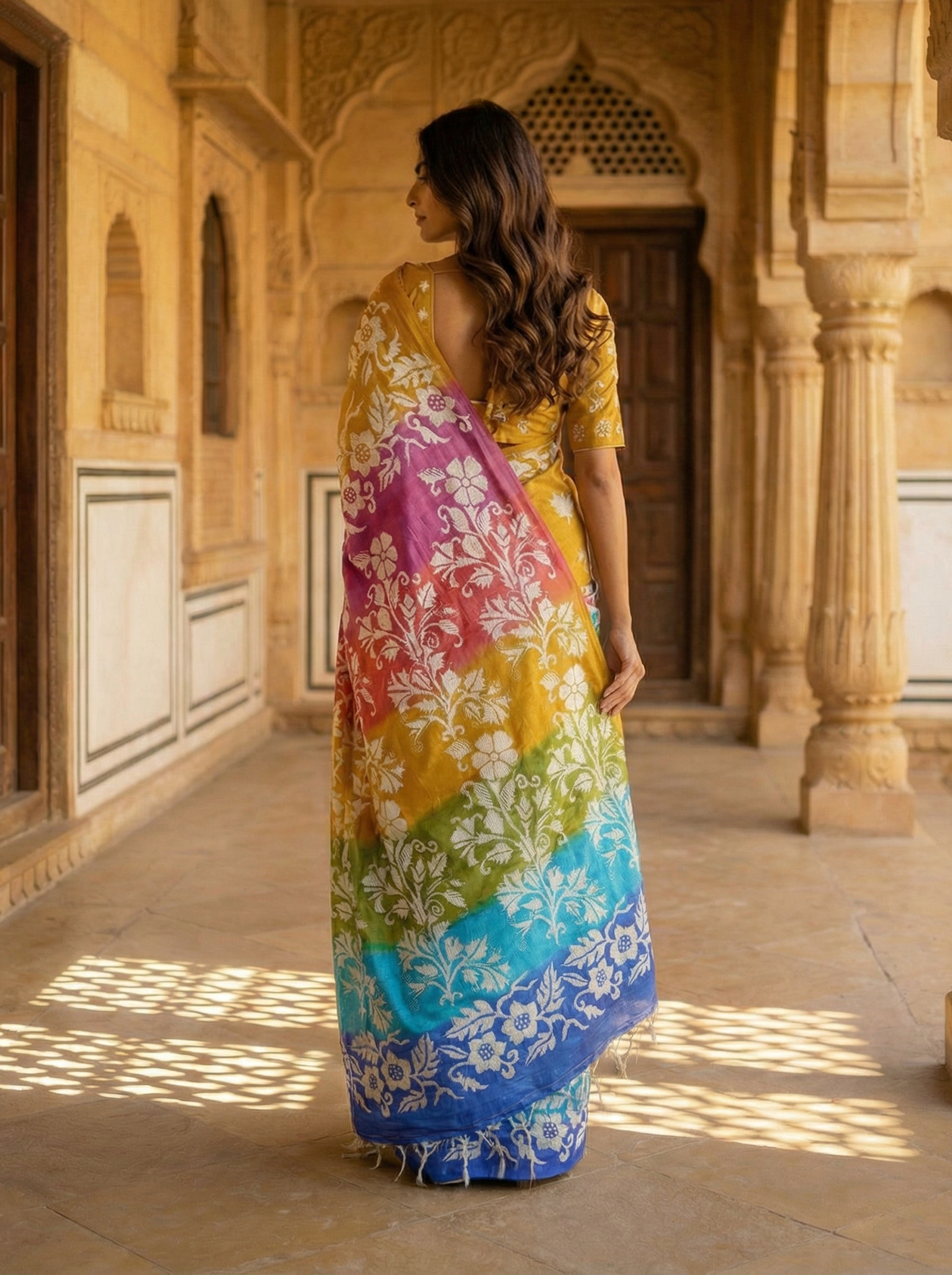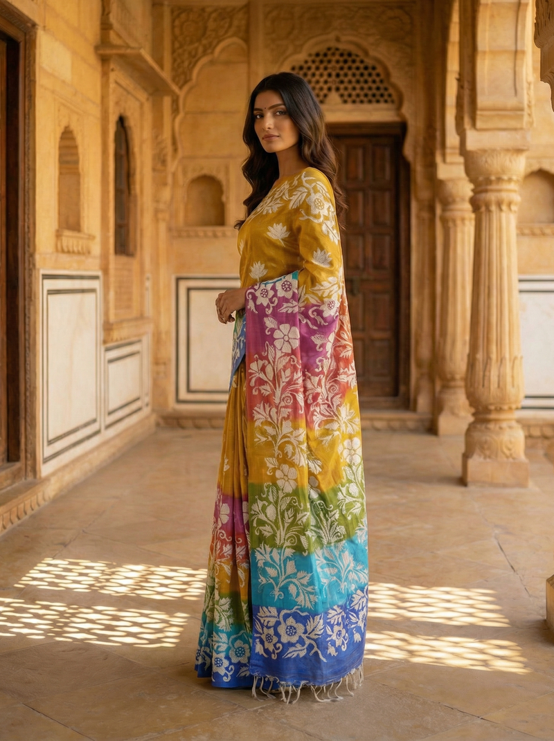 Elevate your ethnic wardrobe with this striking mustard yellow tussar silk saree, a timeless piece that seamlessly blends tradition with contemporary style. The fabric's natural texture and subtle sheen characteristic of tussar silk create an effortlessly elegant drape. Delicate white floral prints across the body add refined sophistication, while the multi-color printed border introduces vibrant visual interest and versatility. Perfect for festive occasions, celebrations, or refined everyday wear, this saree pairs beautifully with traditional jewelry and classic styling. The breathable tussar silk ensures comfort throughout the day, making it an investment piece for the discerning wearer who values both aesthetics and quality craftsmanship.