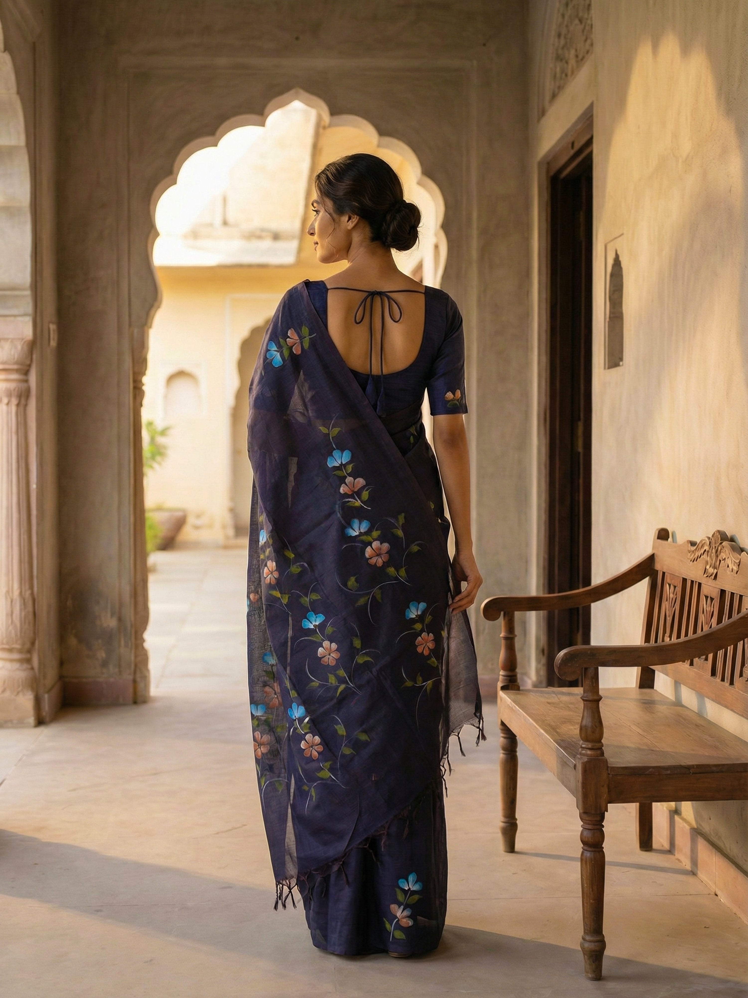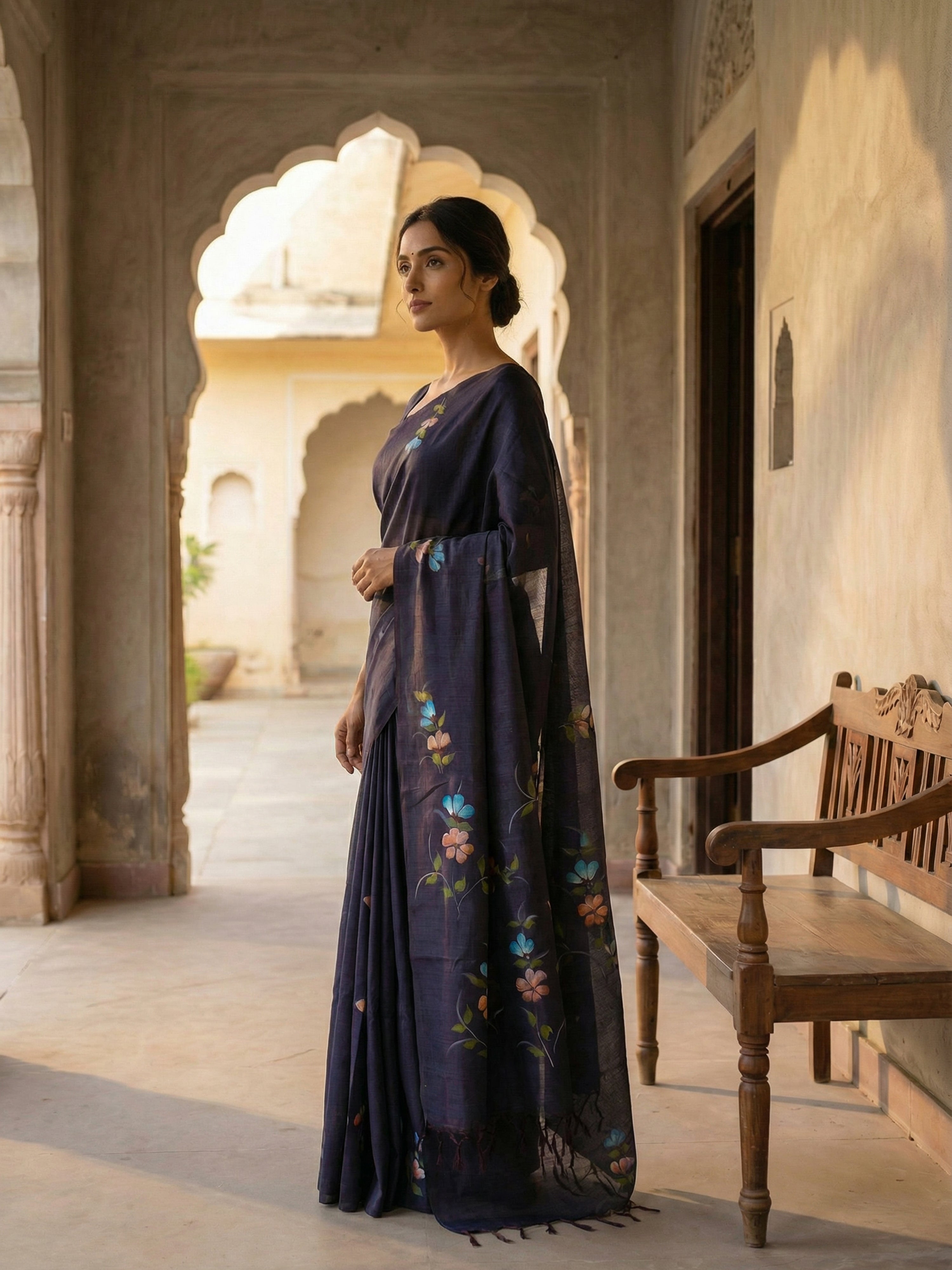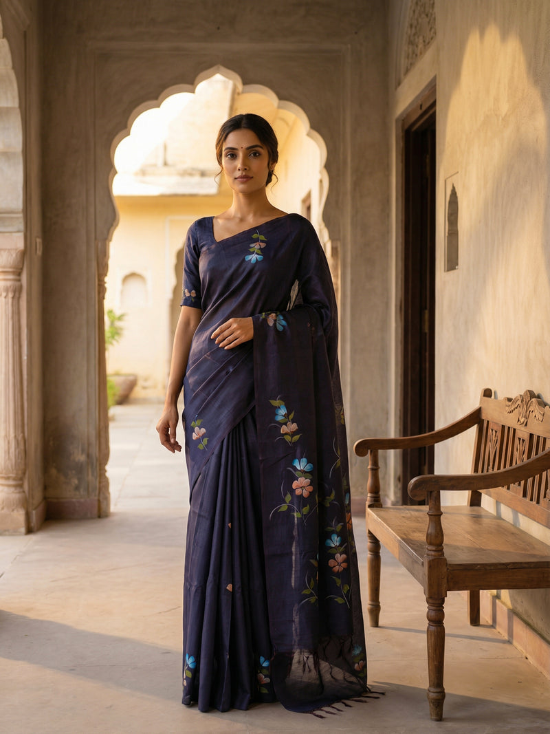 Navy Blue Floral Designed Borderless Semi Tussar Saree Elevate your ethnic wardrobe with this sophisticated navy blue semi tussar saree, distinguished by its exquisite floral design and borderless construction. The semi tussar fabric offers a refined blend of durability and graceful drape, making it ideal for both festive occasions and formal gatherings. The intricate floral motifs in complementary hues create visual depth against the rich navy base, while the borderless styling provides a contemporary, minimalist aesthetic. This versatile piece transitions seamlessly from traditional celebrations to modern events, delivering timeless elegance with understated luxury. Perfect for those who appreciate refined craftsmanship and understated sophistication in their saree collection.