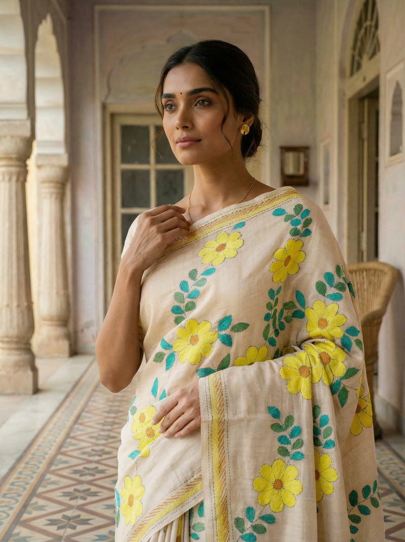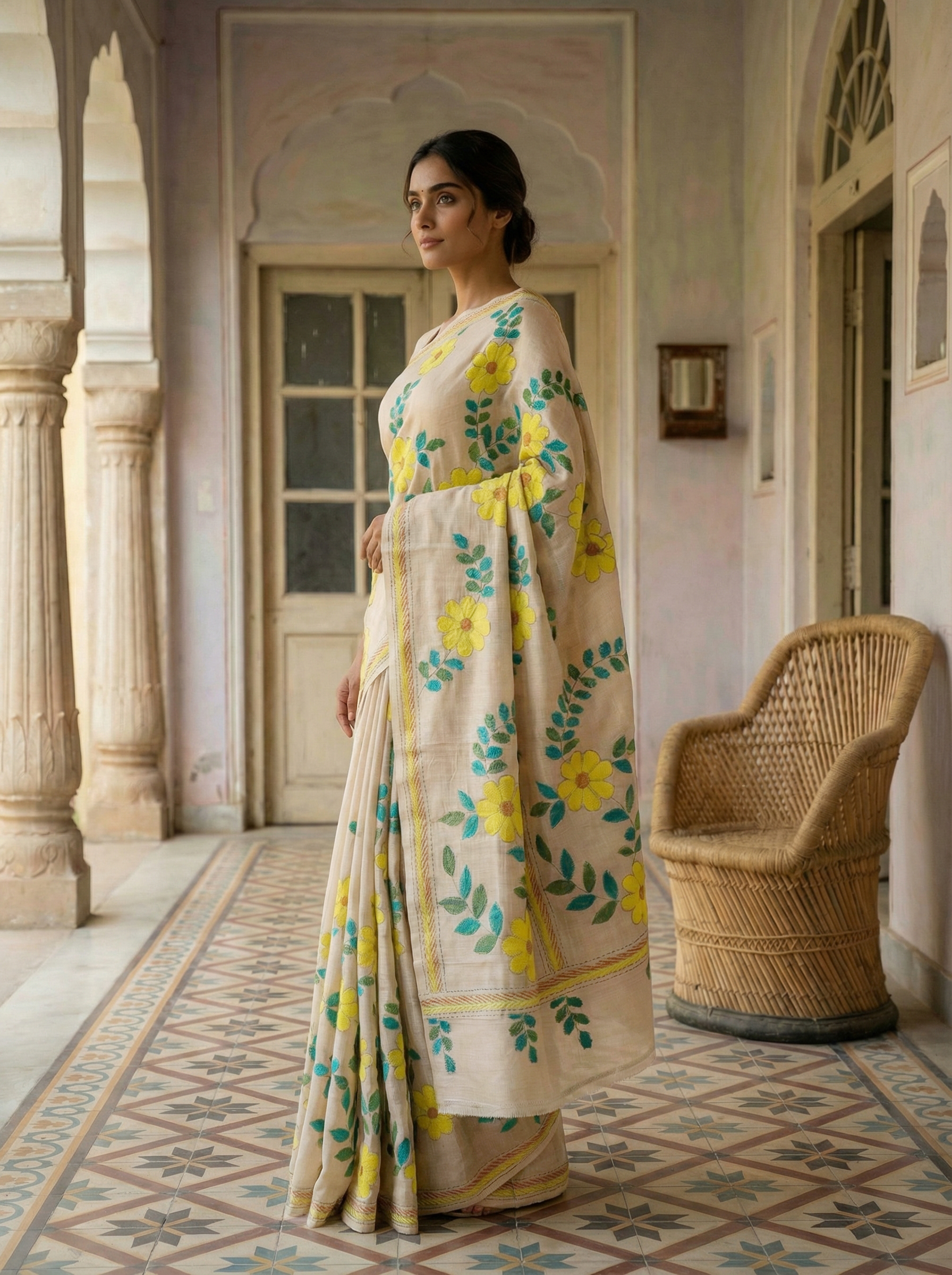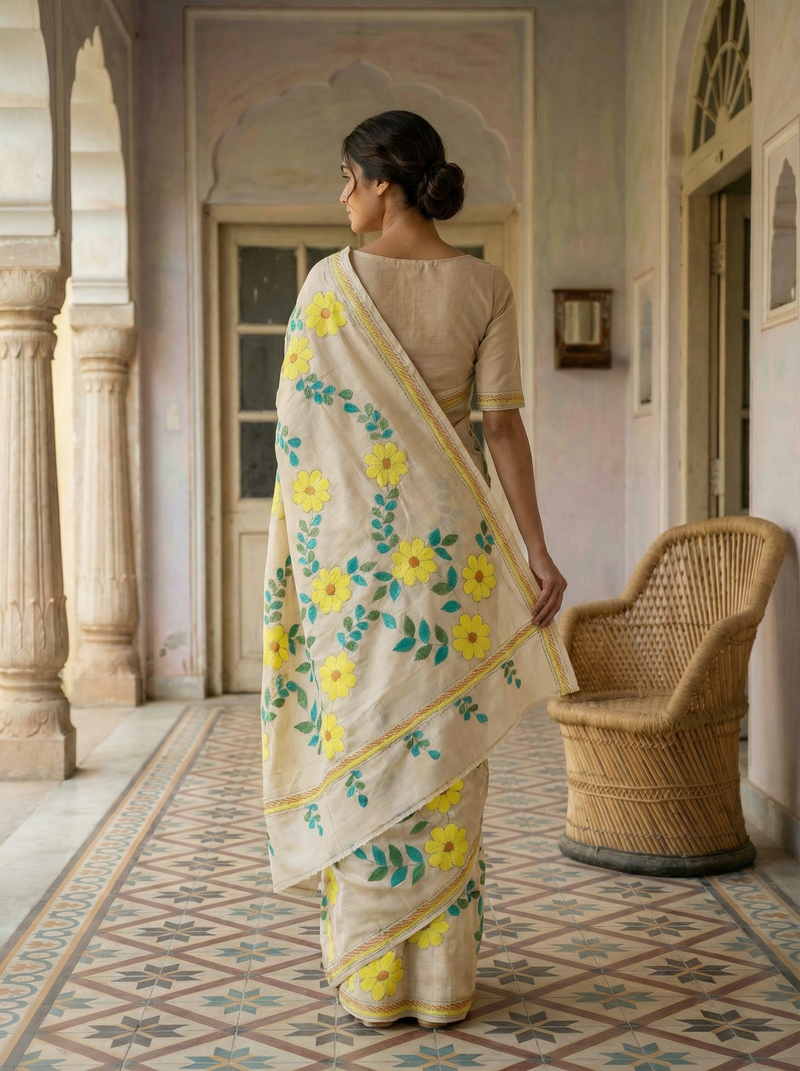 Ivory Tussar Silk Saree With Yellow Floral Printed Design