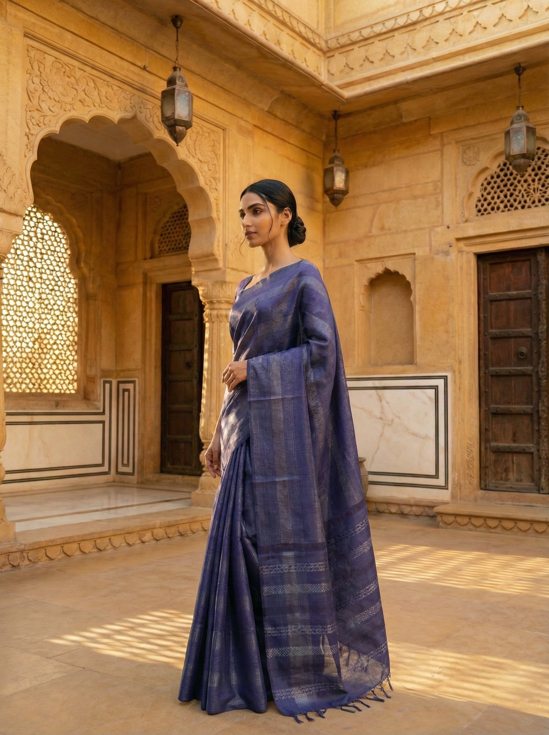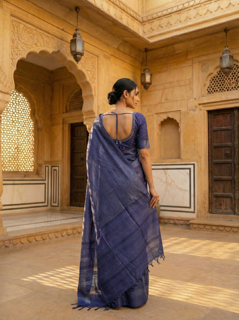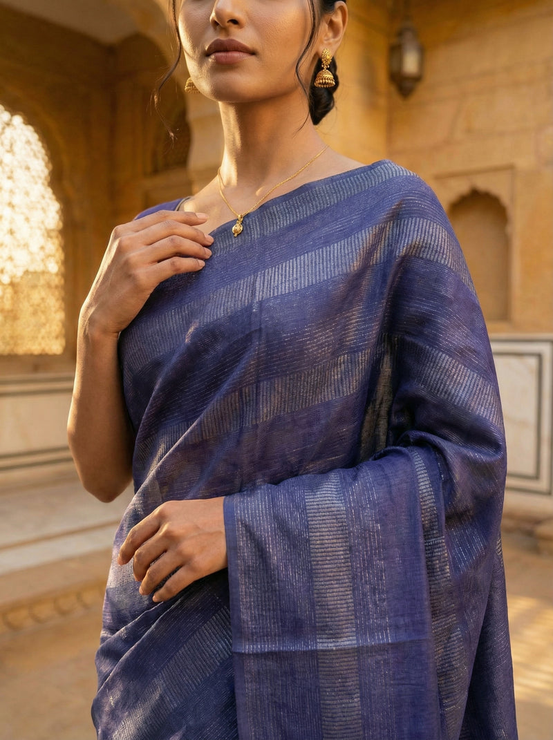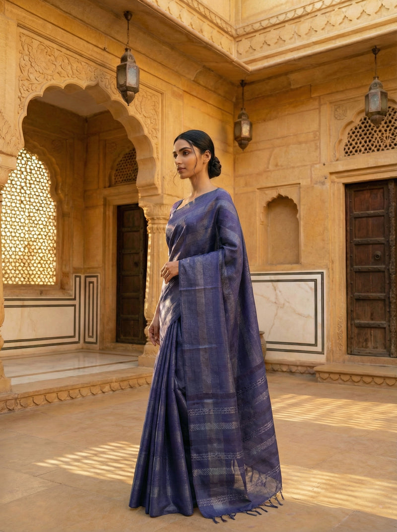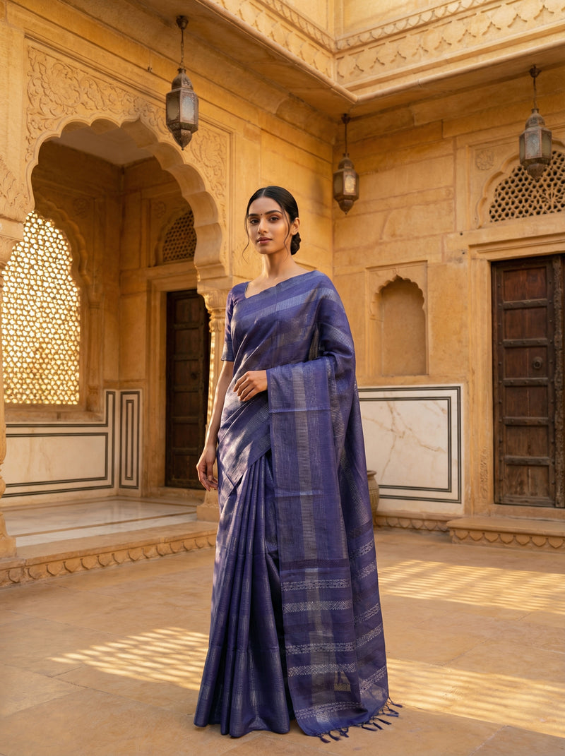 Elevate your ethnic wardrobe with this exquisite Blue Silver Striped Borderless Tussar Silk Saree, a masterpiece of refined craftsmanship. Woven from premium tussar silk, this saree features elegant silver stripes throughout, creating a sophisticated visual rhythm. The borderless design offers a contemporary silhouette while maintaining traditional appeal. The pallu showcases intricate silver sequin work on striped detailing, adding a touch of glamour perfect for festive occasions and celebrations. The natural texture of tussar silk ensures breathability and comfort, making it ideal for Indian summers. This versatile piece seamlessly transitions from formal events to special gatherings, embodying timeless elegance with modern sensibilities.