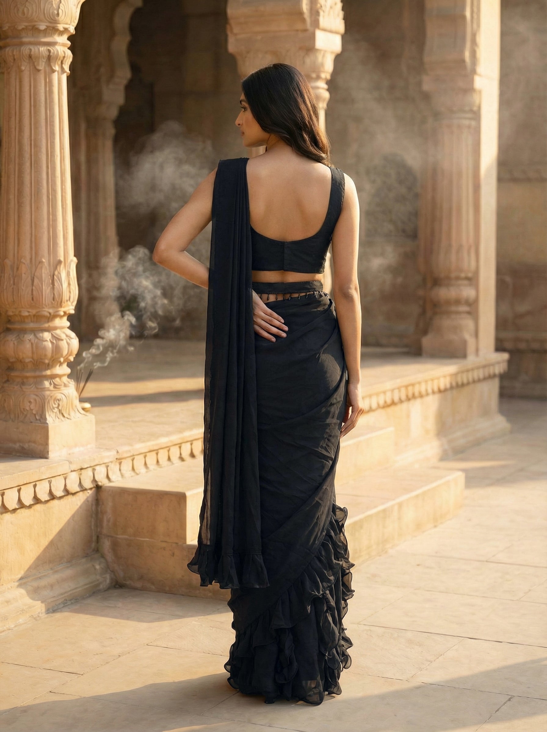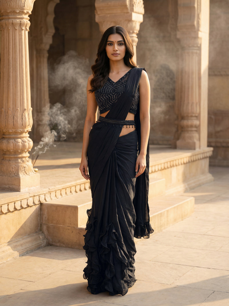 Black Flared Ready To Wear Saree With V Necked Blouse