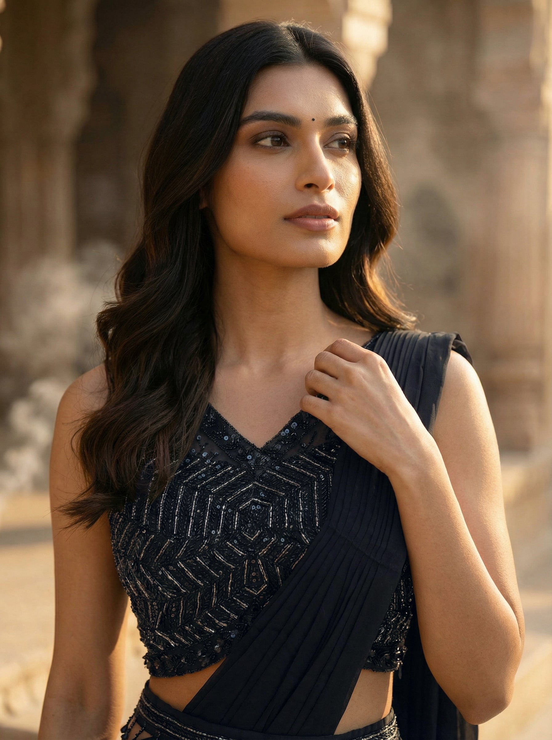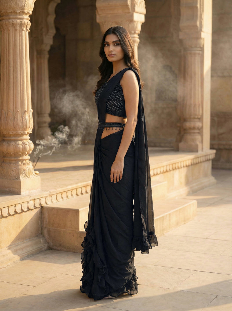Black Flared Ready To Wear Saree With V Necked Blouse Elevate your ethnic wardrobe with this sophisticated black flared saree, expertly crafted for modern convenience. The ready-to-wear design eliminates styling complexity, allowing you to transition seamlessly from day to evening occasions. Intricate beadwork adorns the fabric, adding dimensional elegance and visual depth. The accompanying V-necked black blouse complements the saree's silhouette while offering a flattering neckline that enhances your features. Perfect for weddings, celebrations, or formal gatherings, this piece combines traditional craftsmanship with contemporary ease of wear.