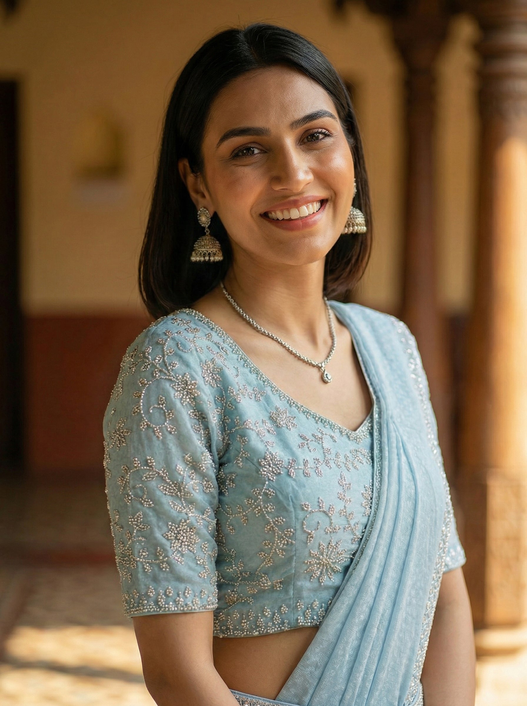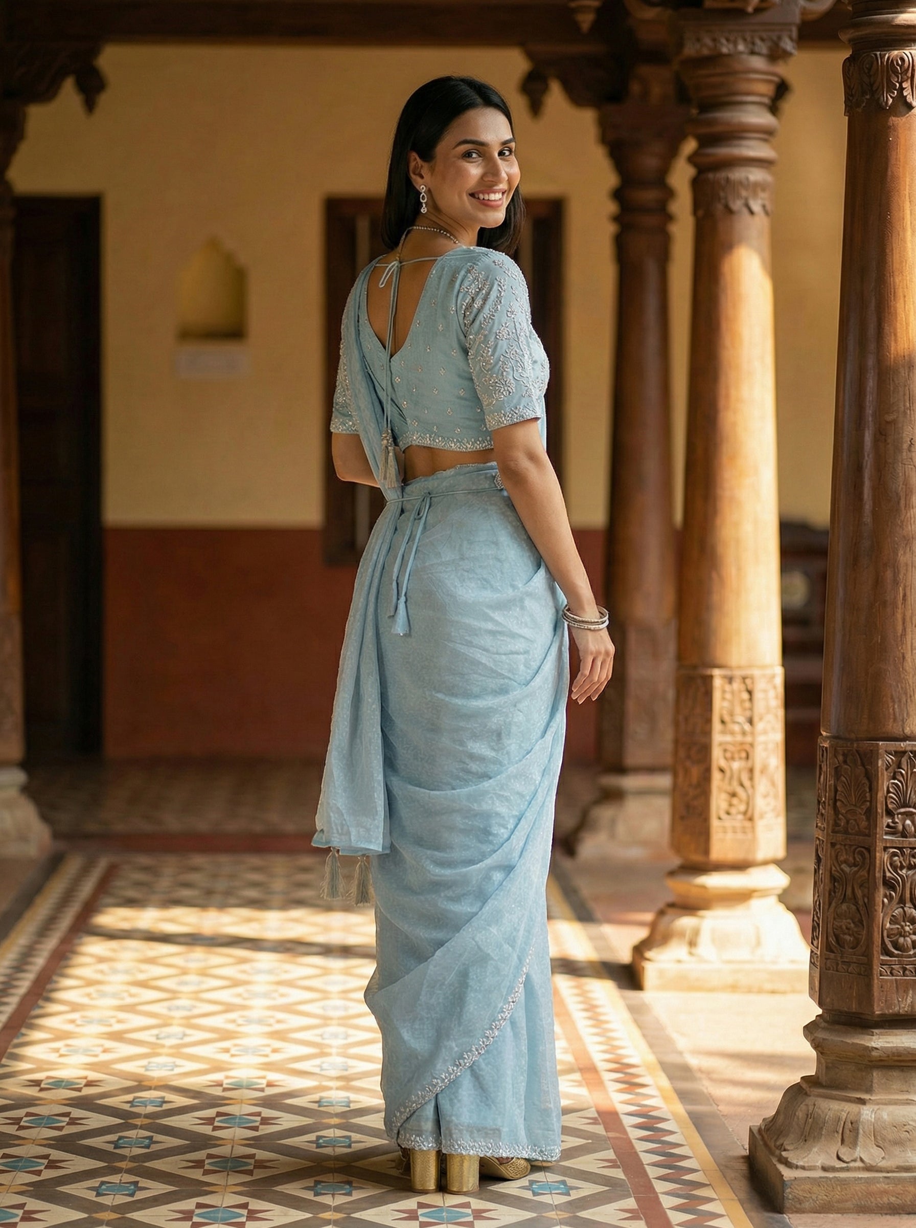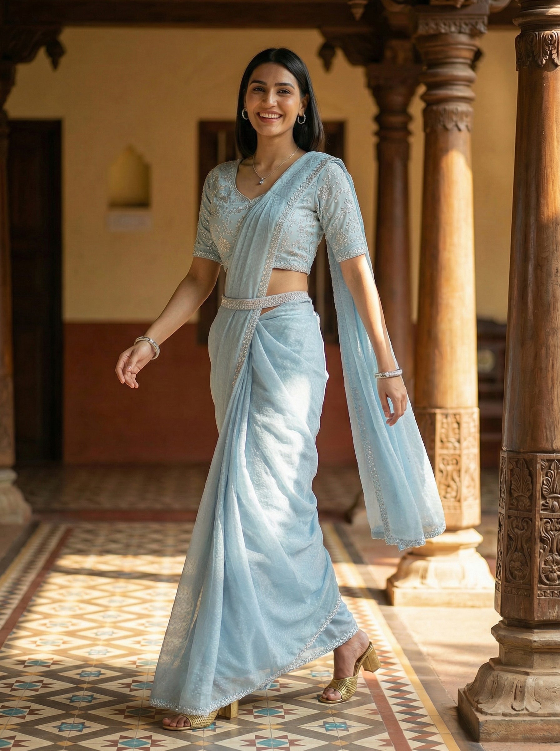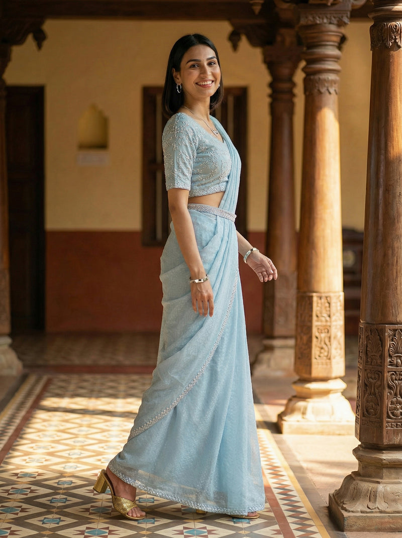 Elevate your festive wardrobe with this stunning sky blue satin saree, expertly crafted for the modern woman. The luxurious satin fabric drapes beautifully, while intricate stone embellishments add sophisticated glamour to every occasion. This ready-to-wear saree comes complete with a stylish matching blouse, eliminating the need for separate tailoring. Perfect for weddings, celebrations, and special events, it combines traditional elegance with contemporary design. The rich sky blue hue complements all skin tones, making it a versatile choice for your ethnic collection. Slip into effortless grace and confidence with this timeless piece.