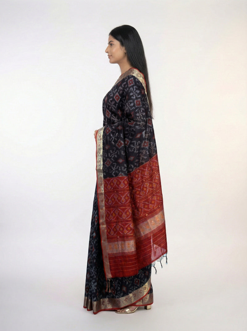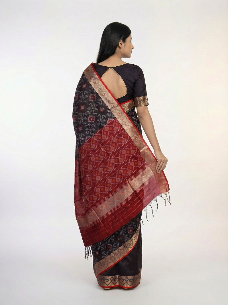 Semi Silk Black Saree with Contrast Maroon Ikat Pallu & Plain Border Blouse