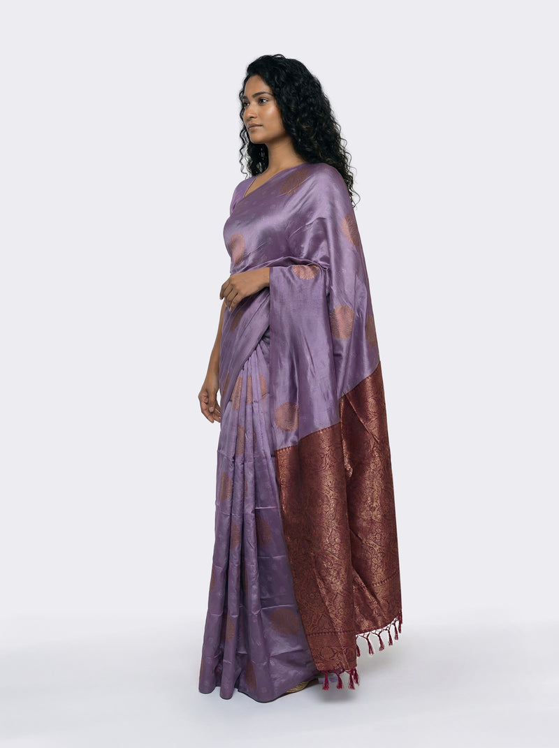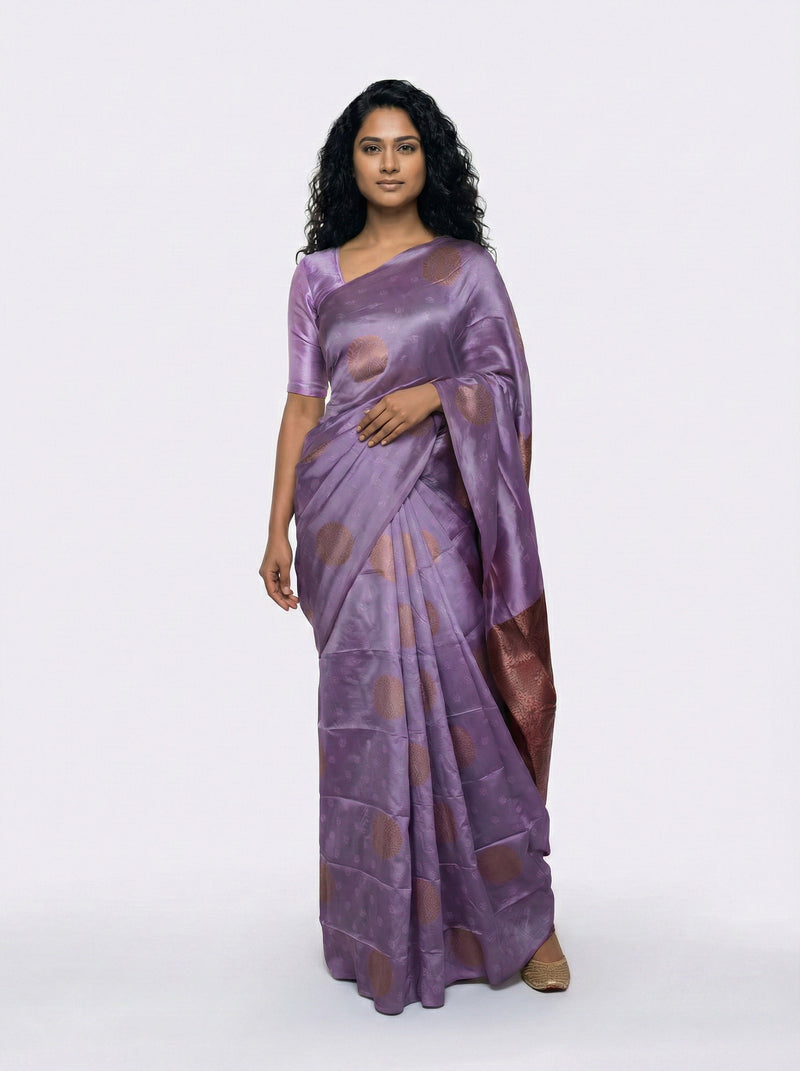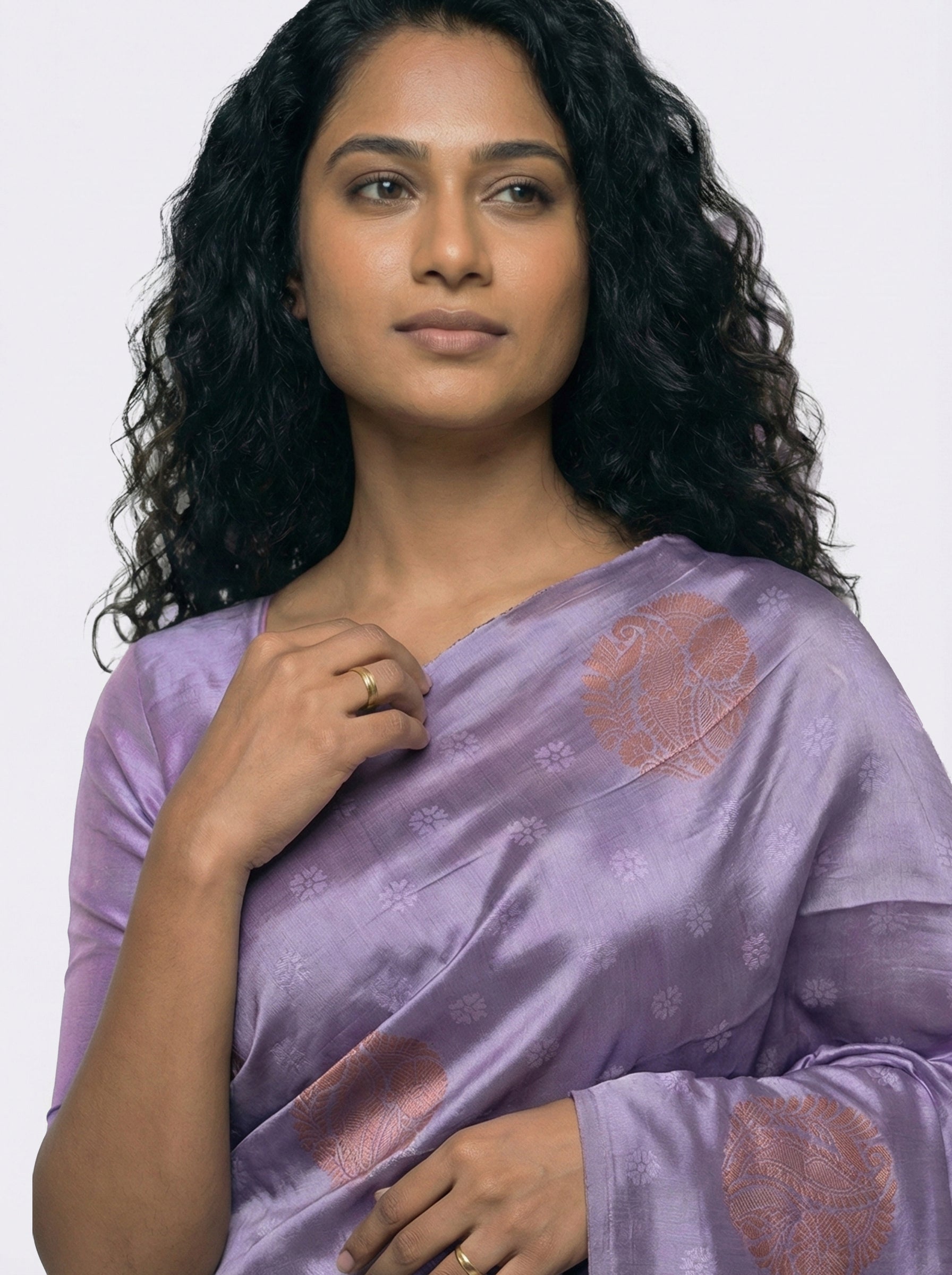 Experience timeless elegance with this Semi Silk Classic Lavender Saree, adorned with delicate small buttas that add subtle sophistication. The luxurious semi-silk fabric drapes beautifully, offering comfort and a graceful silhouette perfect for traditional occasions, festivals, and celebrations. The soft lavender hue complements all skin tones, while the intricate butta detailing showcases traditional craftsmanship. An essential addition to your ethnic wardrobe that effortlessly transitions from daytime gatherings to evening events.
