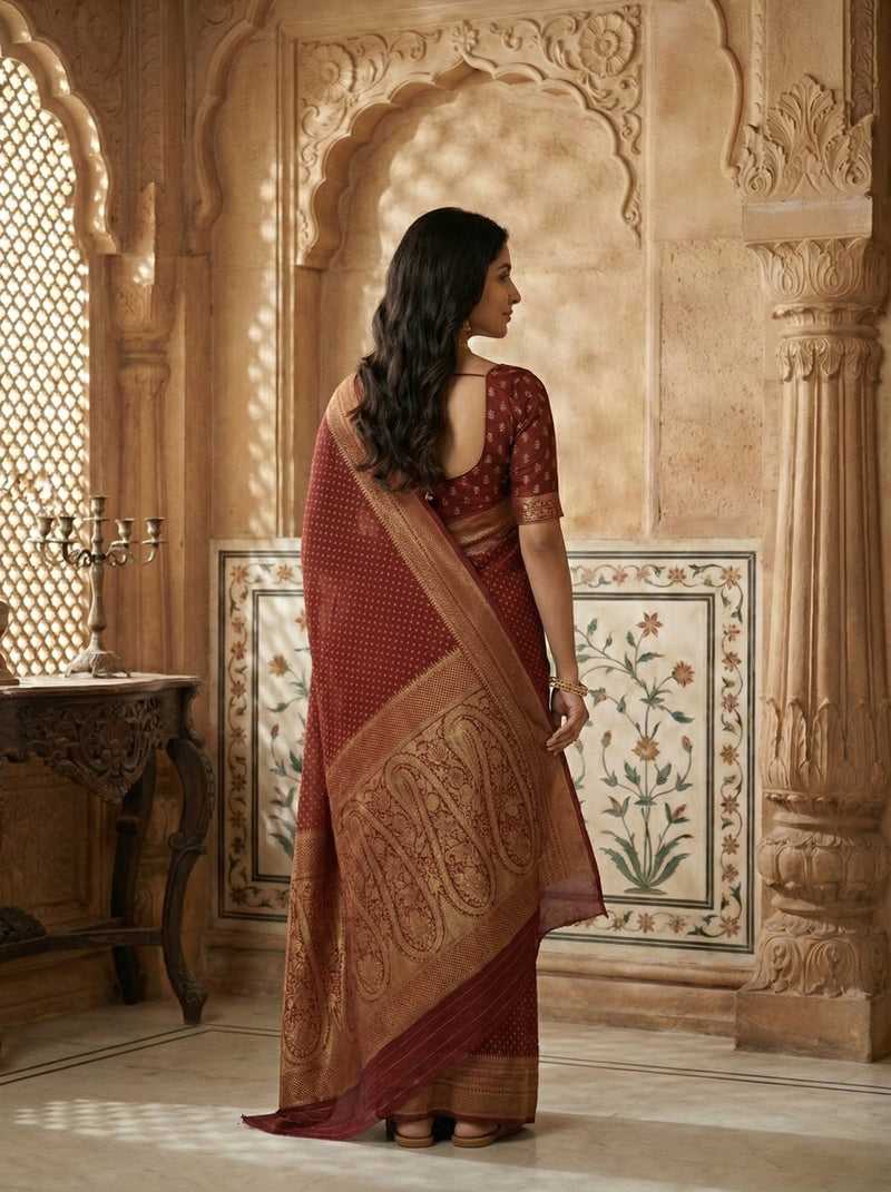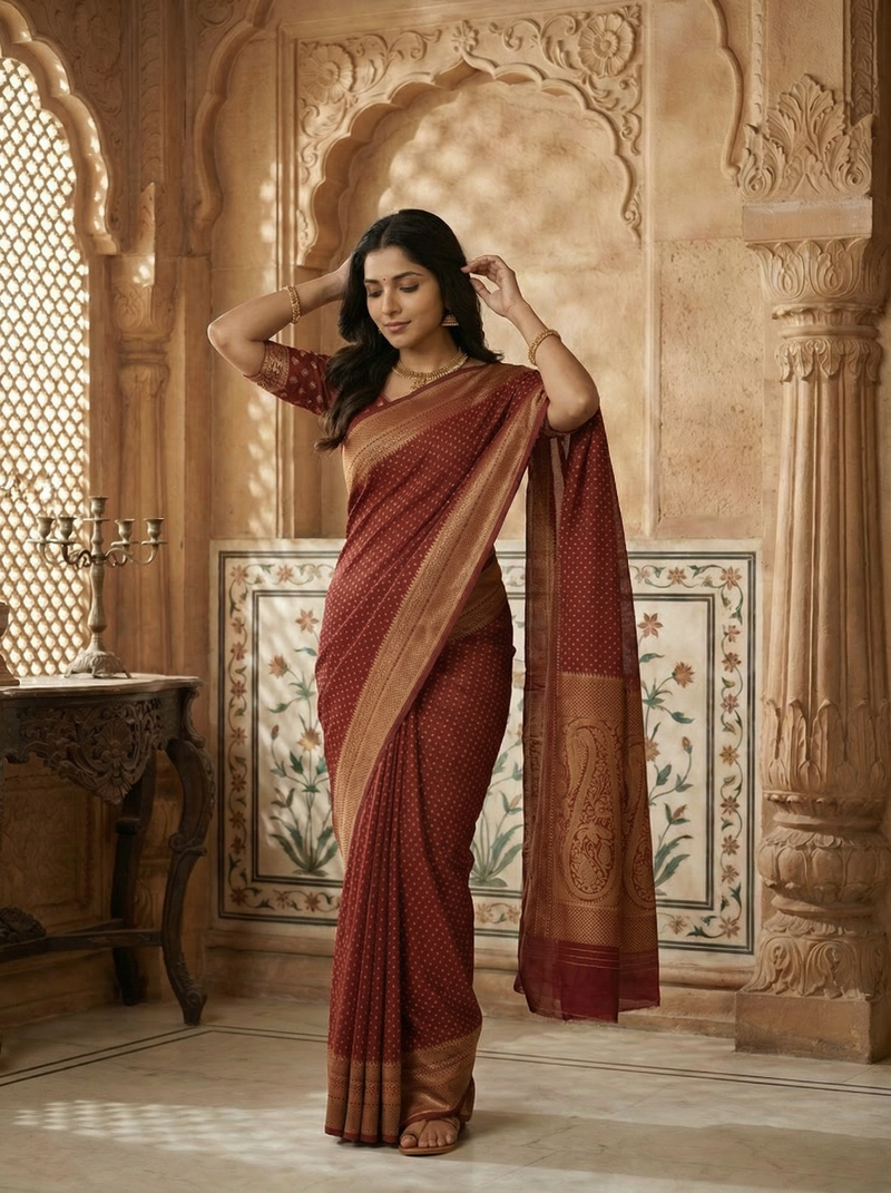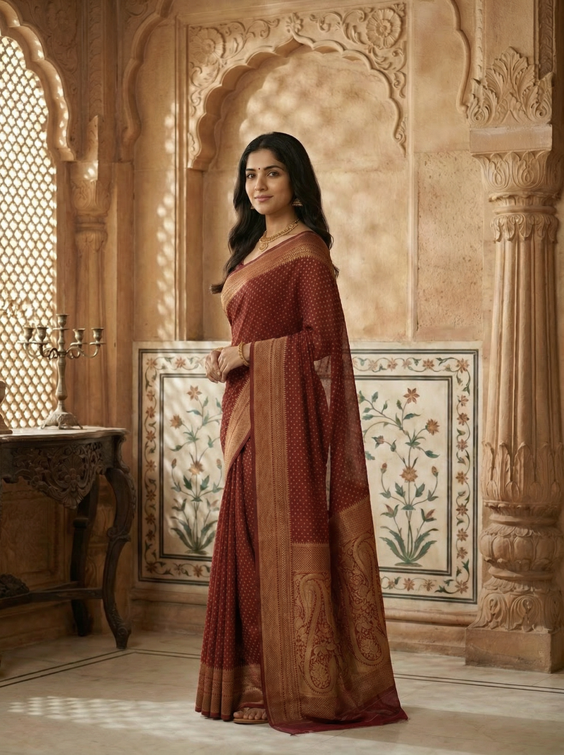 Georgette Banarasi Dark Maroon Rich Zari Border Saree