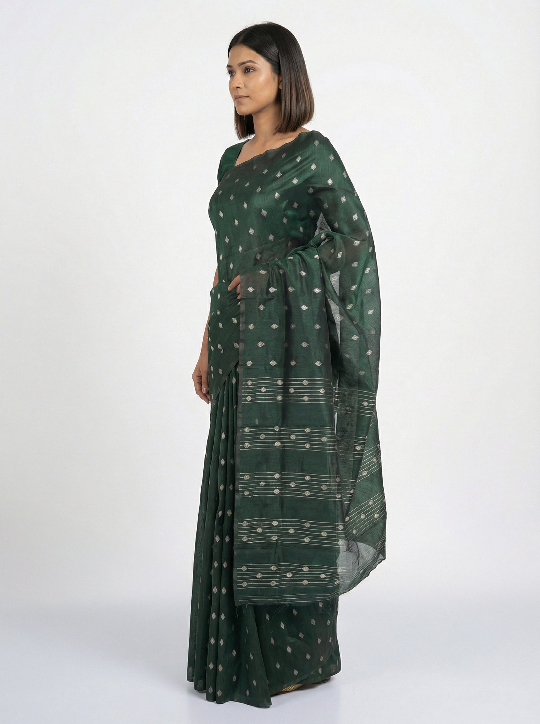 Perfect for those who appreciate classic elegance with contemporary styling, this saree is a versatile addition to any collection. The bottle green color is timeless and flattering, while the detailed work ensures you stand out with understated grace.
