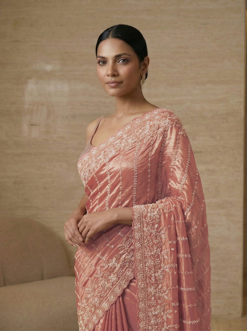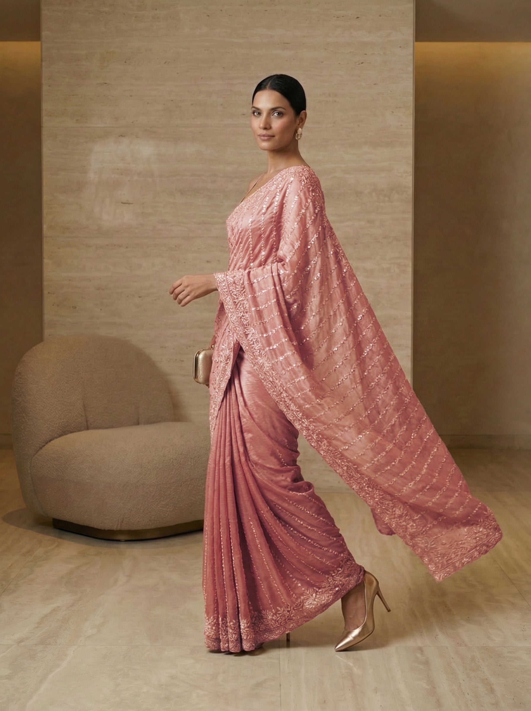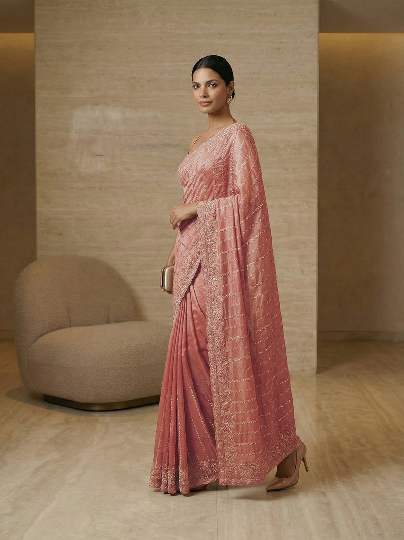 Organza Dusty Rose Pink Zari Stripe Designer Saree