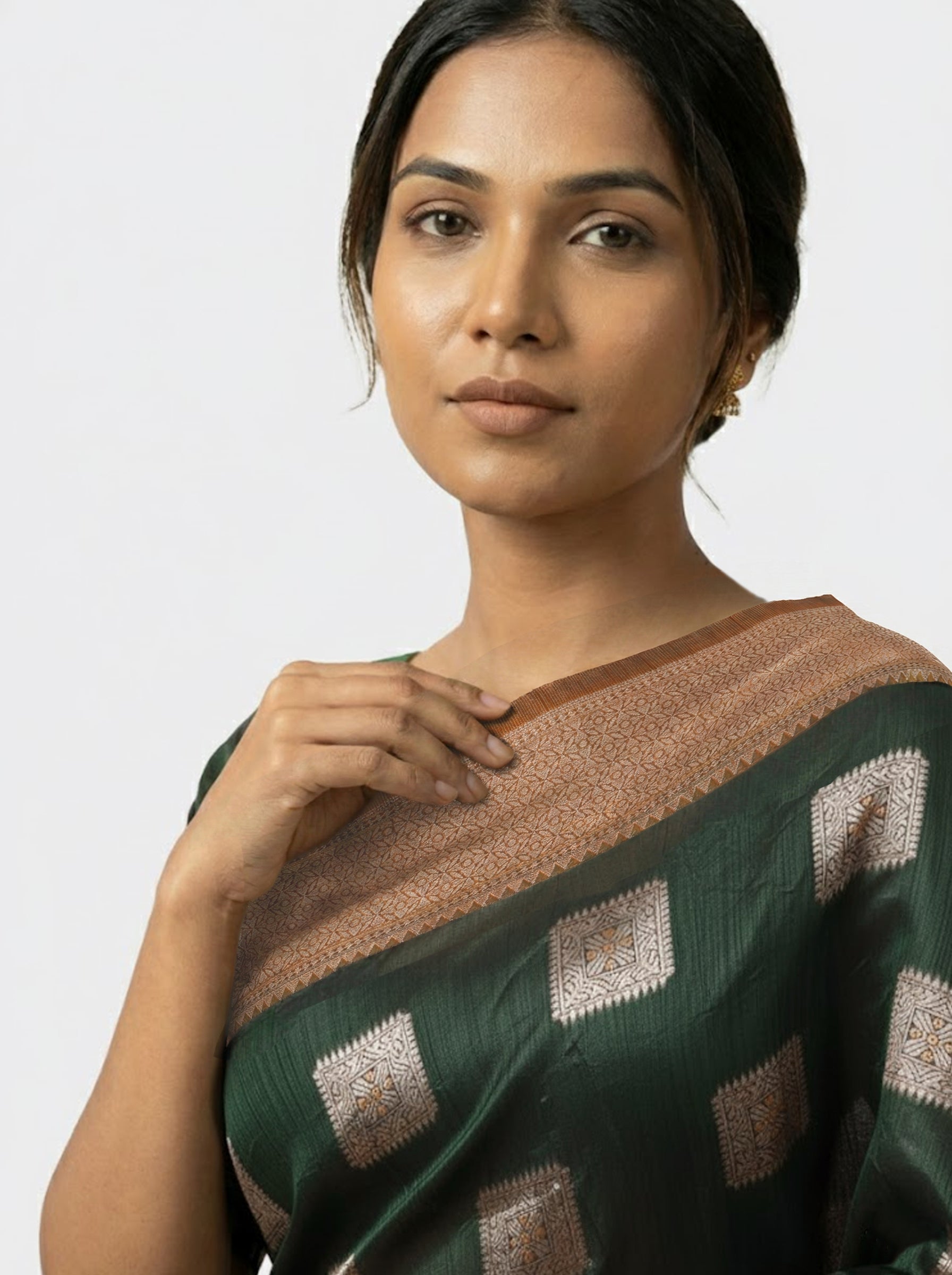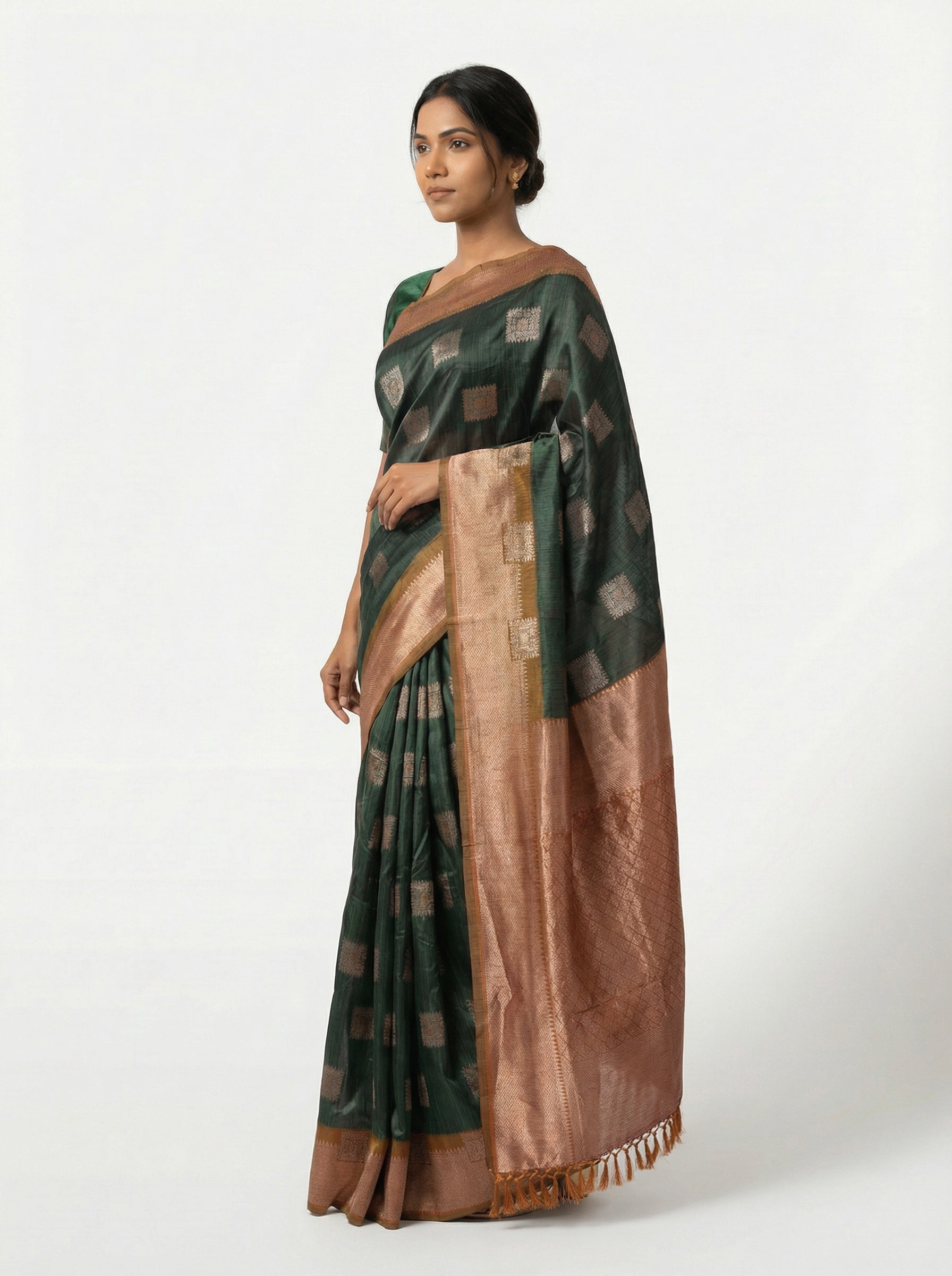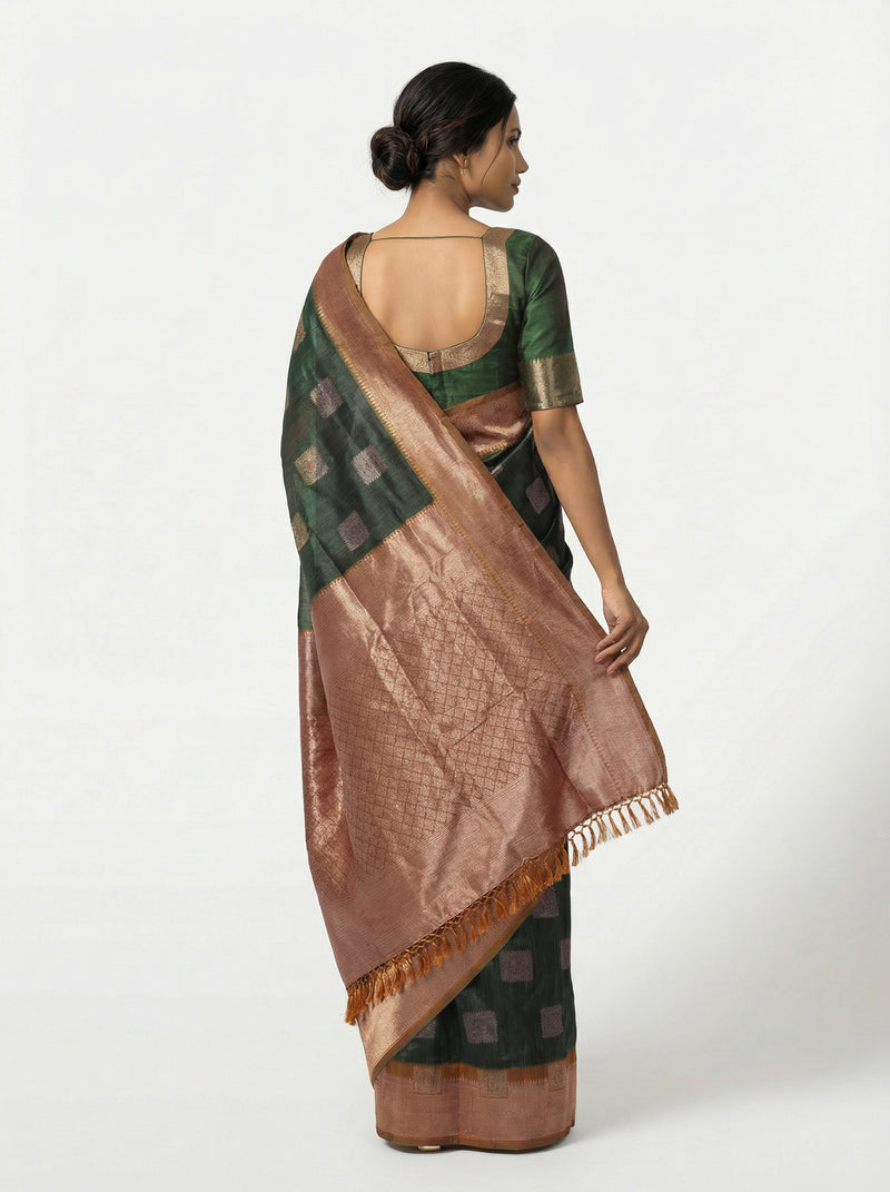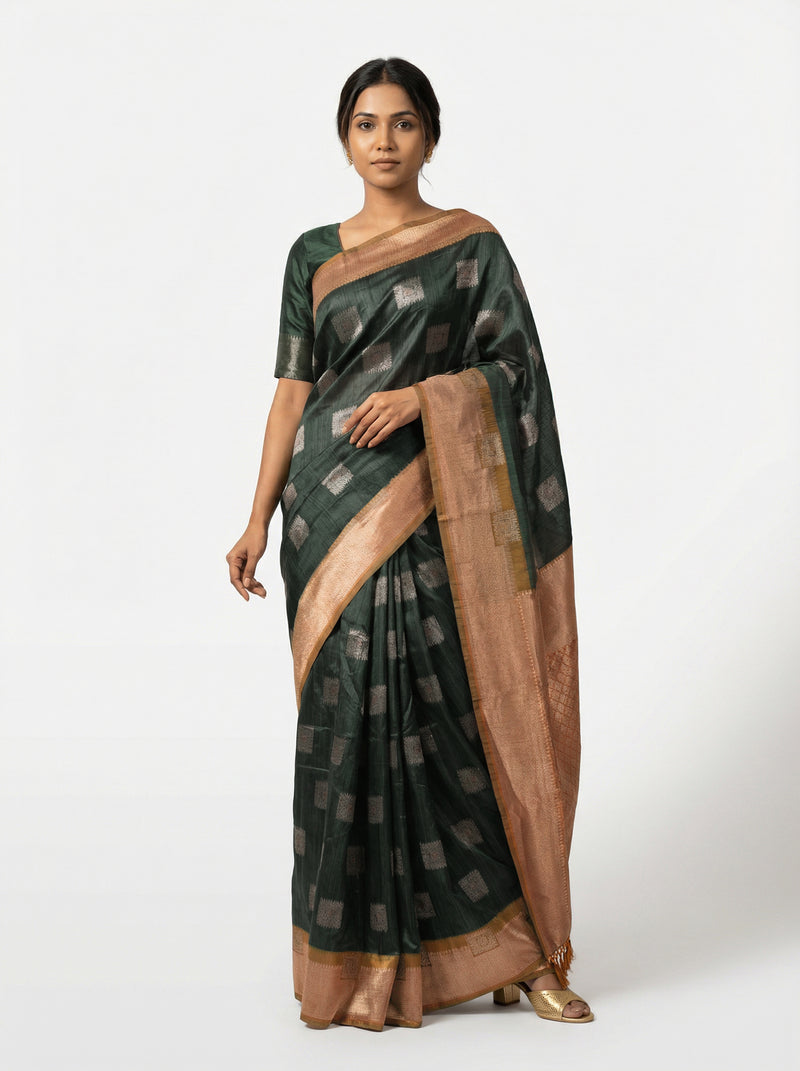 Drape yourself in timeless elegance with this stunning semi-silk saree in rich bottle green. The sophisticated modern box pattern adds contemporary flair to a classic silhouette, making it perfect for festive occasions, celebrations, or formal gatherings. The luxurious semi-silk fabric offers a graceful drape with a subtle sheen, ensuring comfort throughout the day. This versatile piece seamlessly blends traditional craftsmanship with modern design sensibilities, making it an essential addition to your ethnic wardrobe.