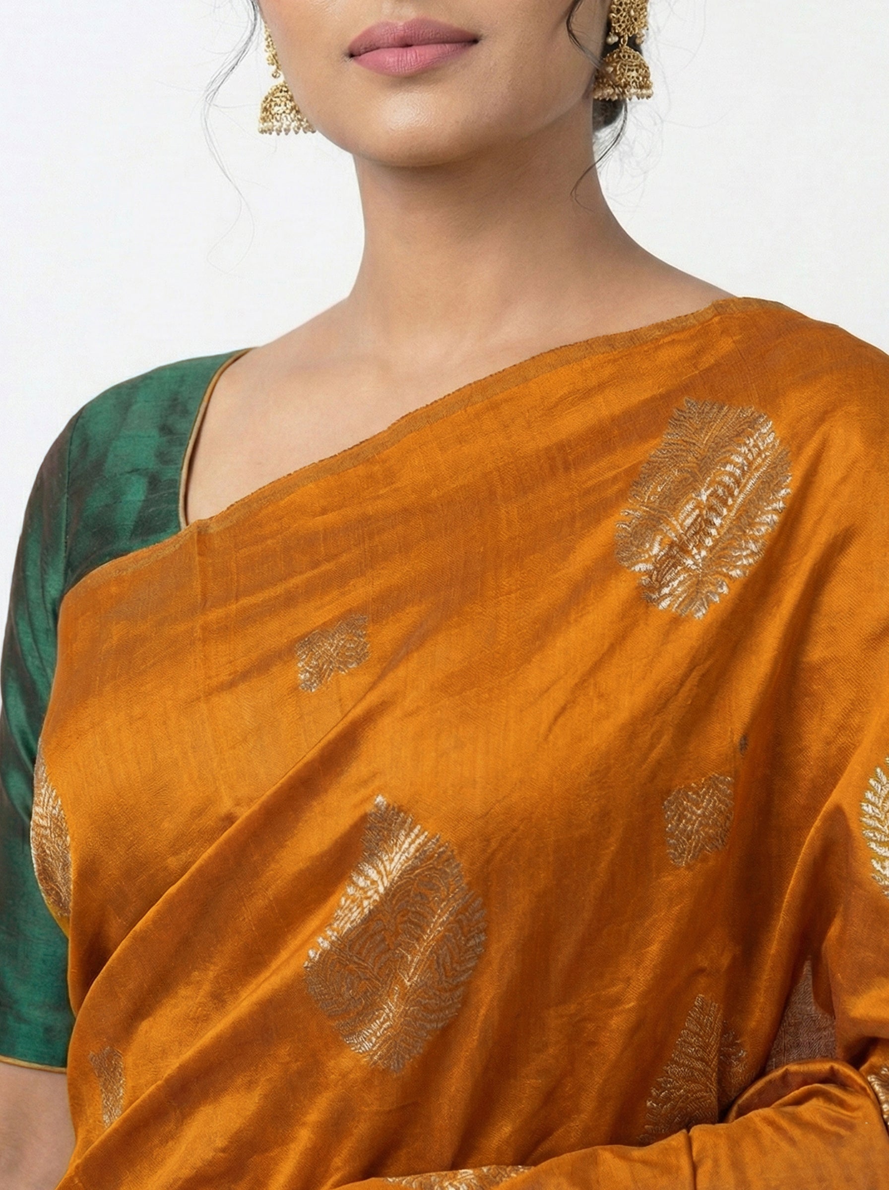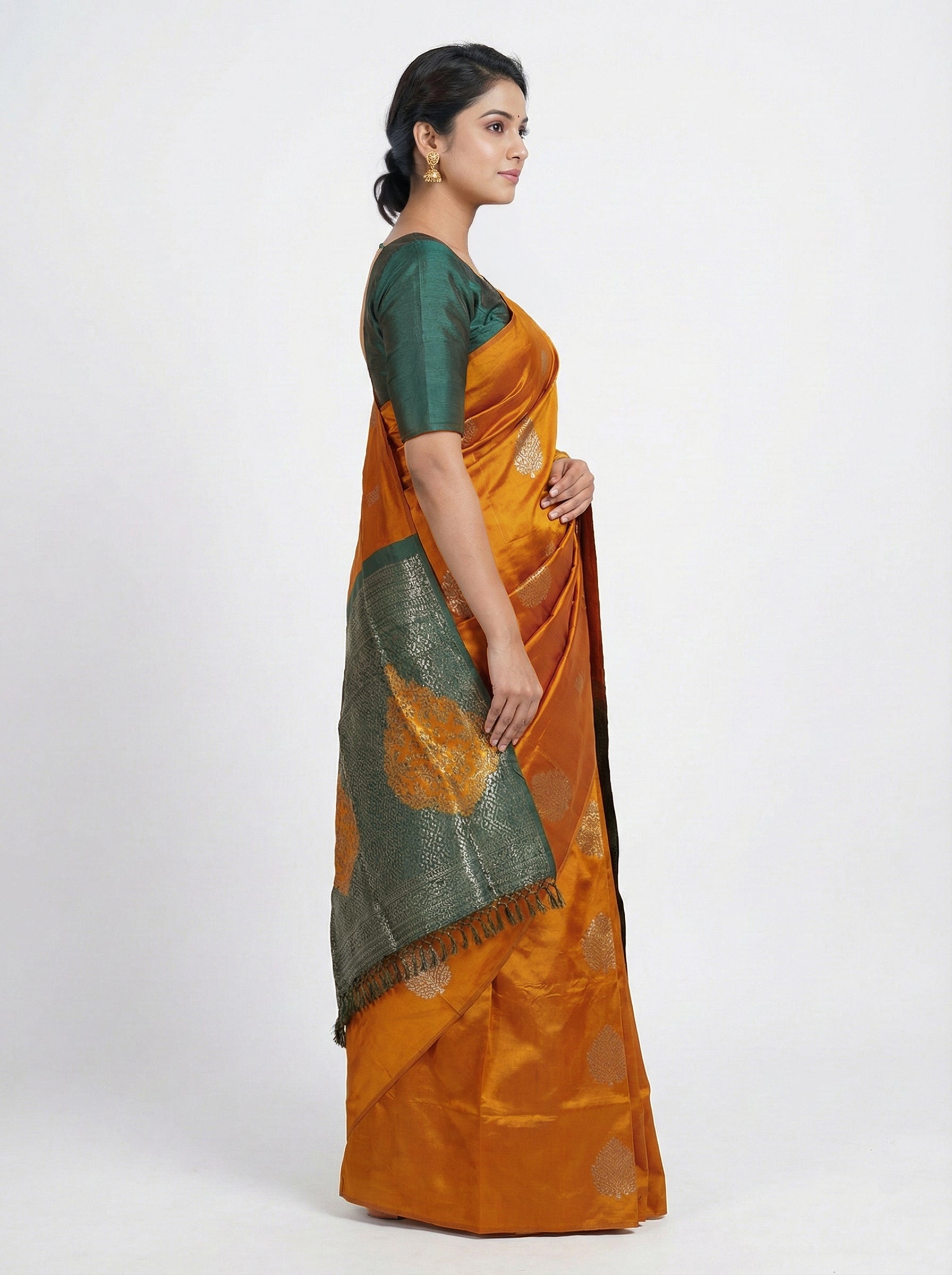 Semi Silk Elegant Mustard Saree with Contrast Green Brocade Blouse