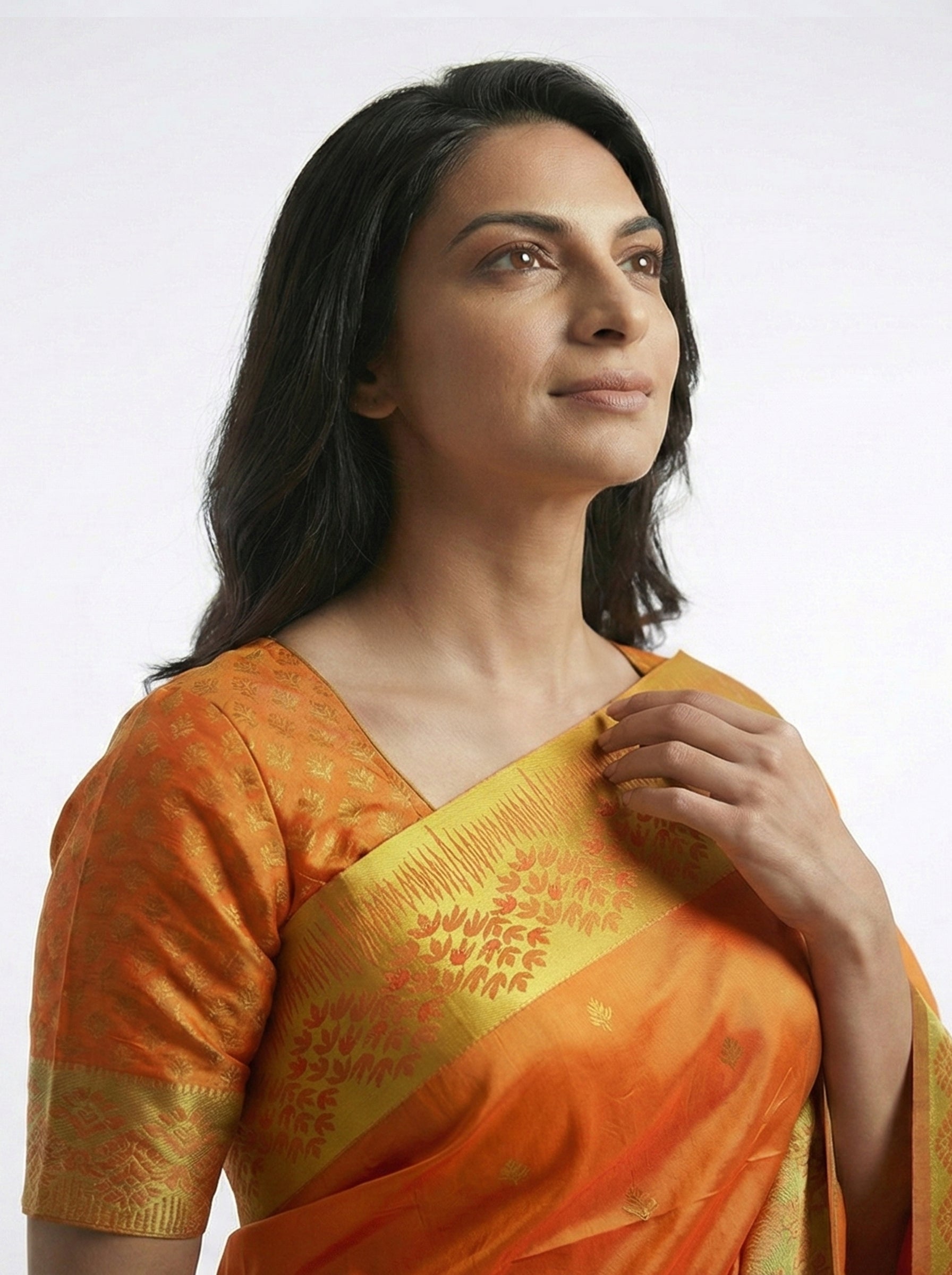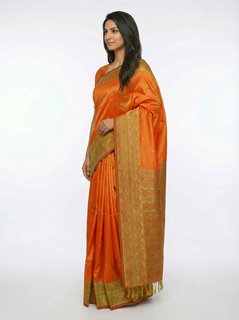 Make a radiant statement at your next celebration with this fire yellow semi-silk saree. Crafted from premium semi-silk fabric, it combines comfort with elegance, featuring exquisite designer buttas that showcase traditional artistry. The rich yellow hue complements all skin tones, while the fluid drape creates a flattering silhouette. Whether attending weddings, festivals, or formal gatherings, this versatile saree brings sophistication and charm to your ethnic collection.