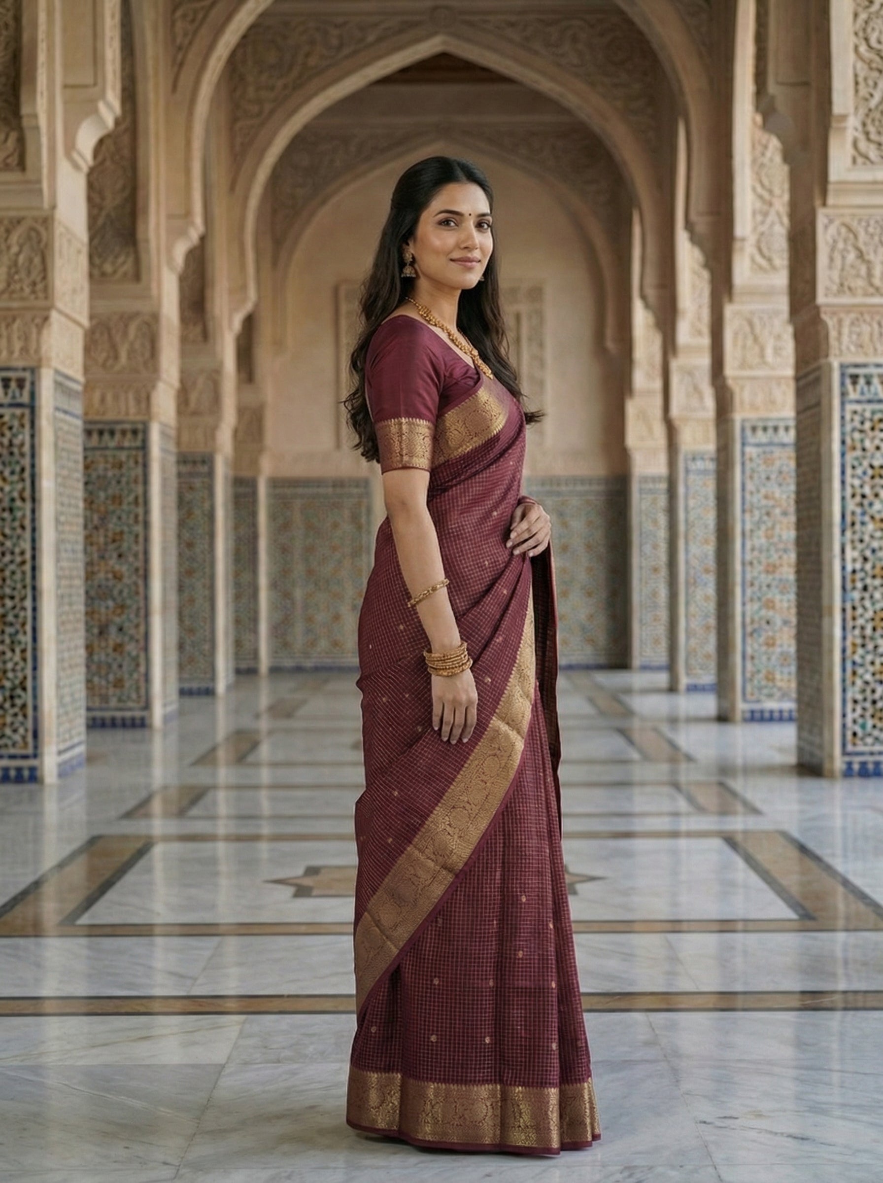 Experience the magnificence of this Banarasi georgette saree in luxurious maroon, embellished with delicate gold zari butta patterns that showcase centuries-old weaving traditions. The richly adorned border frames the saree with regal splendor, perfect for weddings, festivals, and momentous celebrations. Crafted from lightweight georgette, this saree offers effortless draping and all-day comfort without compromising on elegance. Each intricate zari detail reflects the artistry of master weavers, creating a piece that seamlessly blends heritage craftsmanship with sophisticated style. An investment in timeless beauty for the discerning wearer.
